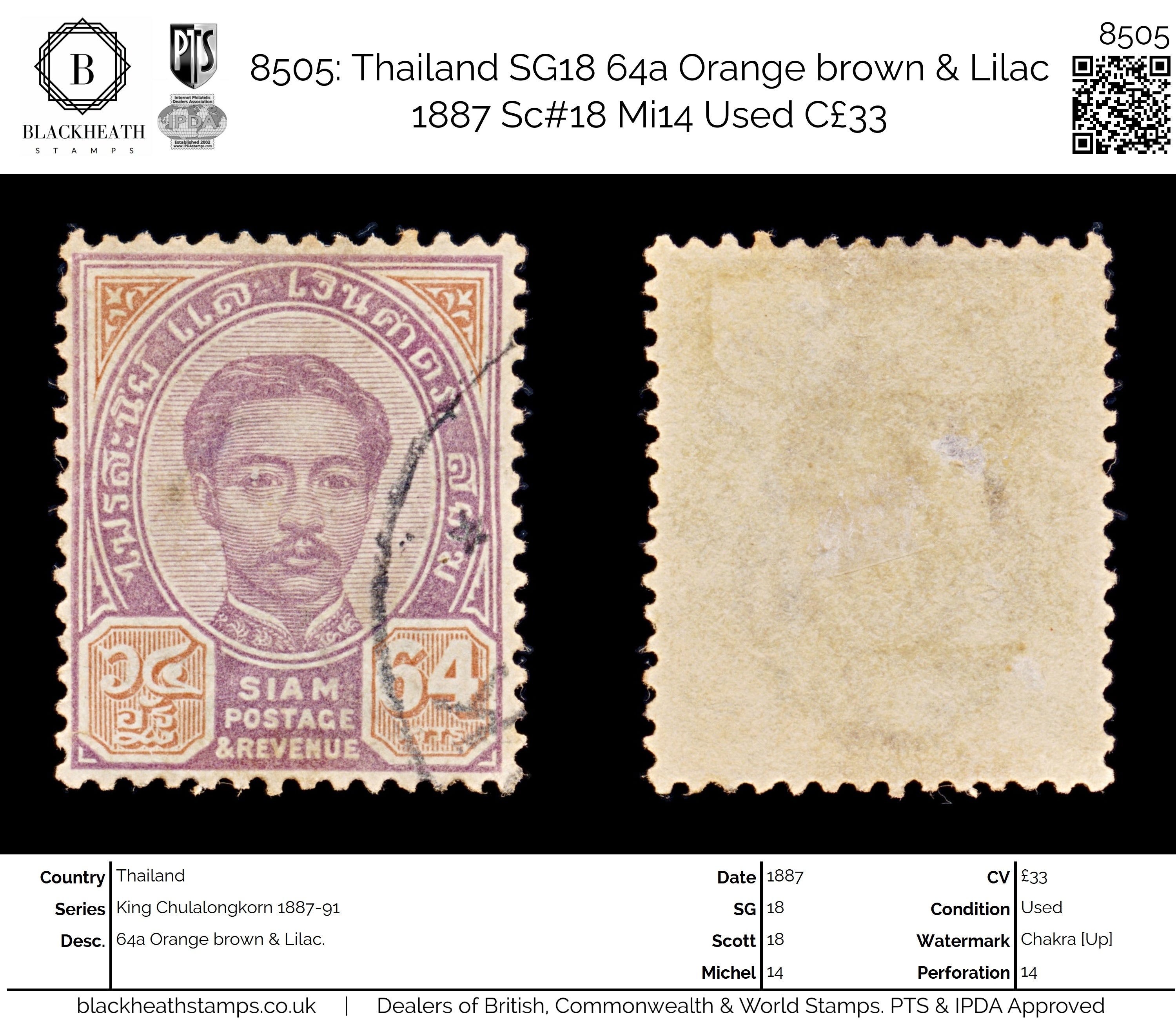 8505: Thailand SG18 64a Orange brown & Lilac 1887 Sc#18 Mi14 Uséd C£33
