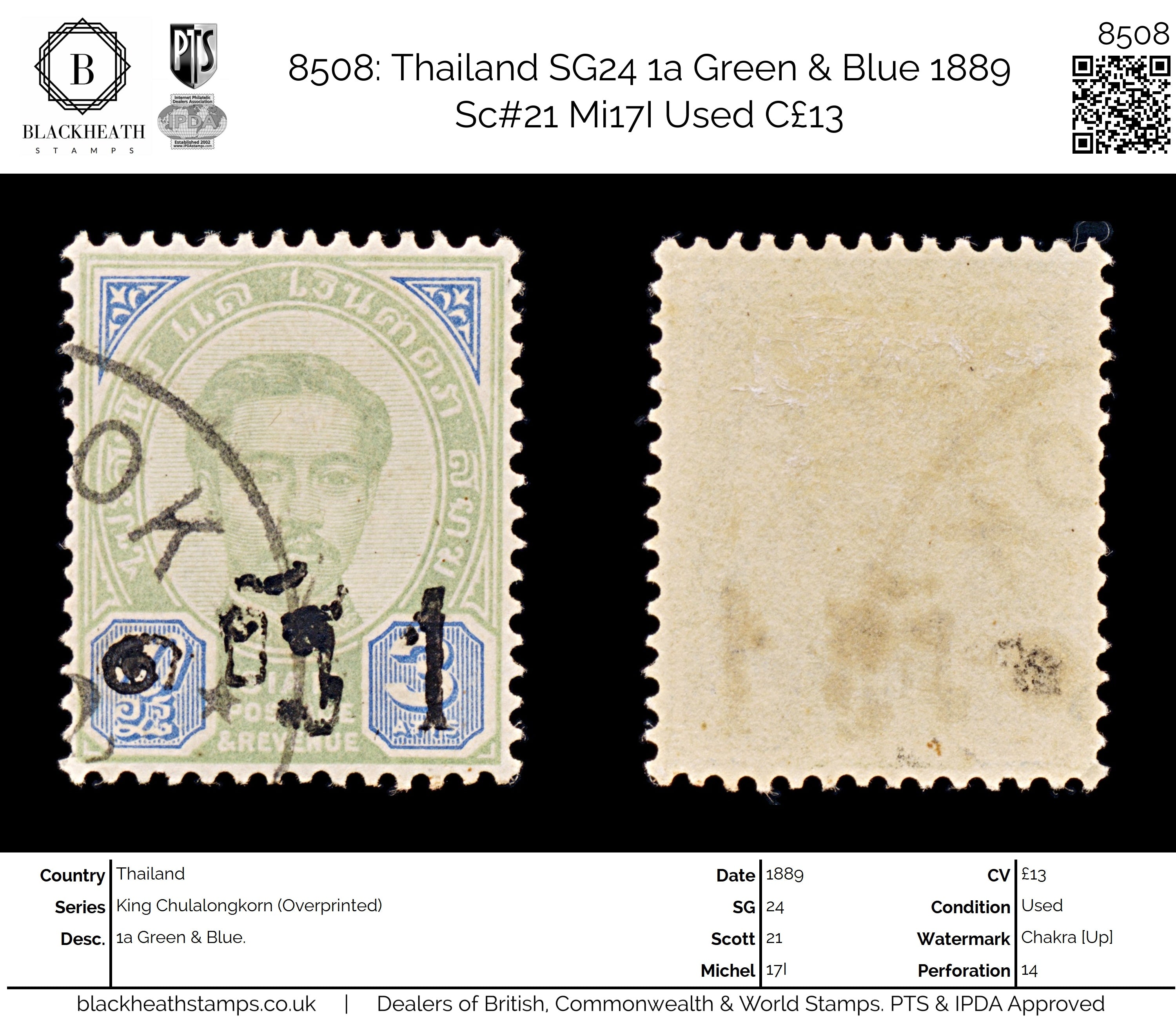 8508: Thailand SG24 1a Green & Blue 1889 Sc#21 Mi17I Used C£13