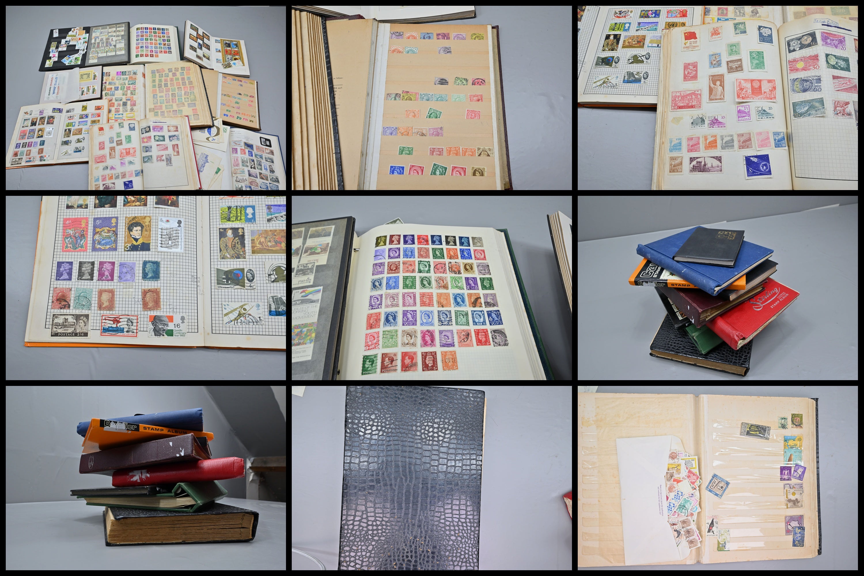 Large collection of 9 Albums and stockbooks. Over 180 images. Including many earlier items, GB QV from Line Engraved onwards, many higher values. British Commonwealth, Thematics, Many mint, sets including Israel mint with tabs. This collection has not been checked or picked, it is fresh to market. Not all pages shown, many more unseen.