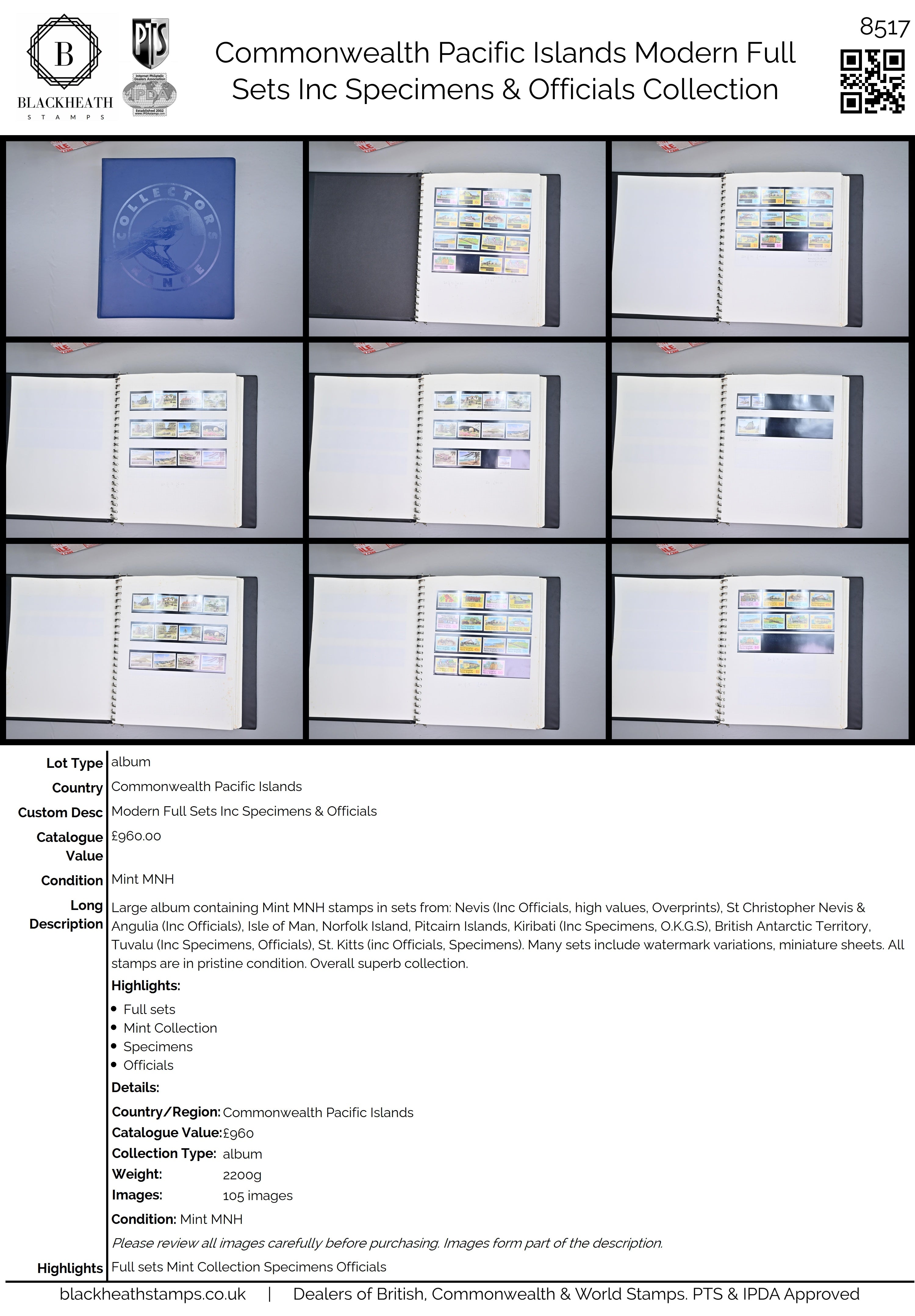 8517 Commonwealth Pacific Islands: Modern Full Sets Inc Specimens & Officials. Mint MNH. C£960 107 Images: Country: Commonwealth Pacific Islands CV: GBP960 Description:
