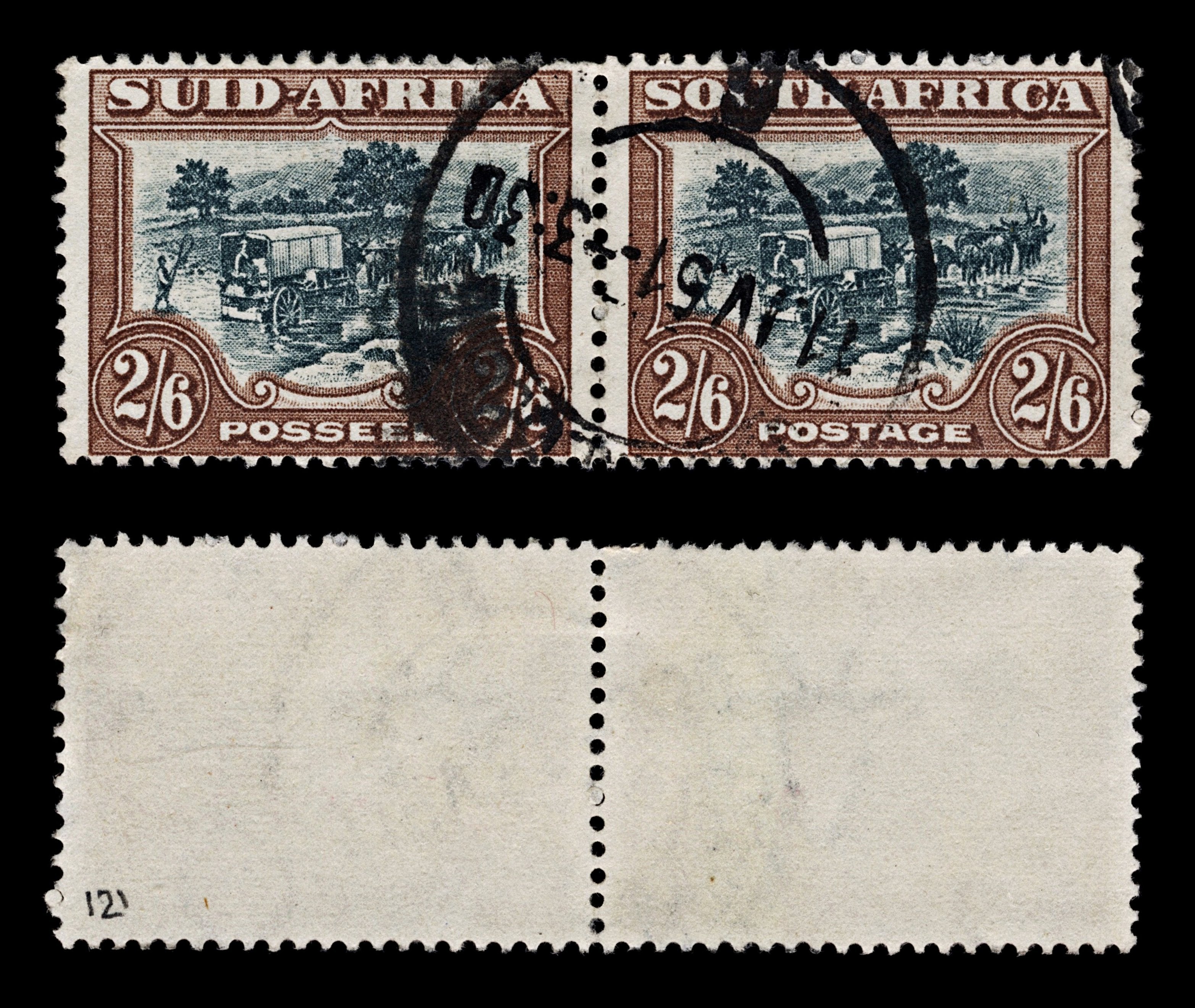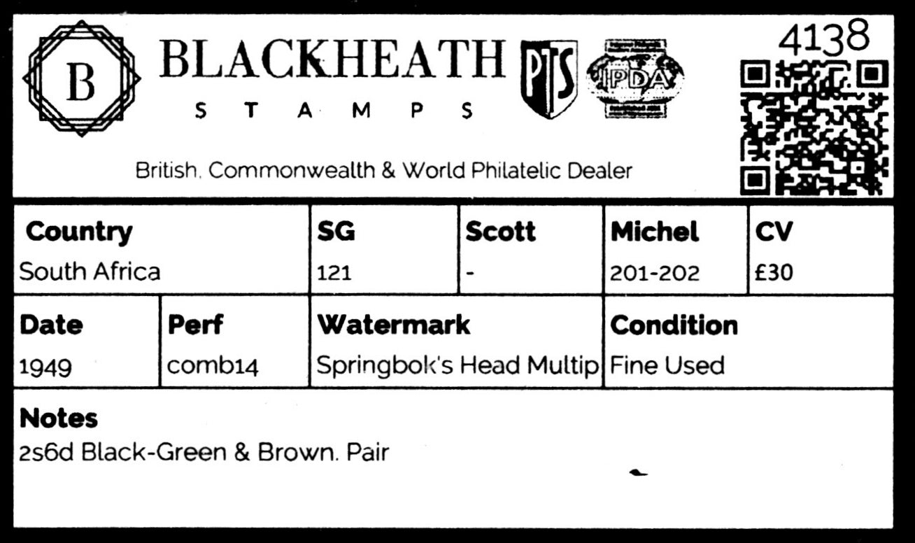 4138 South Africa SG121 2s6d Black-Green & Brown. Pair. 1949. Mi201-202 Fine Used. C£30