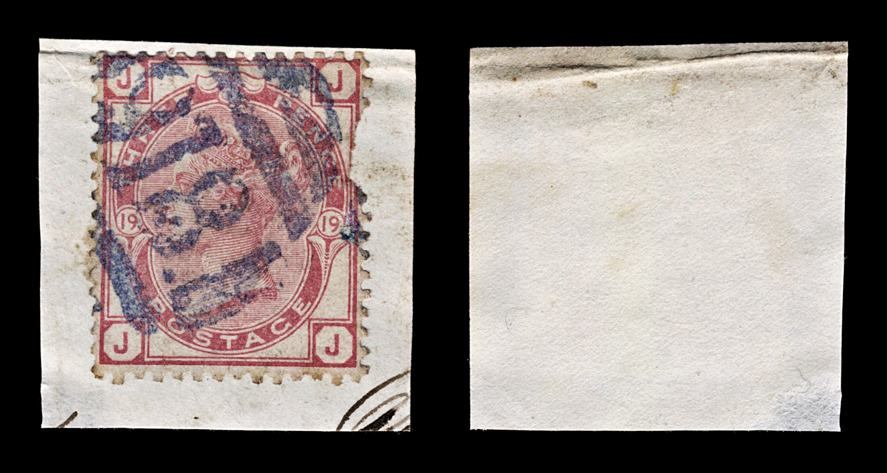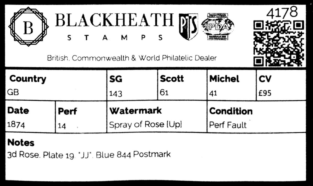 4178: GB SG143 3d Rose. Plate 19. "JJ". Blue 844 Postmark. 1874. Sc#61 Mi41 Perf Fault. C£95