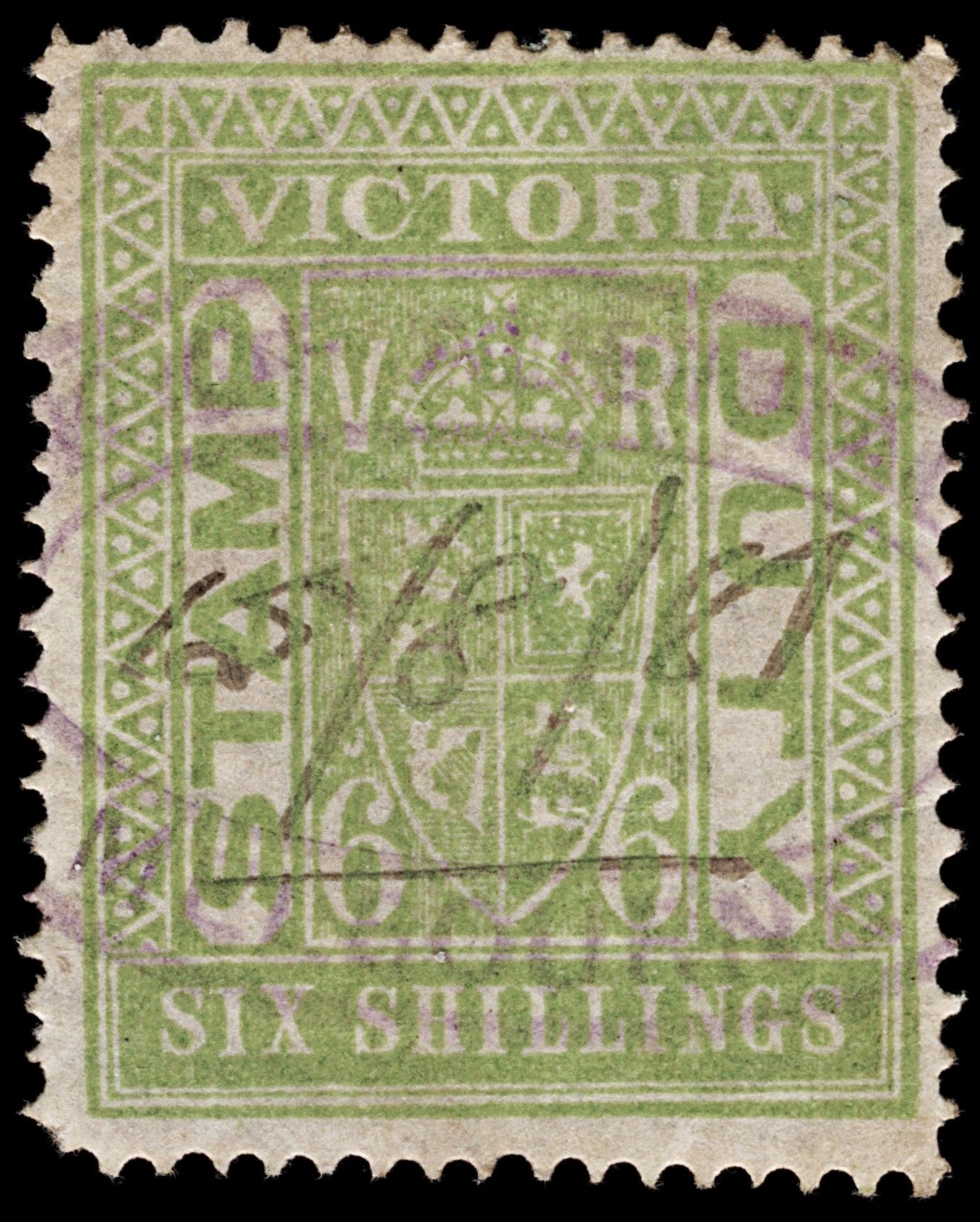 4236: Victoria SG271a 6s Light Green. Stamp Duty. 1891. Sc# AR44 Mi ST24 Fine Uséd. C£42