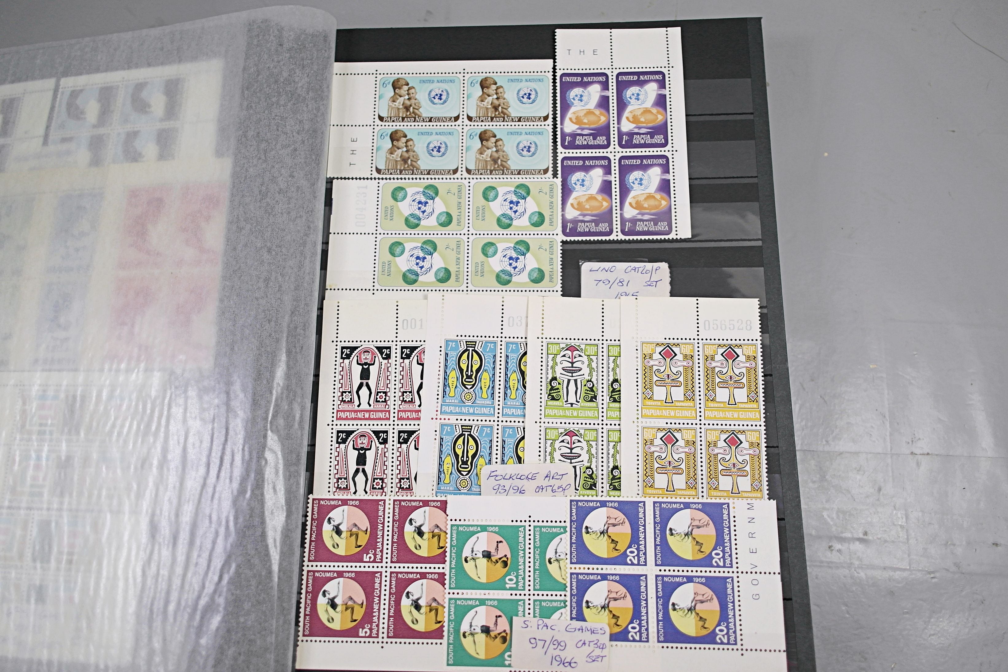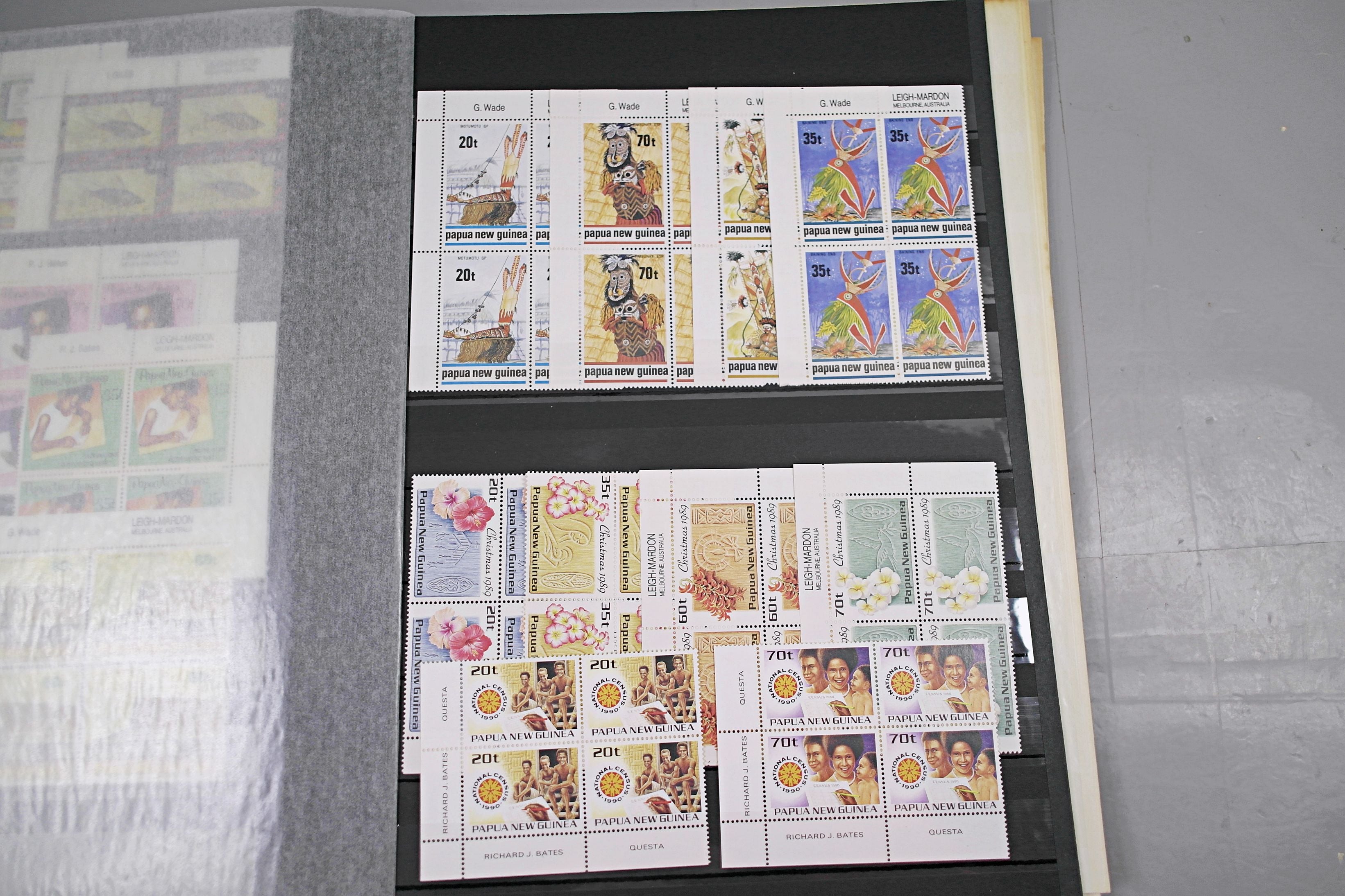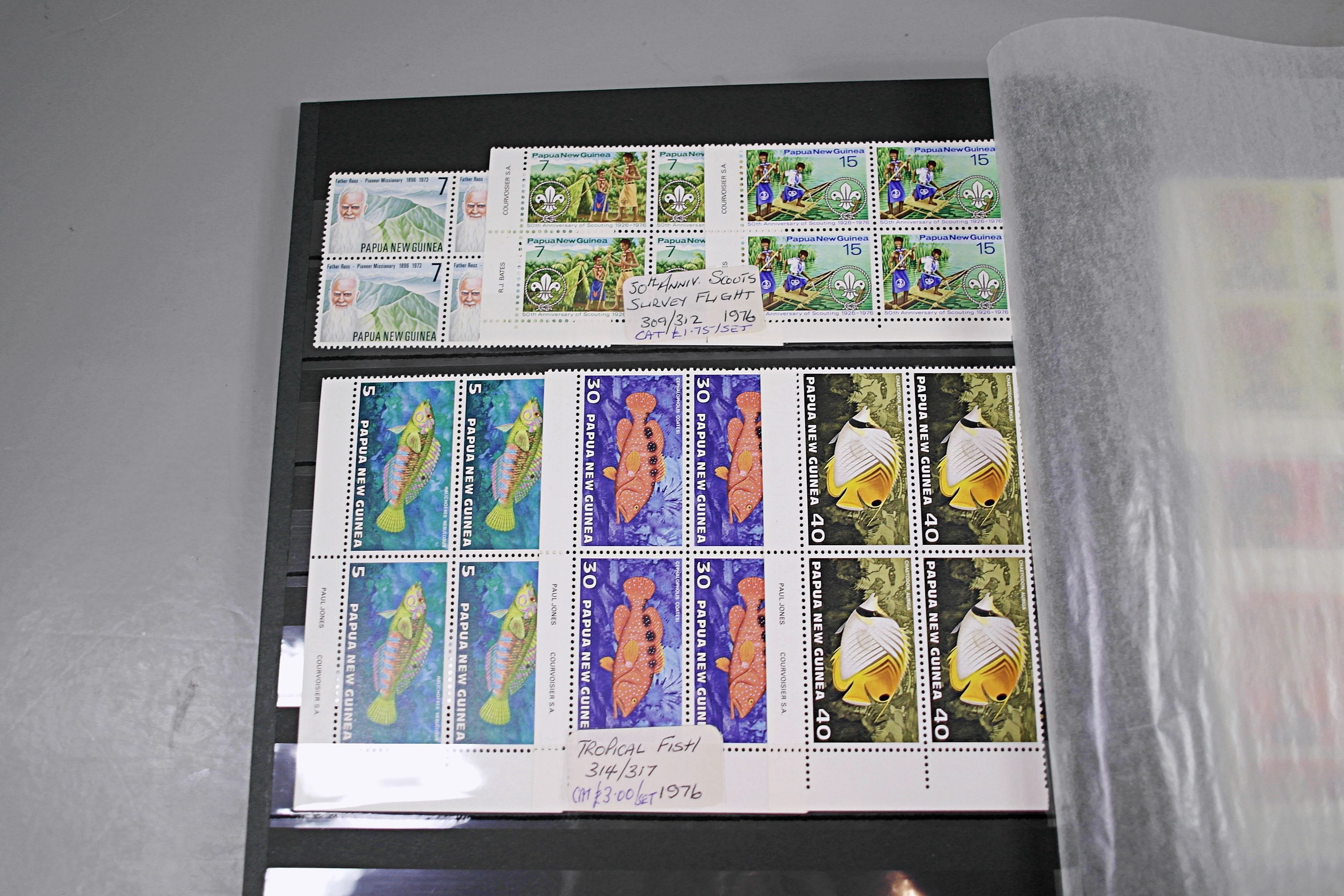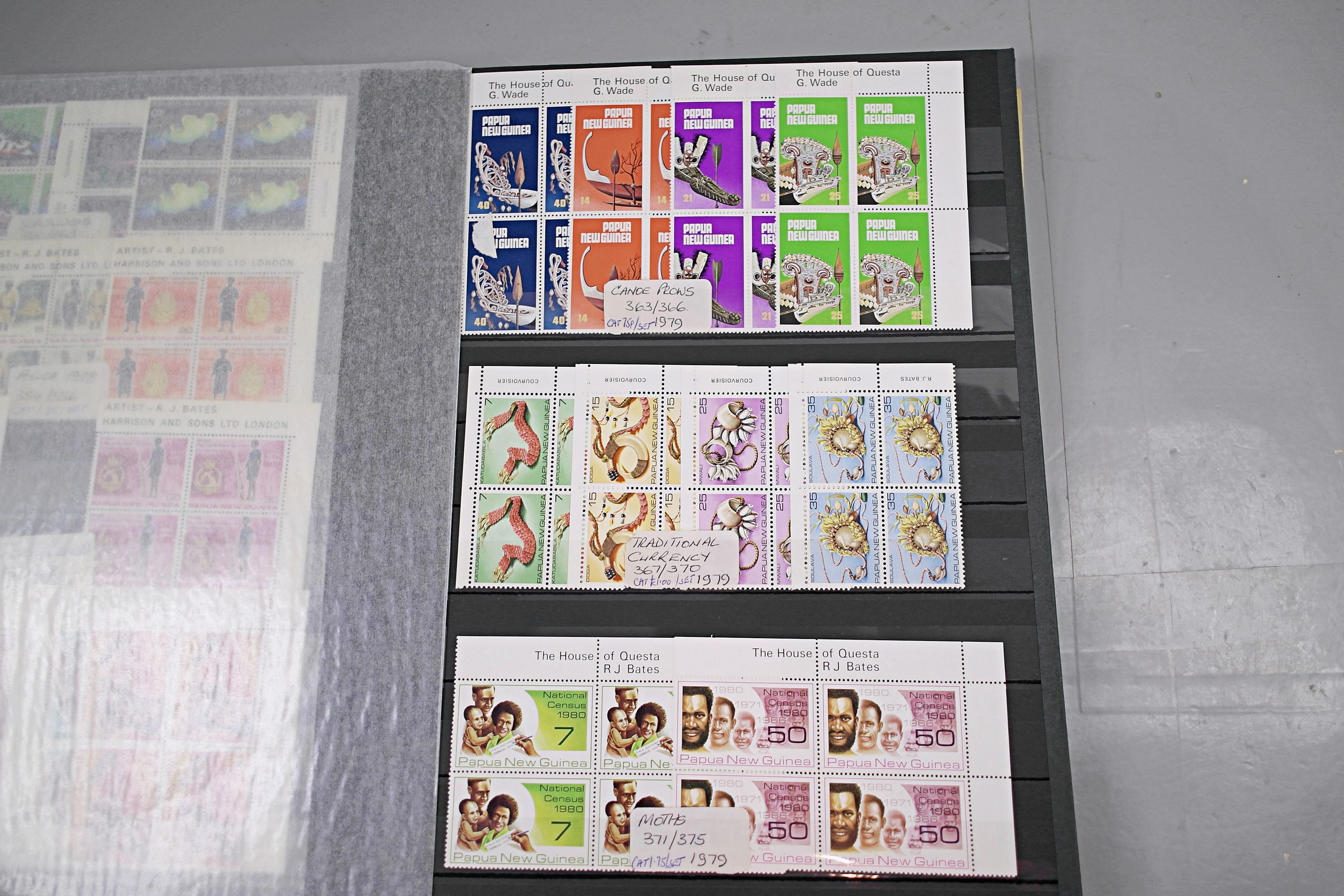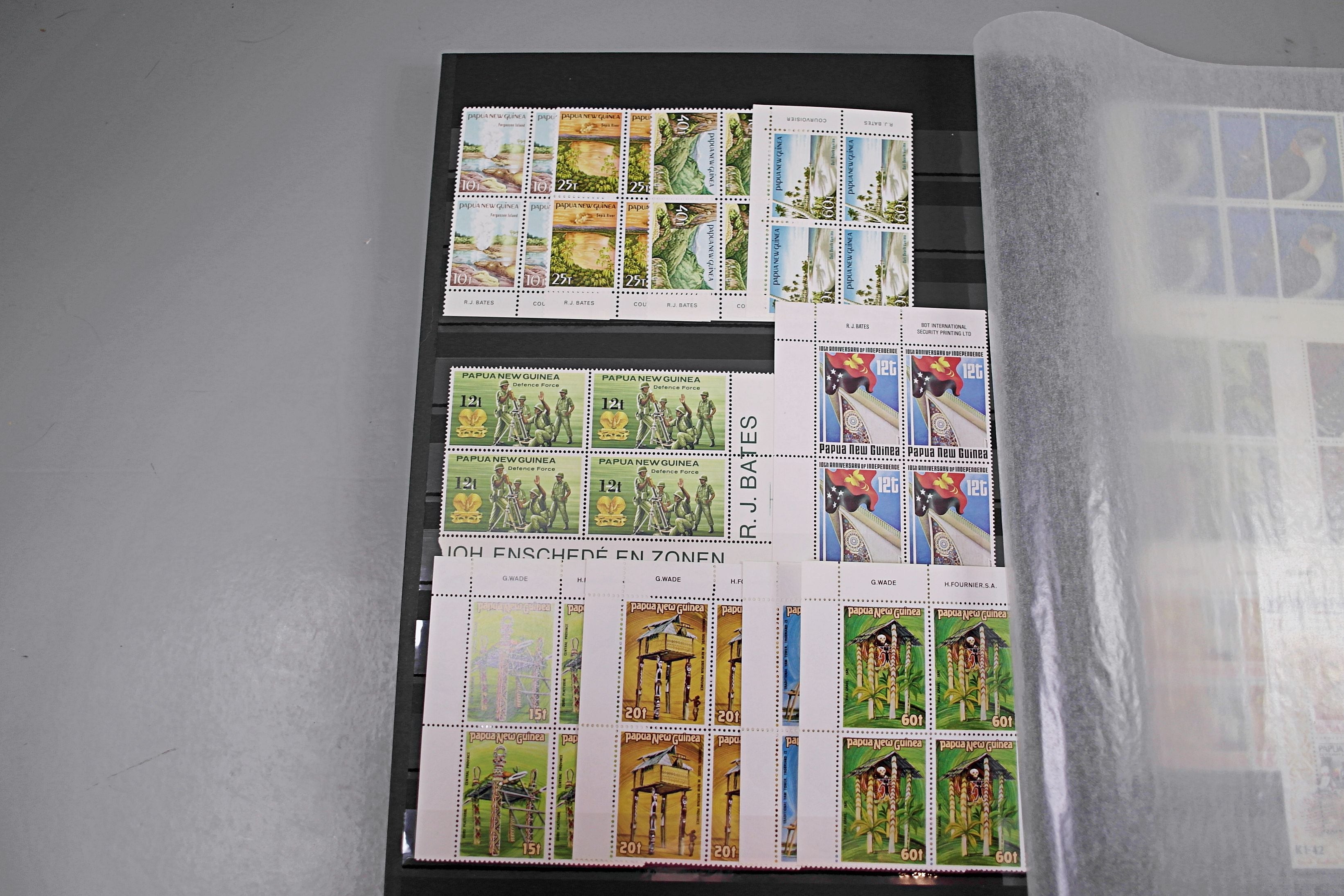 Large stockbook of Papua New Guinea stamps in full sets in Mint Never Hinged blocks of 4, most with sheet numbers or cylinder blocks. The collection ranges from 1963 to 1990. All sheets are in fresh condition. Many thematic stamps seen for animals, birds, people etc. Please view all 44 images closely.