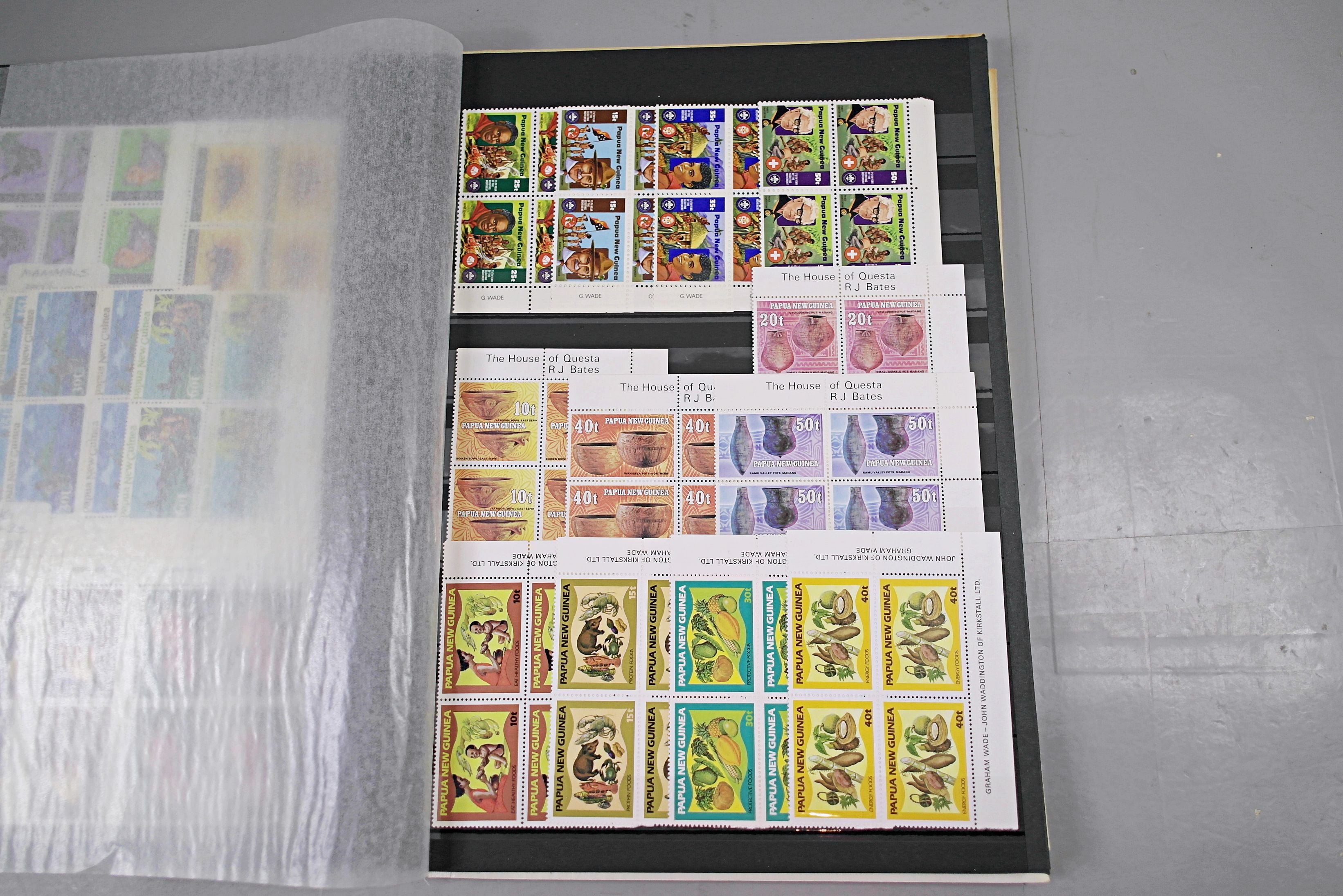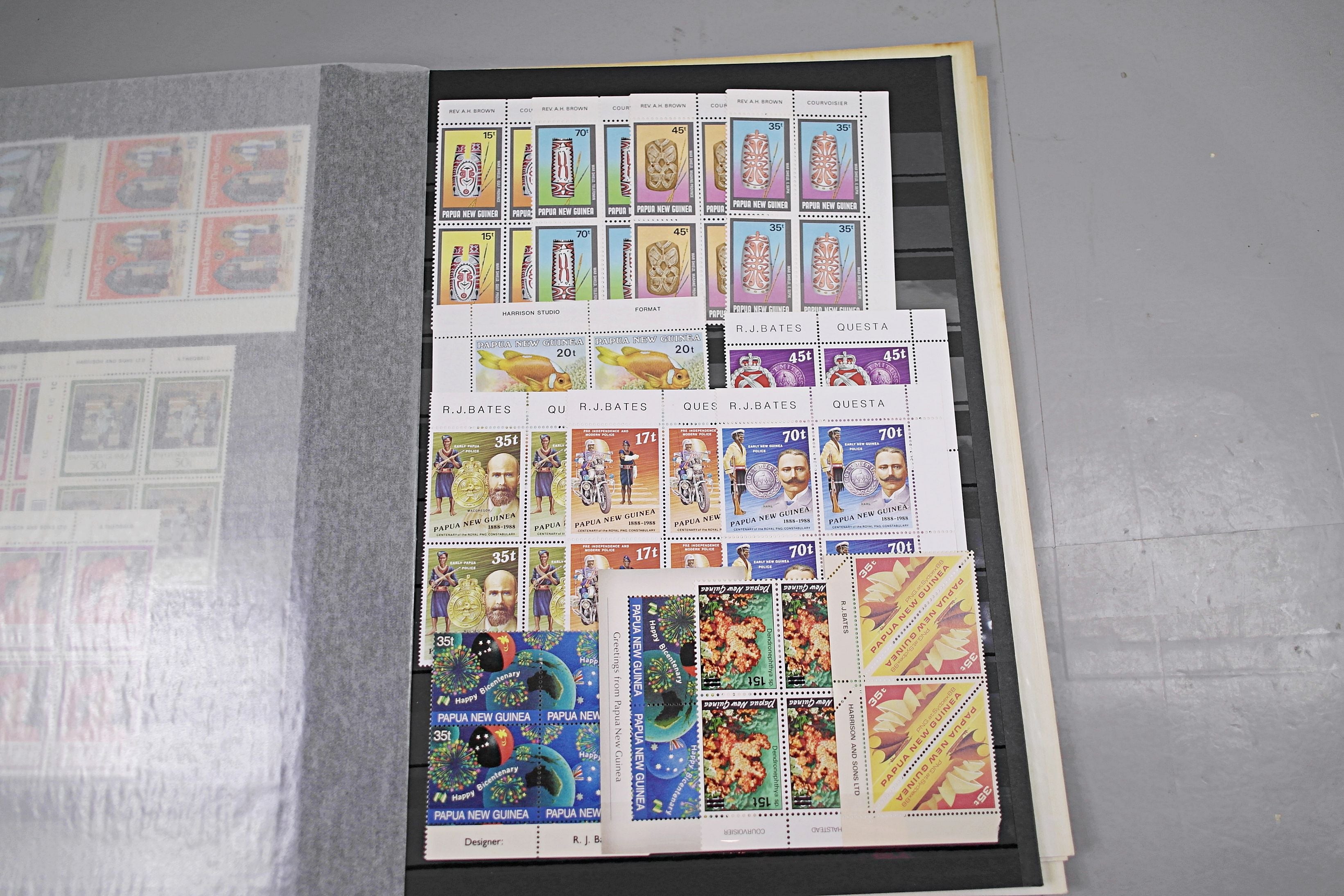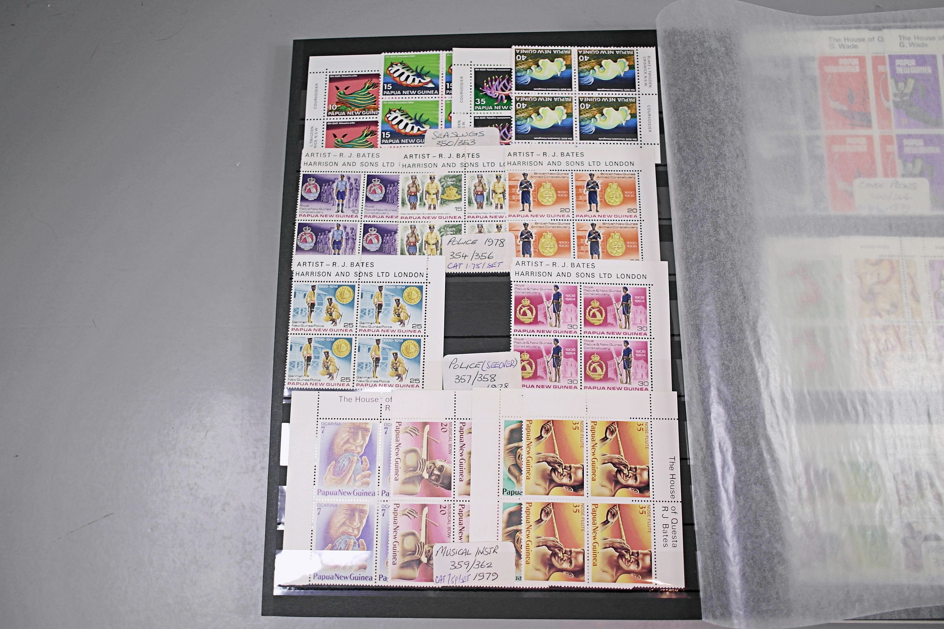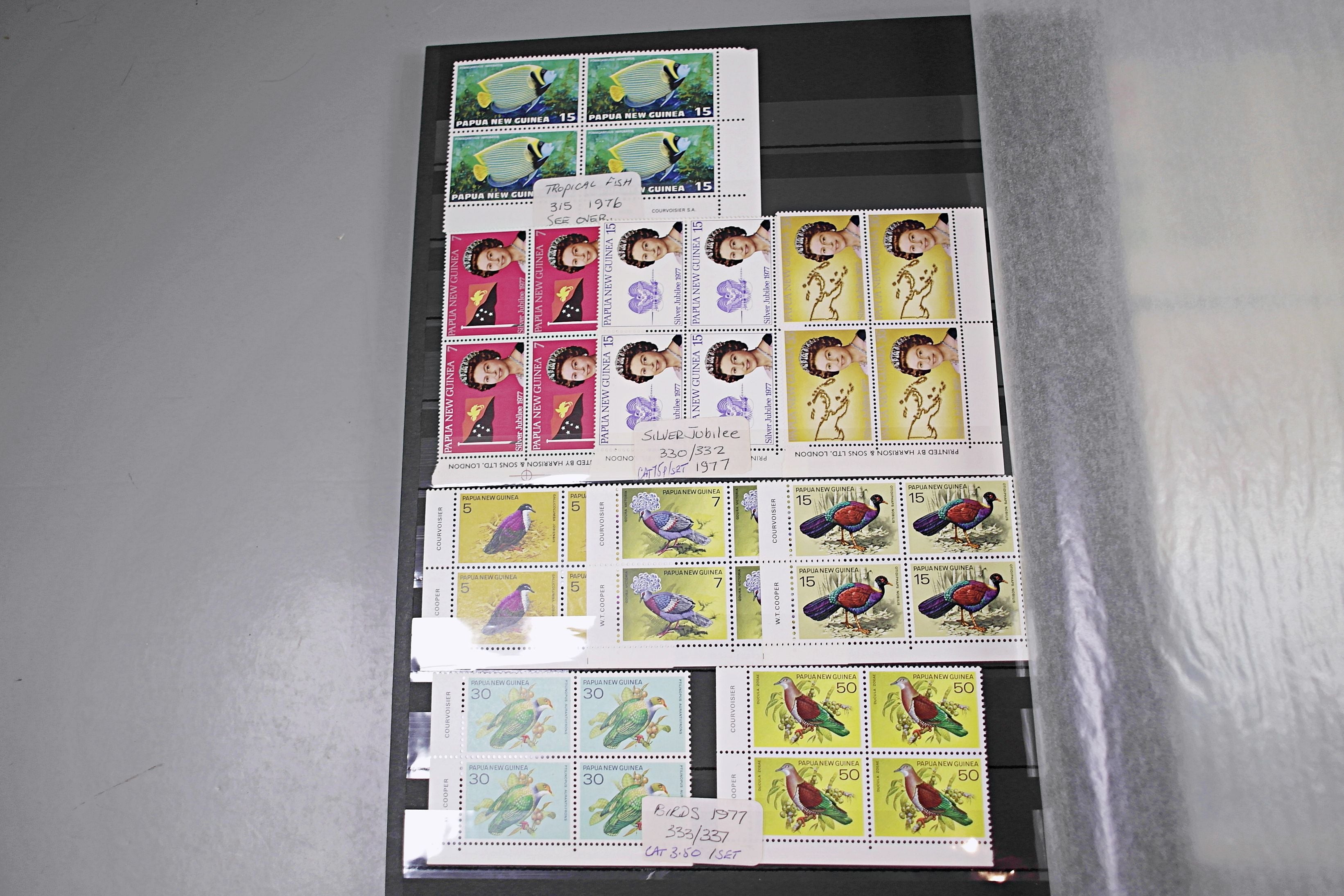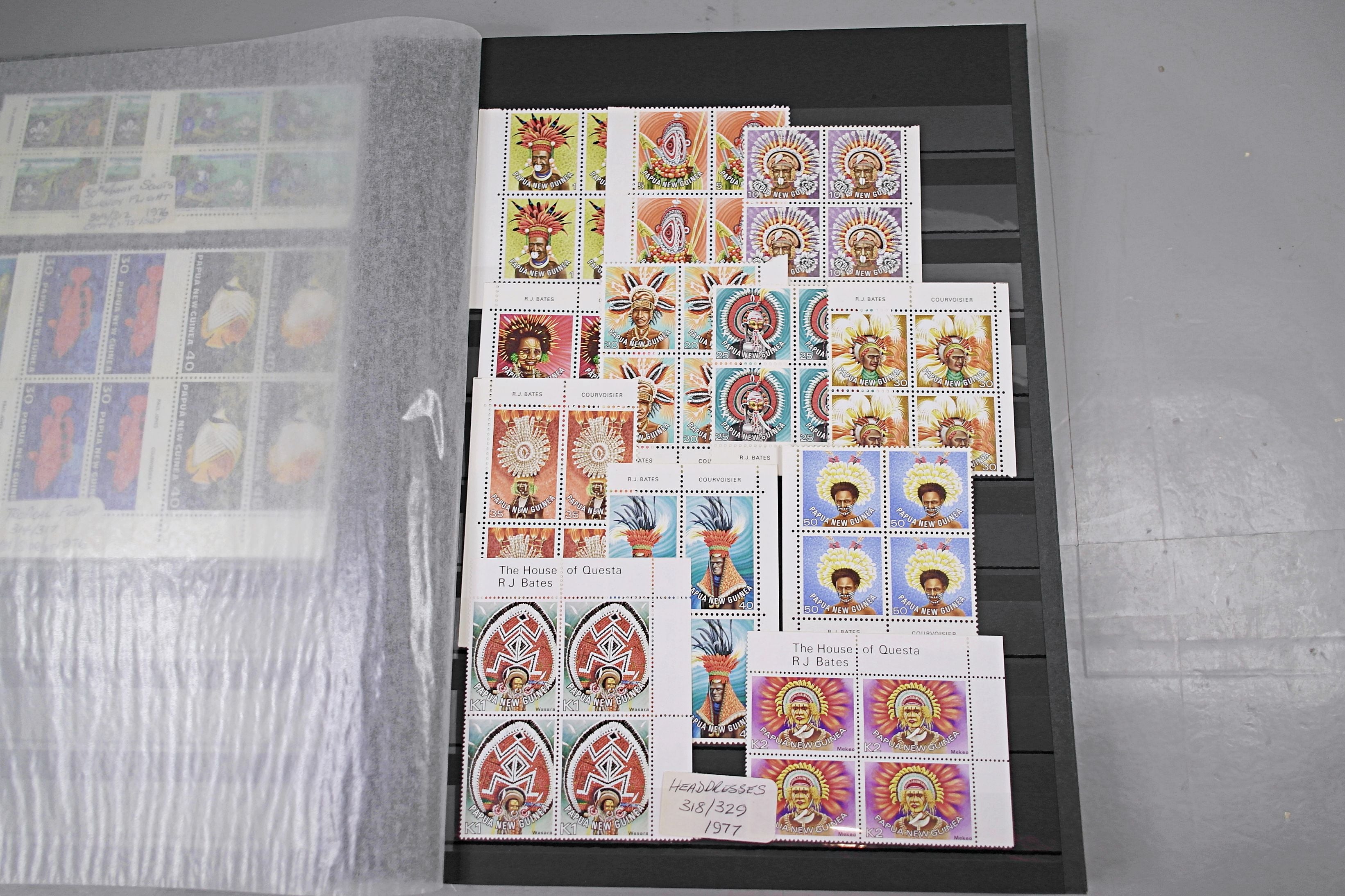Large stockbook of Papua New Guinea stamps in full sets in Mint Never Hinged blocks of 4, most with sheet numbers or cylinder blocks. The collection ranges from 1963 to 1990. All sheets are in fresh condition. Many thematic stamps seen for animals, birds, people etc. Please view all 44 images closely.