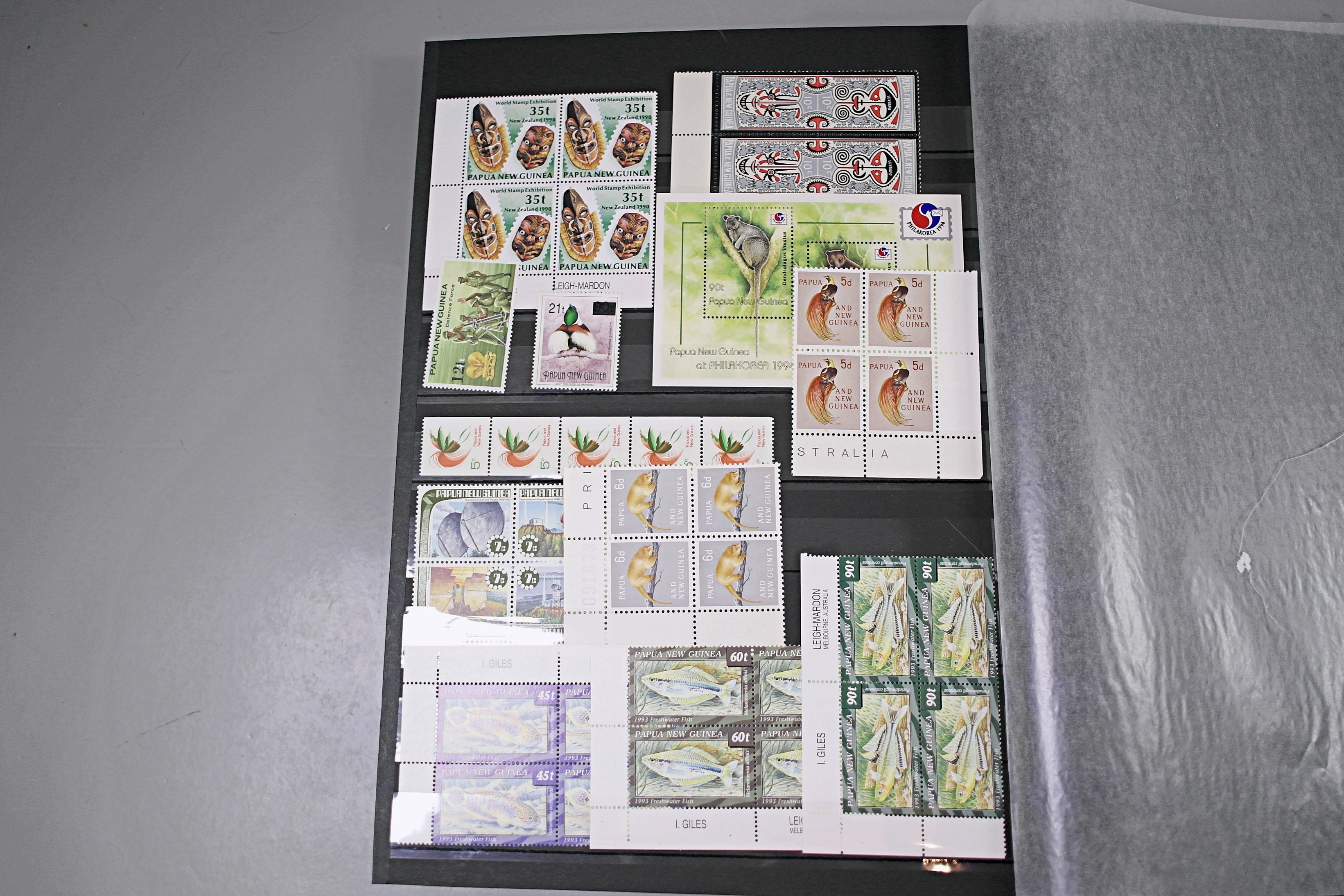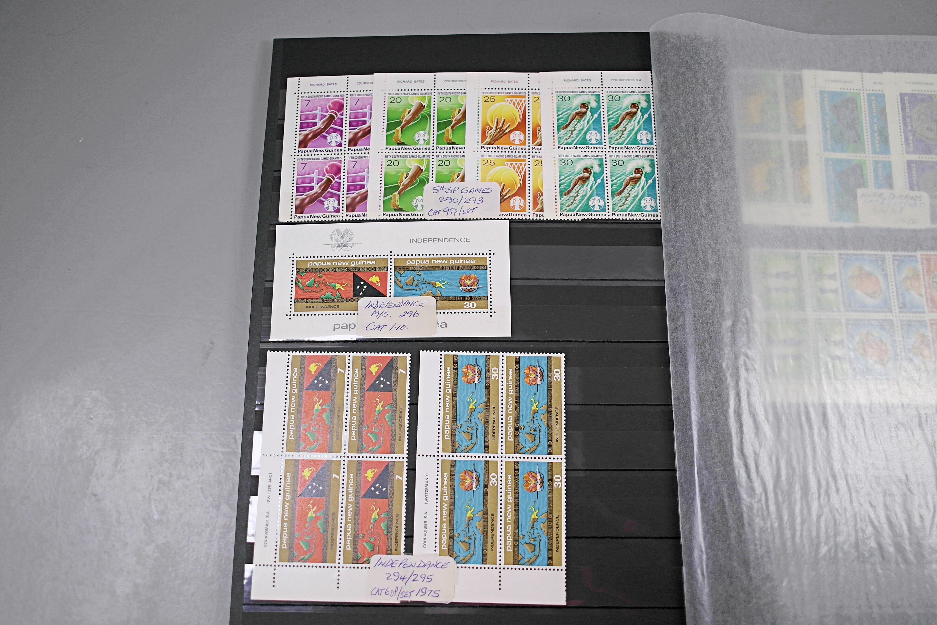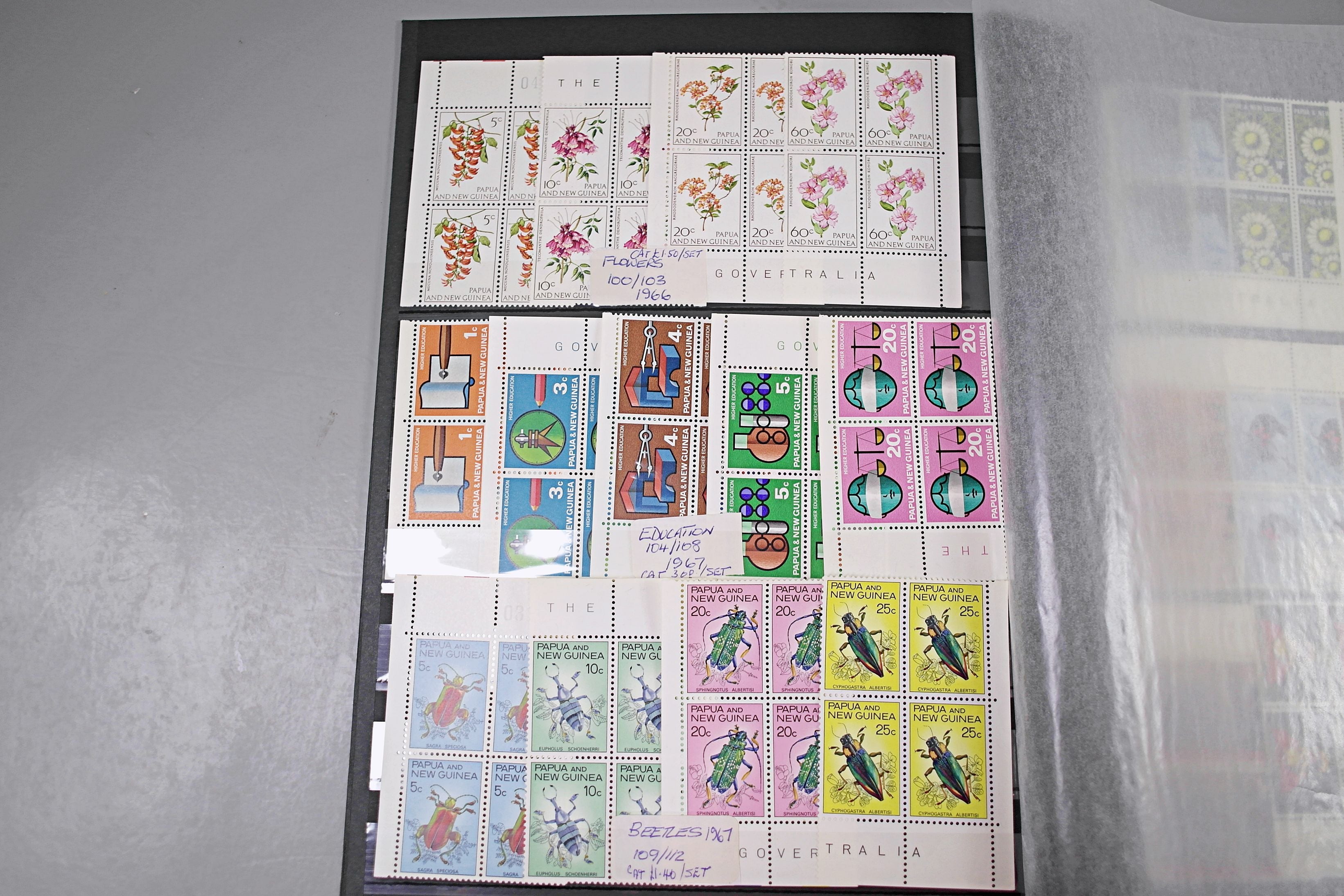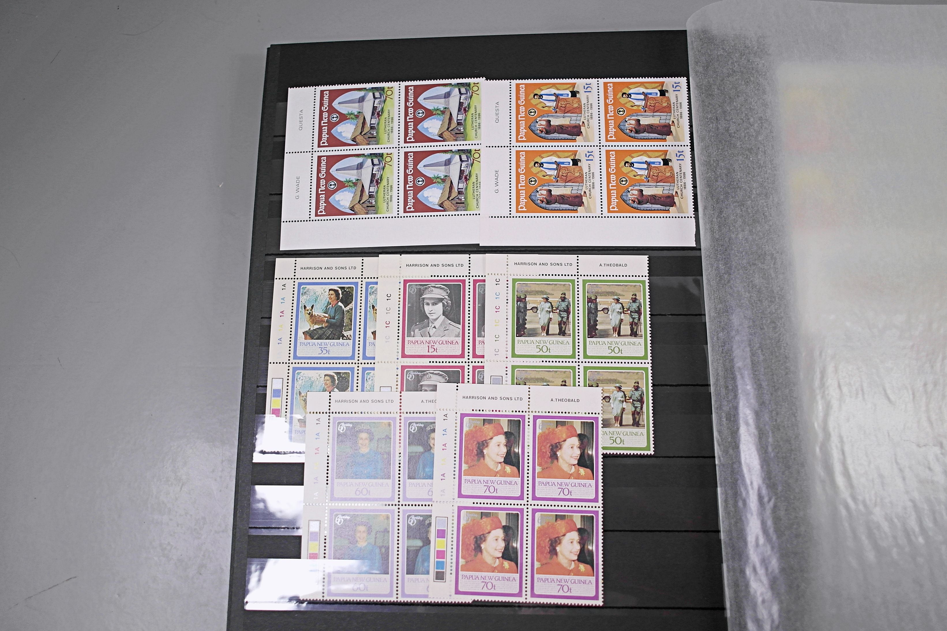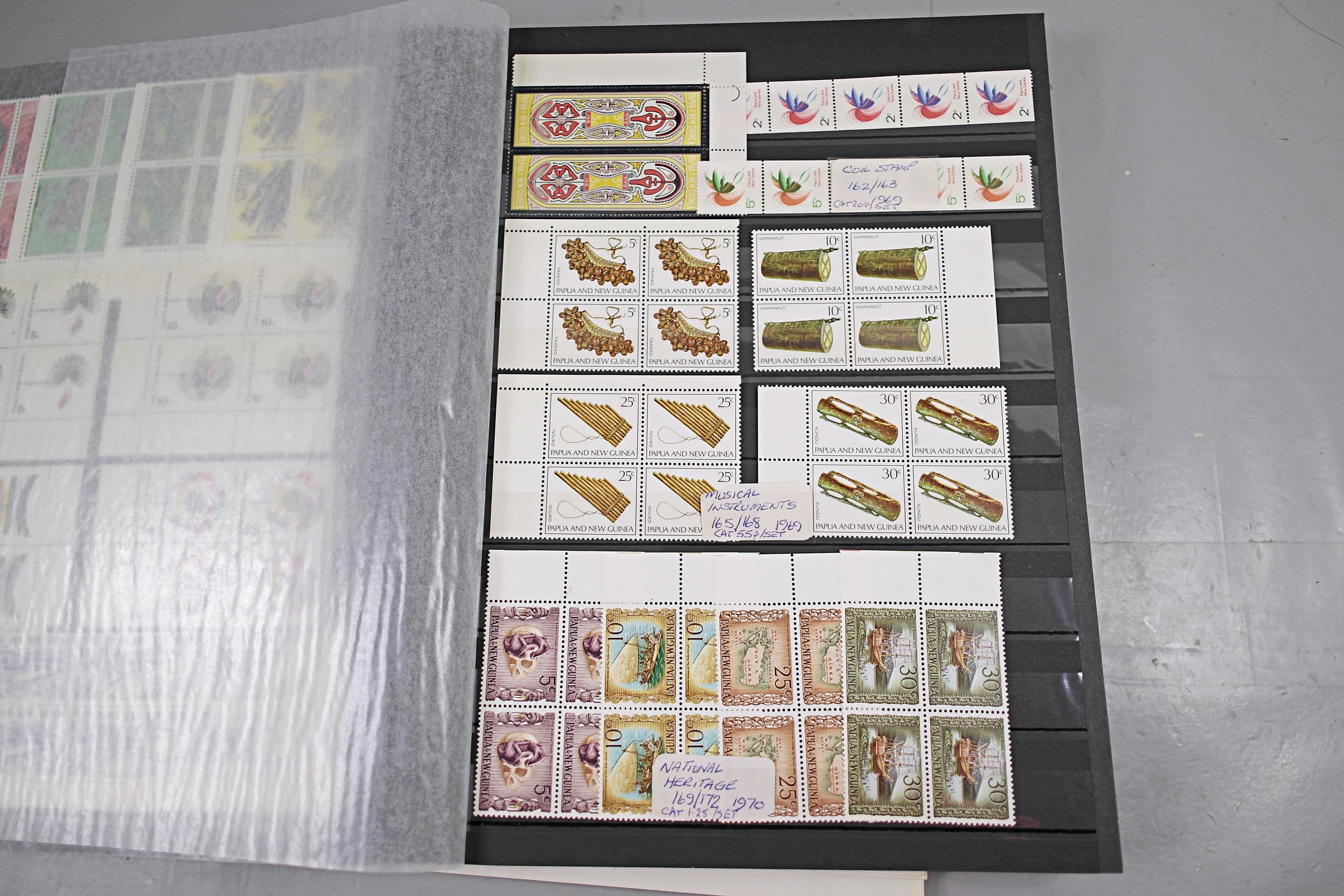 Large stockbook of Papua New Guinea stamps in full sets in Mint Never Hinged blocks of 4, most with sheet numbers or cylinder blocks. The collection ranges from 1963 to 1990. All sheets are in fresh condition. Many thematic stamps seen for animals, birds, people etc. Please view all 44 images closely.
