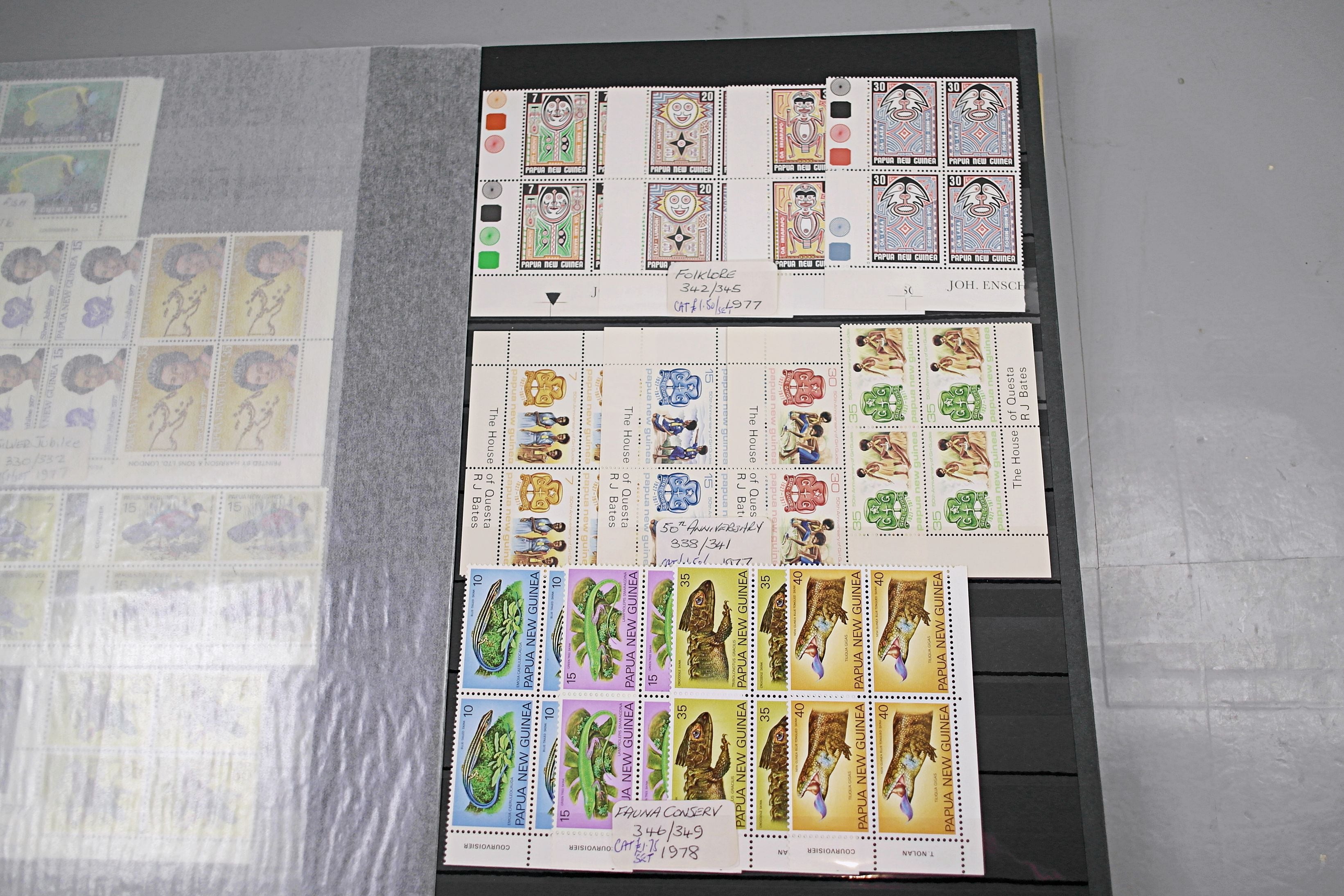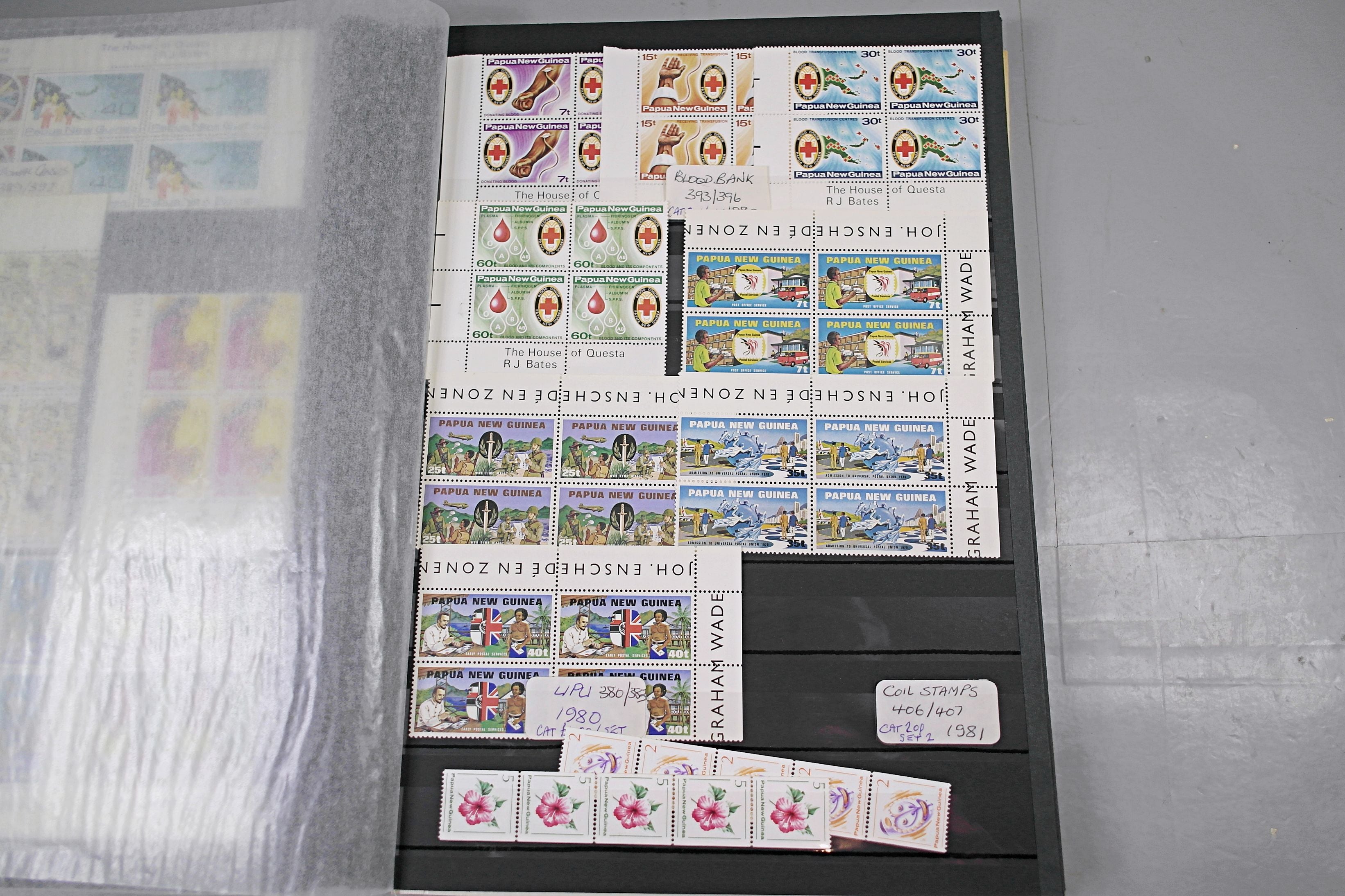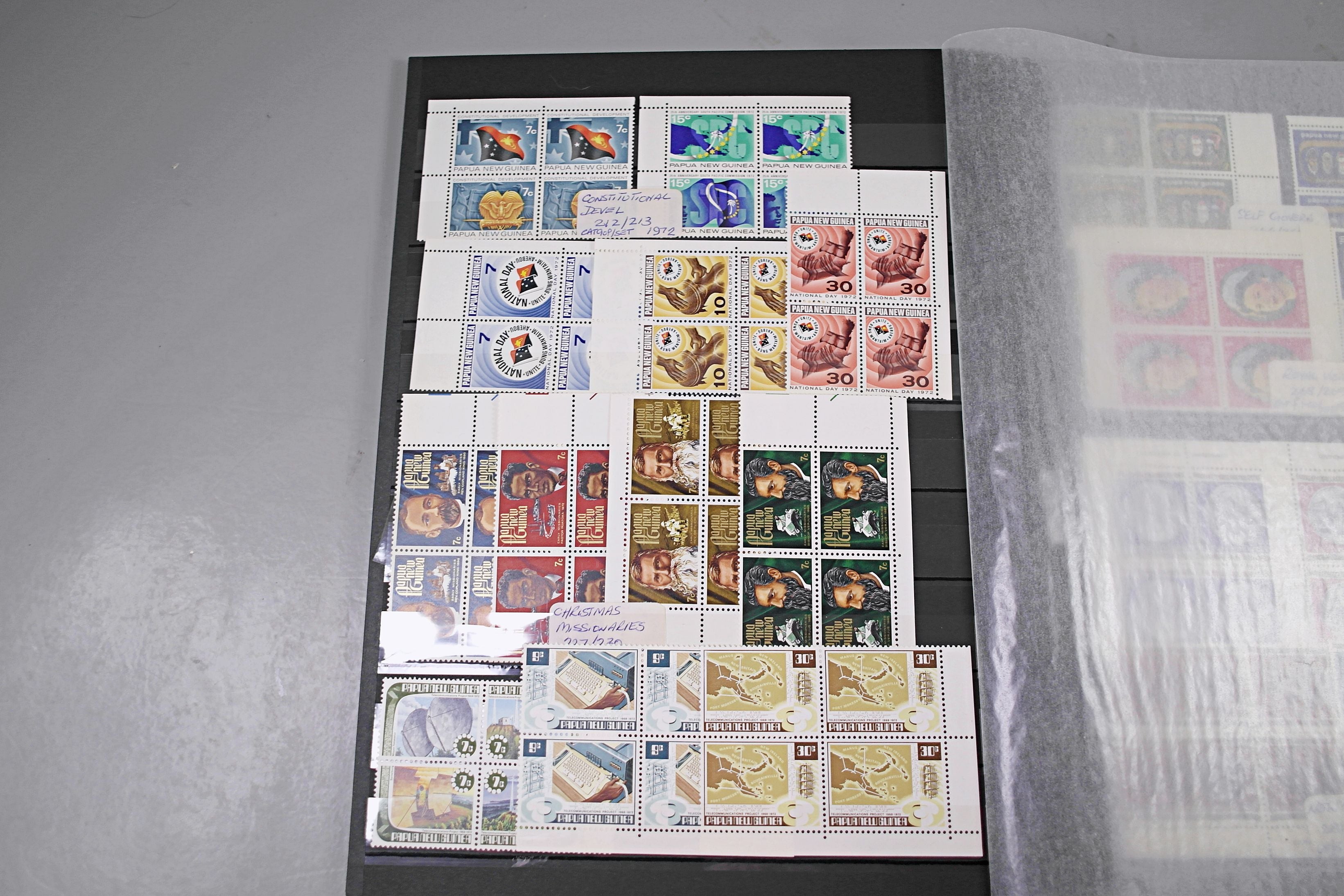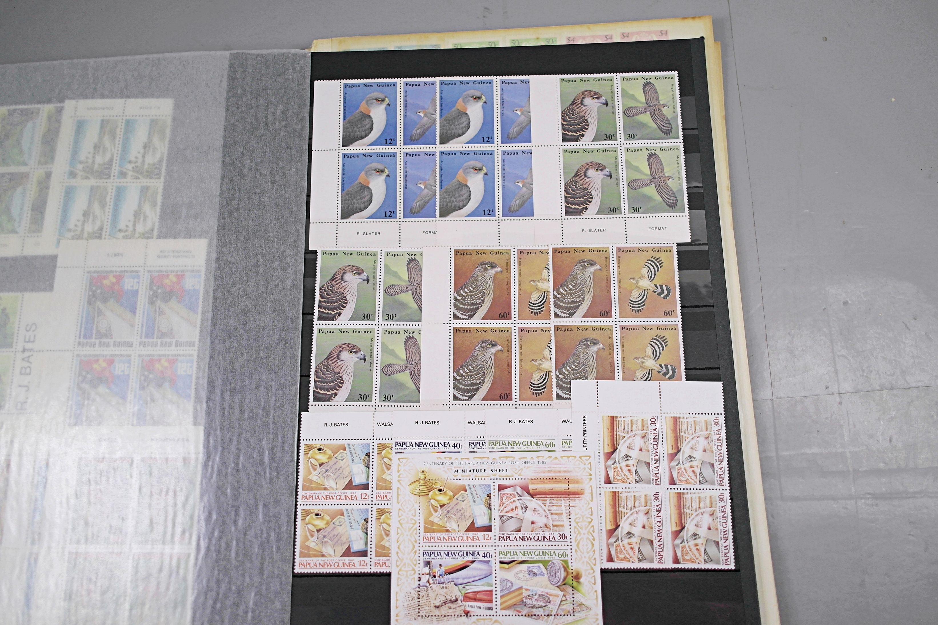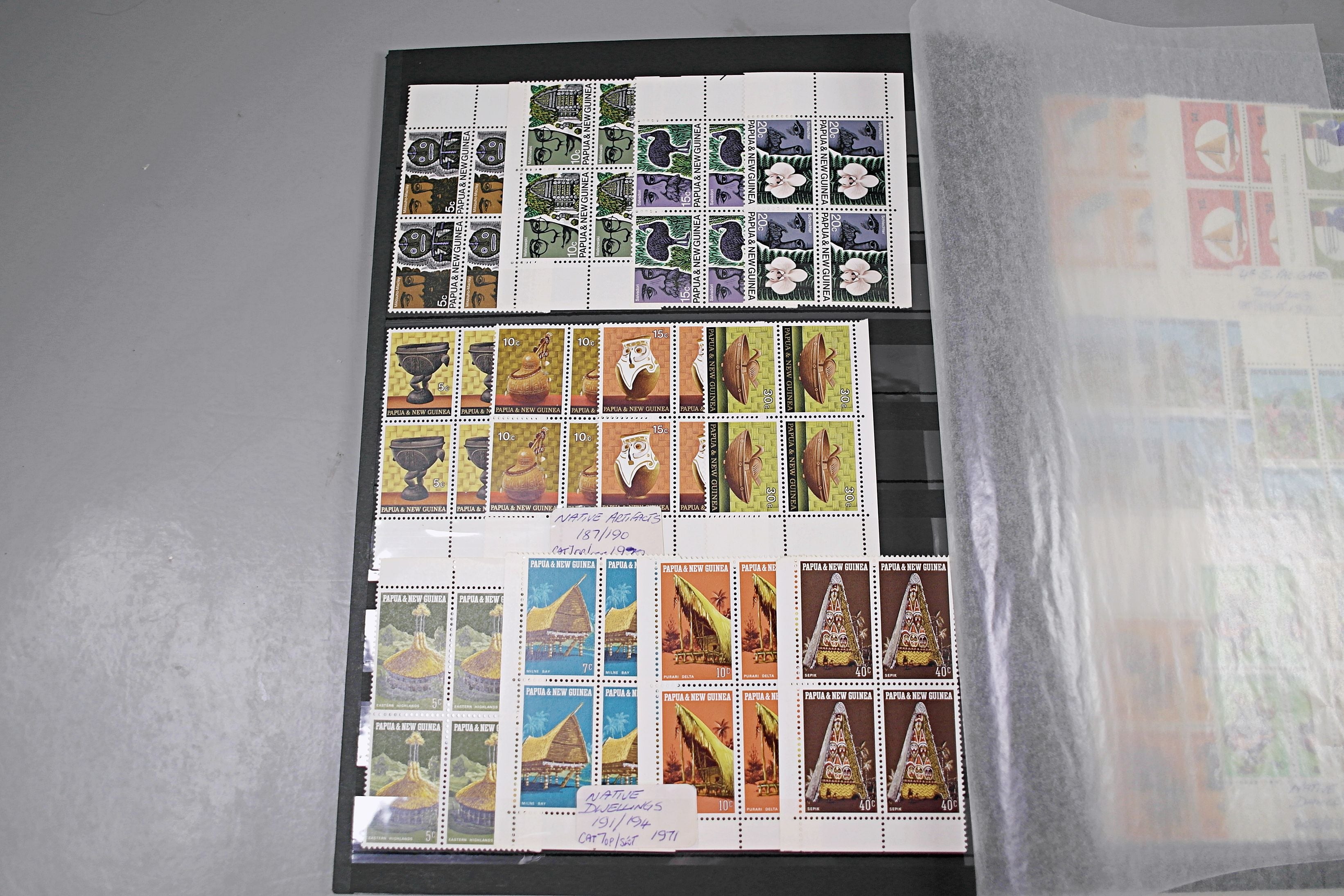 Large stockbook of Papua New Guinea stamps in full sets in Mint Never Hinged blocks of 4, most with sheet numbers or cylinder blocks. The collection ranges from 1963 to 1990. All sheets are in fresh condition. Many thematic stamps seen for animals, birds, people etc. Please view all 44 images closely.