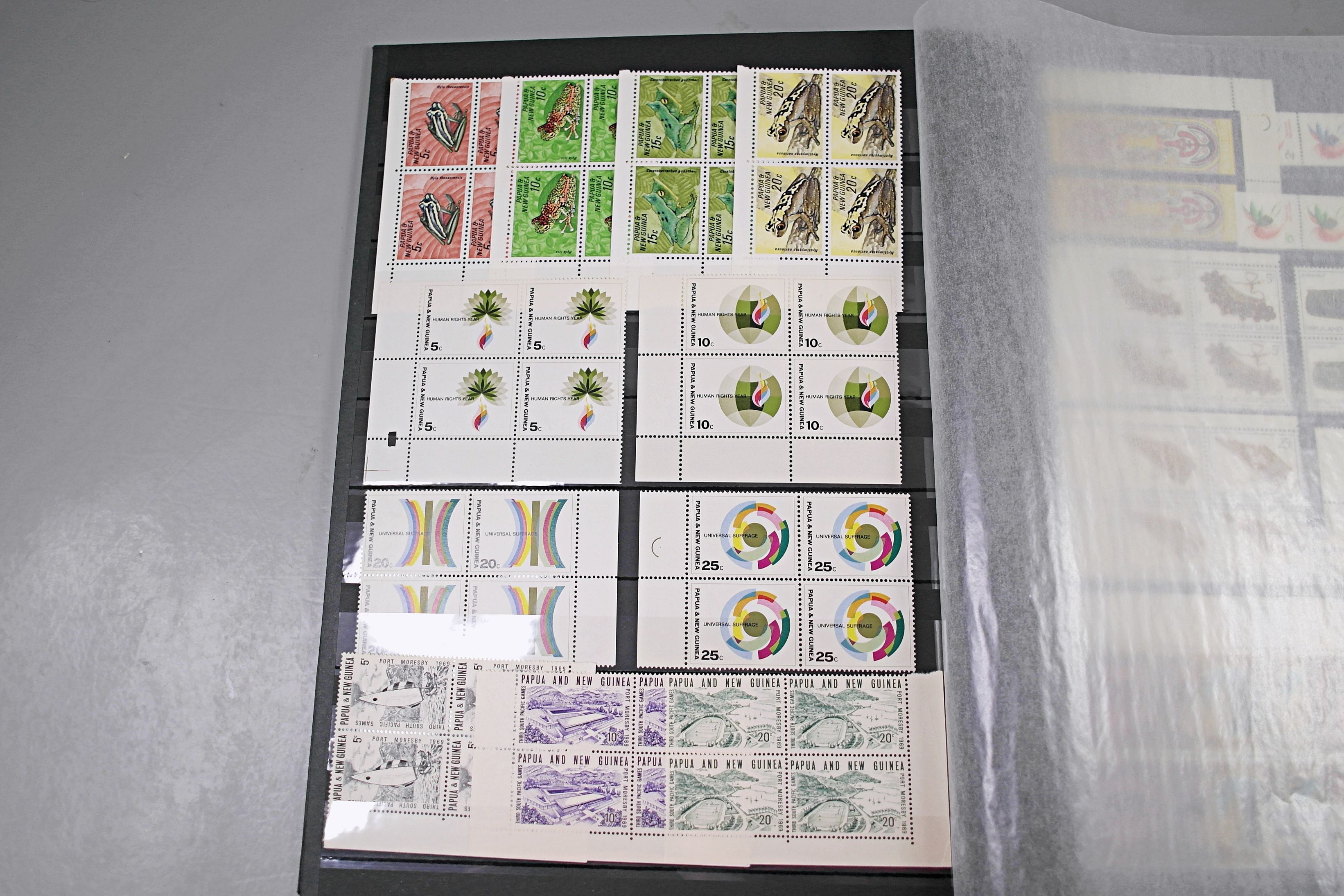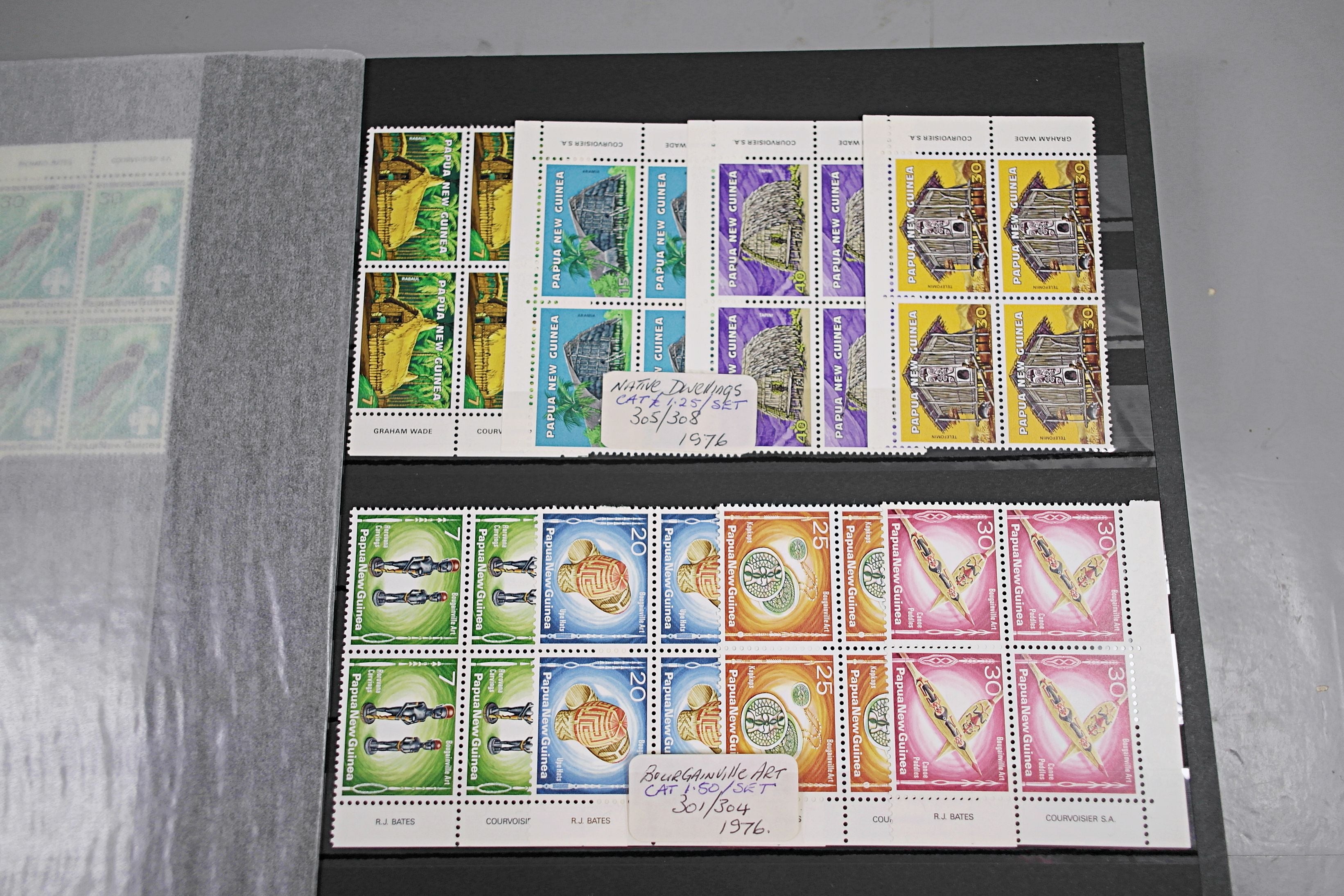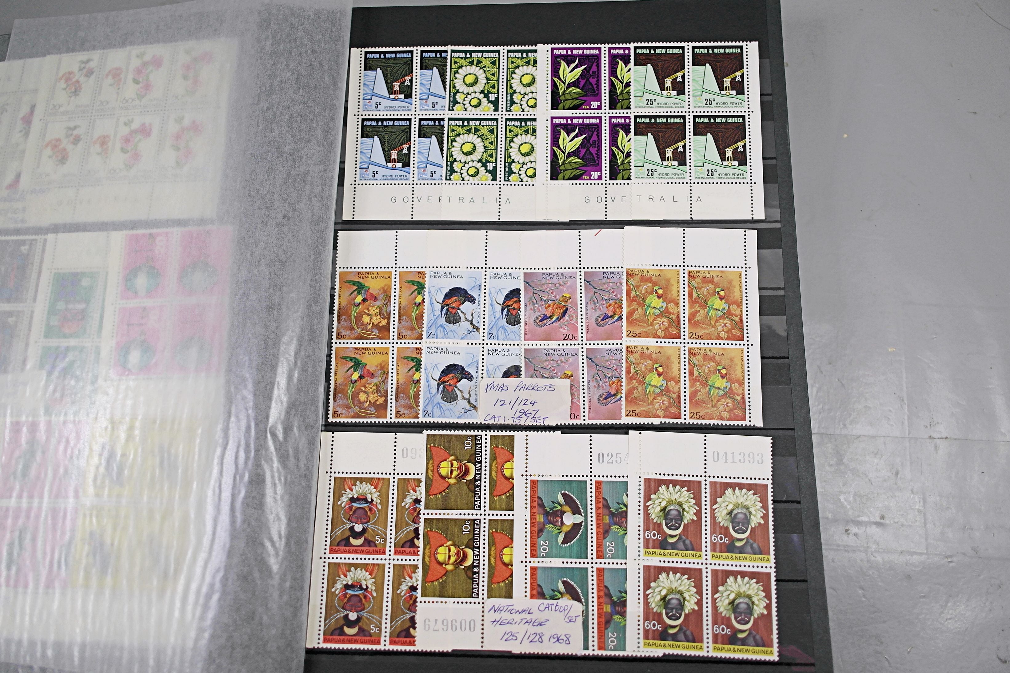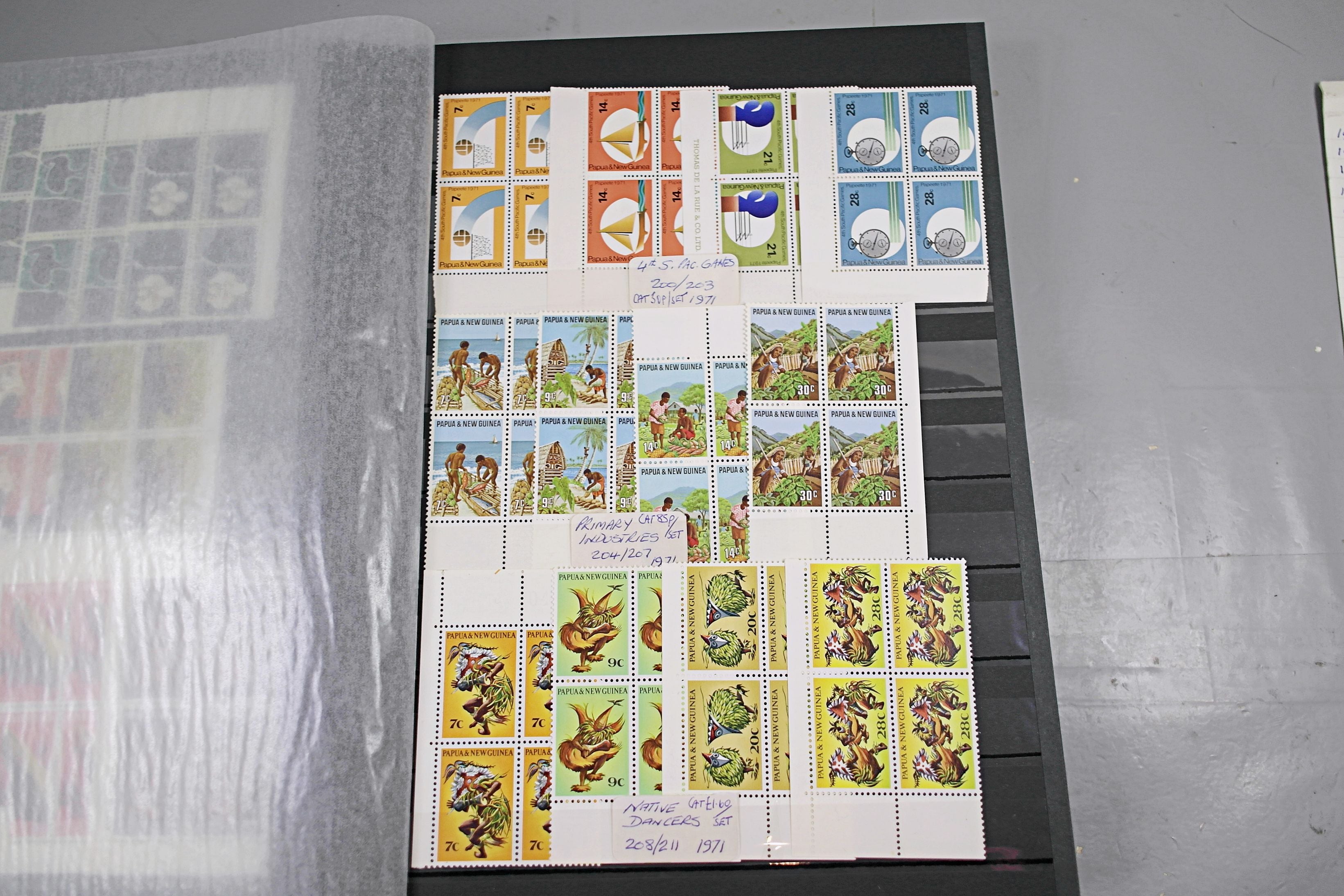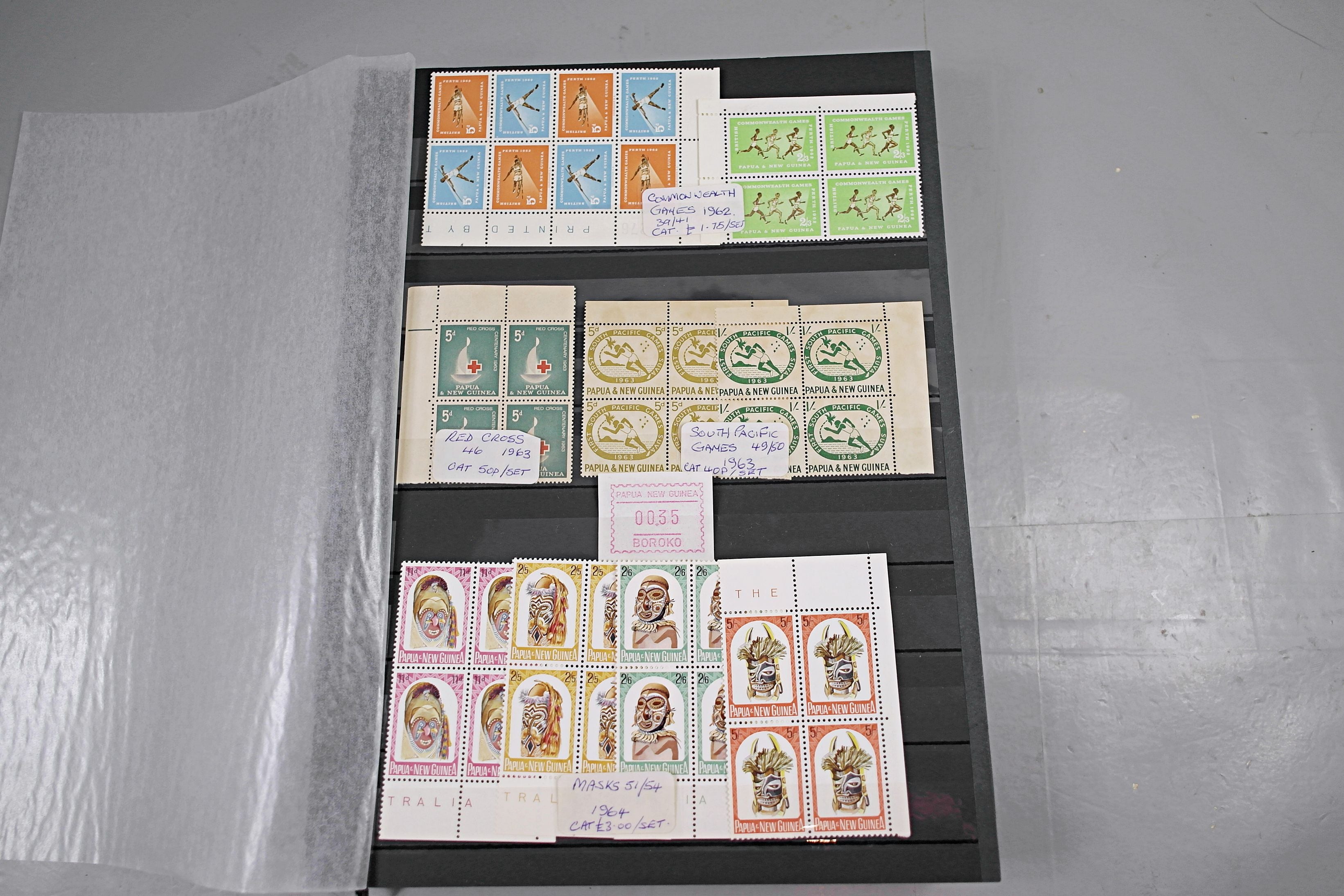 Large stockbook of Papua New Guinea stamps in full sets in Mint Never Hinged blocks of 4, most with sheet numbers or cylinder blocks. The collection ranges from 1963 to 1990. All sheets are in fresh condition. Many thematic stamps seen for animals, birds, people etc. Please view all 44 images closely.