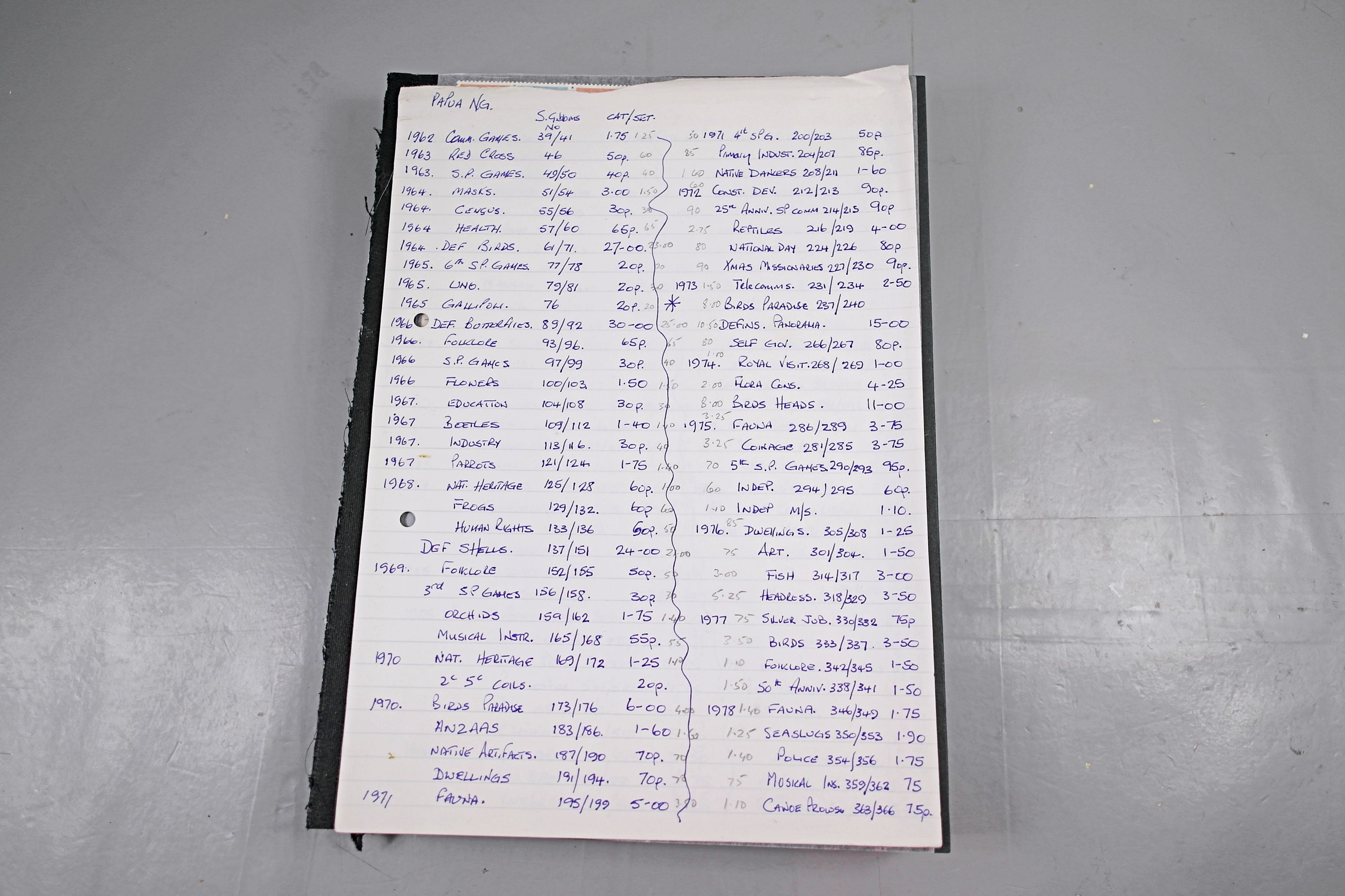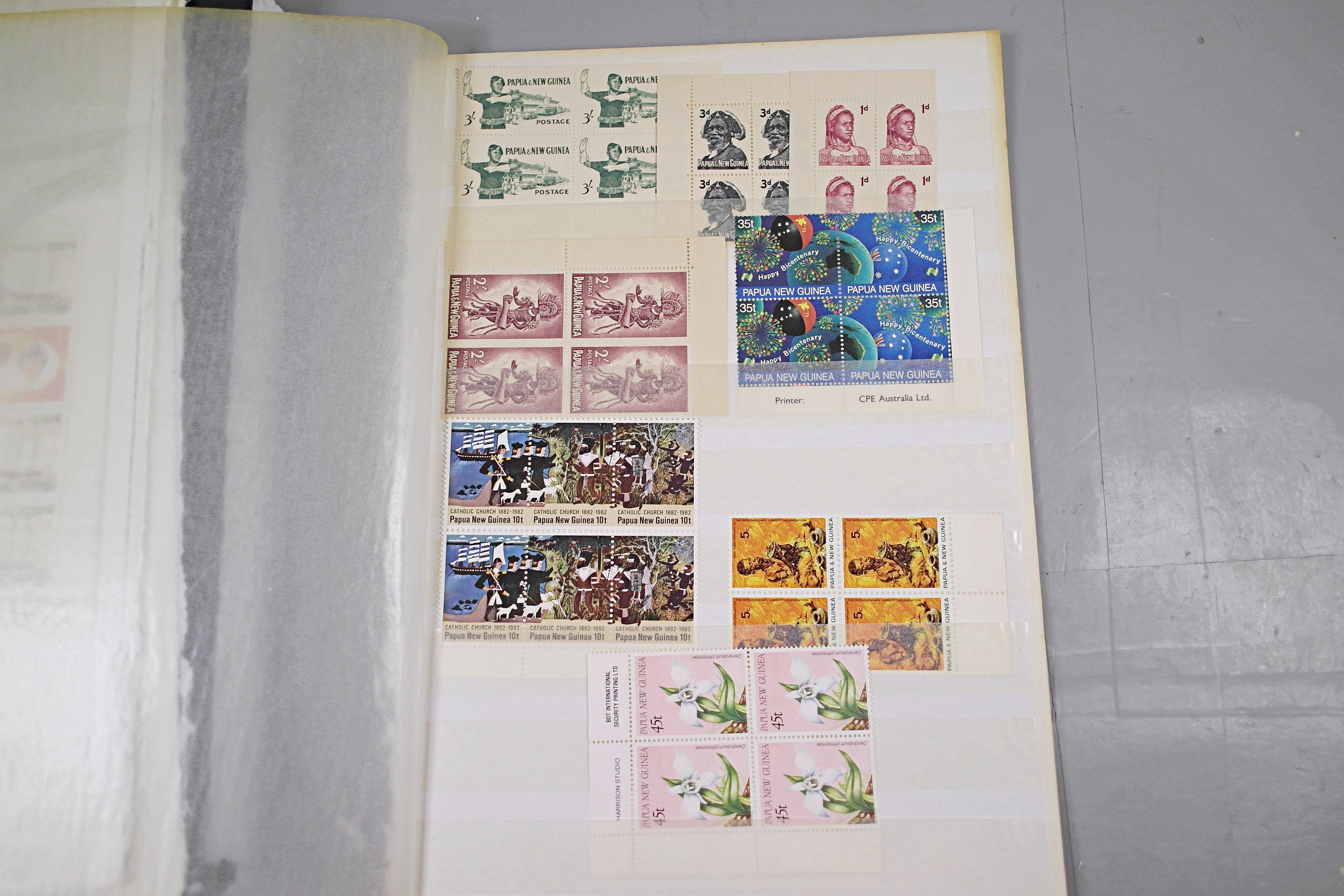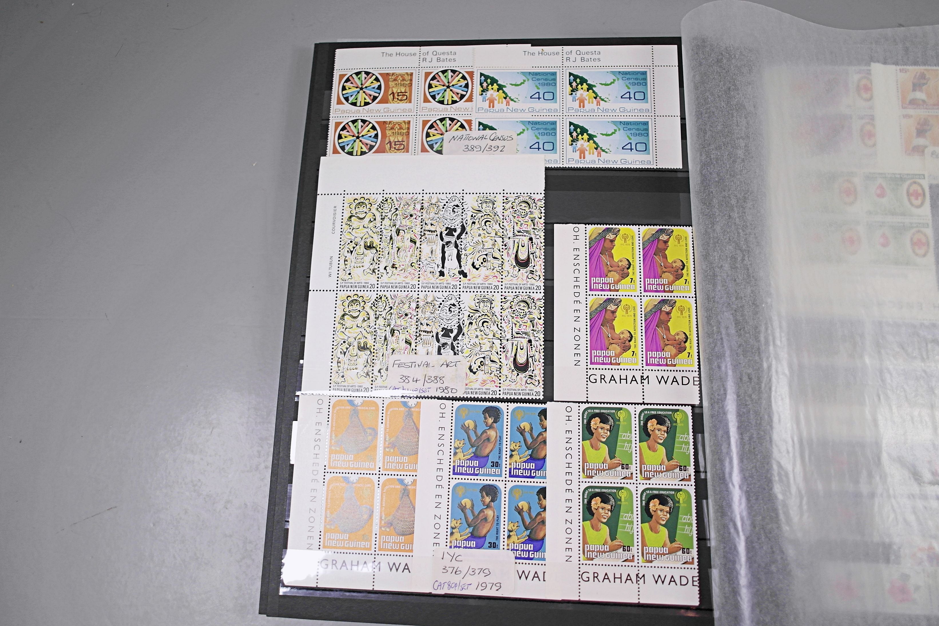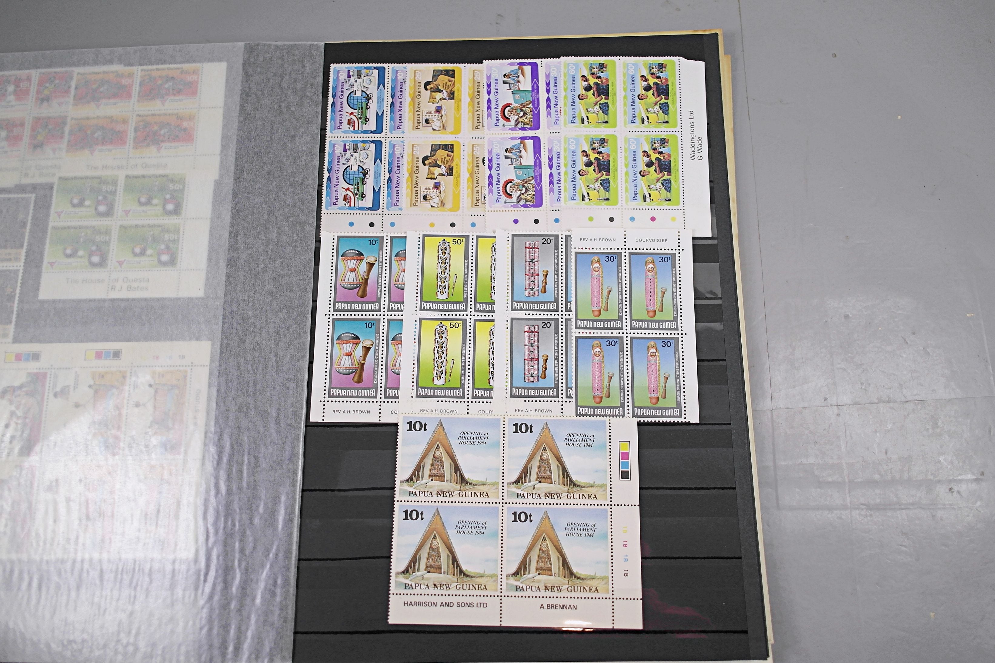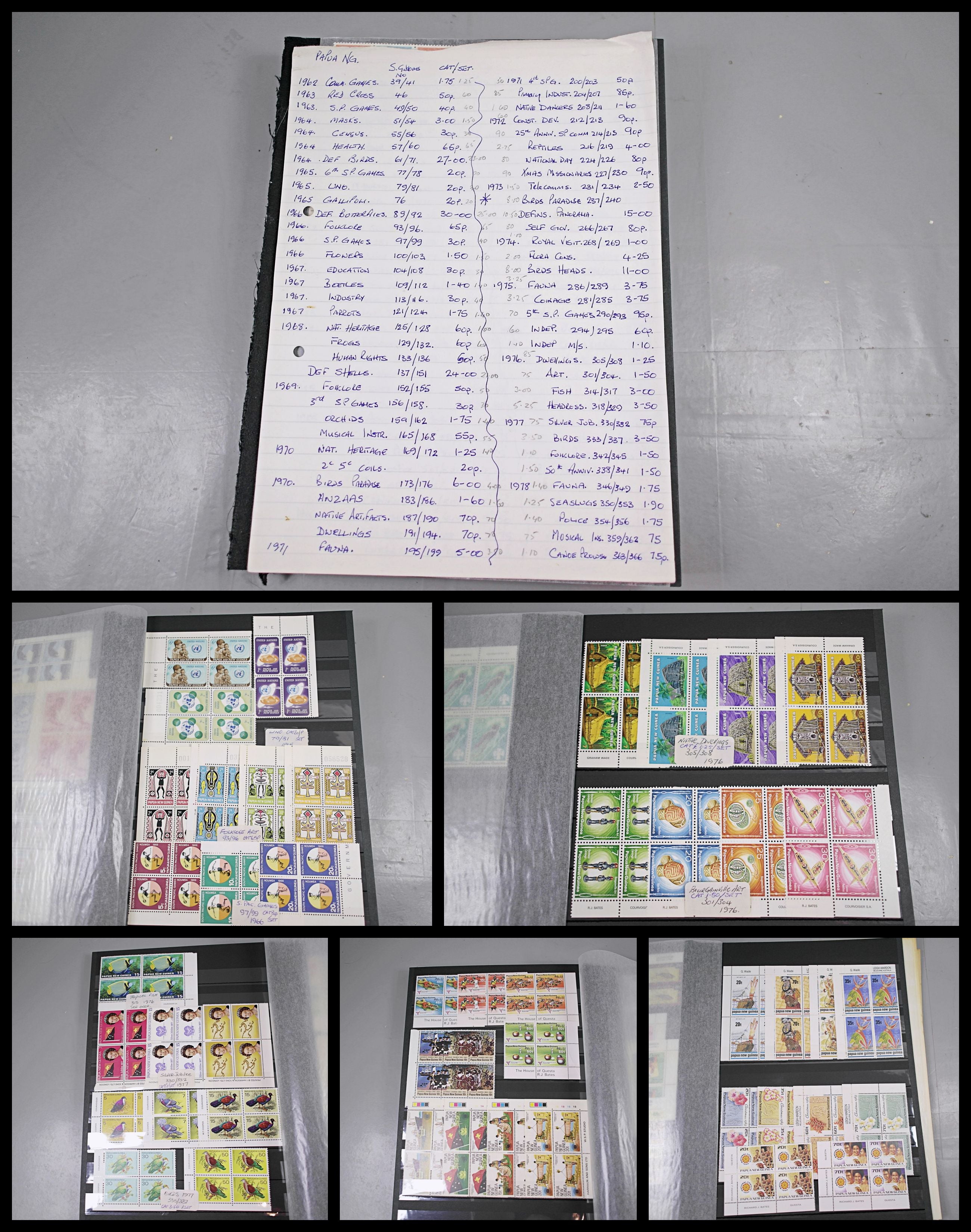 Large stockbook of Papua New Guinea stamps in full sets in Mint Never Hinged blocks of 4, most with sheet numbers or cylinder blocks. The collection ranges from 1963 to 1990. All sheets are in fresh condition. Many thematic stamps seen for animals, birds, people etc. Please view all 44 images closely.