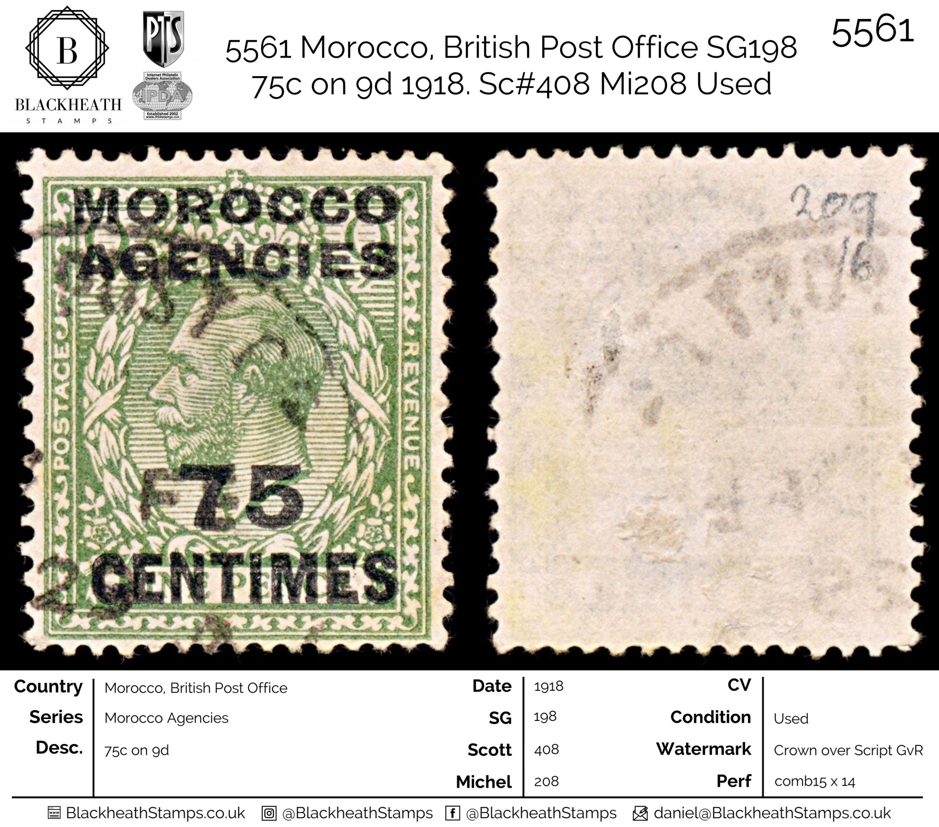 5561 Morocco, British Post Office SG198 75c on 9d 1918. Sc#408 Mi208 Used