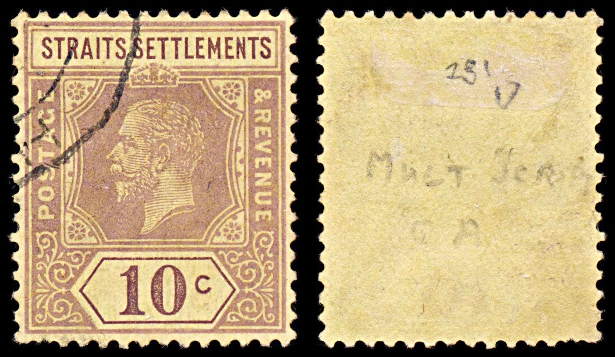 5771 Straits Settlements SG231 10c Violet on Yellow 1925. Sc#191a Mi181Ia Used. C£17