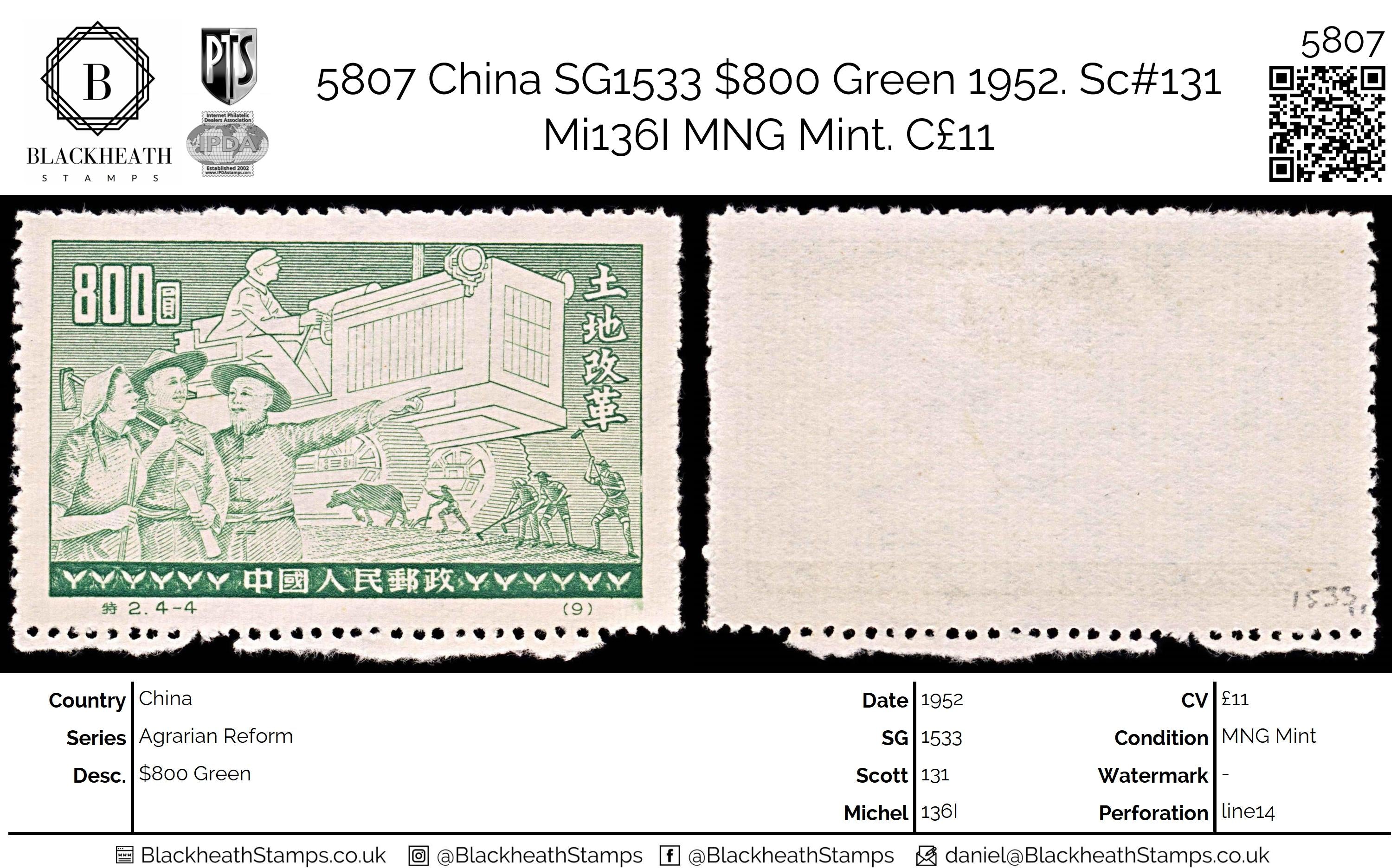 5807 China SG1533 $800 Green 1952. Sc#131 Mi136I MNG Mint. C£11