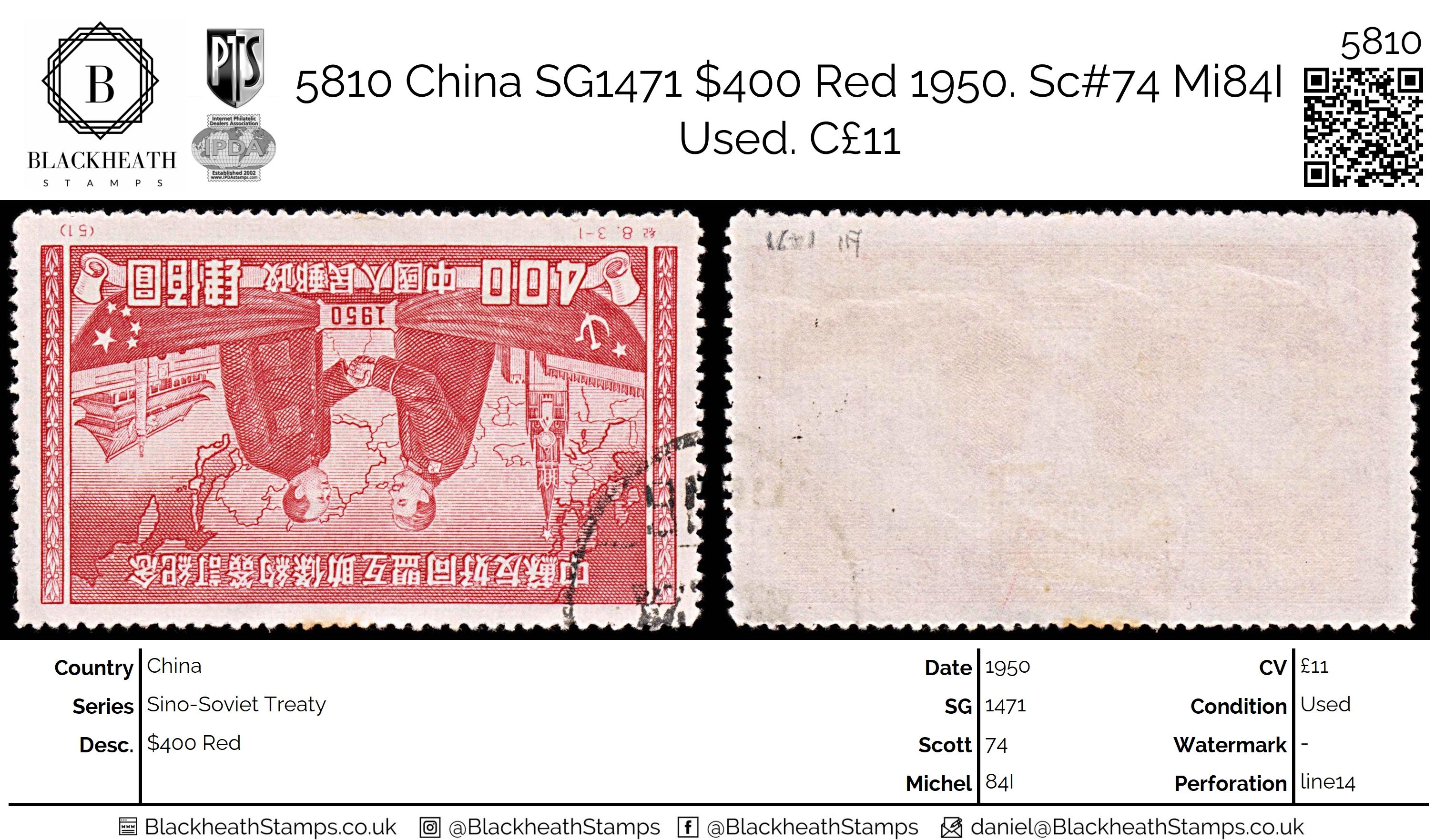 5810 China SG1471 $400 Red 1950. Sc#74 Mi84I Used. C£11