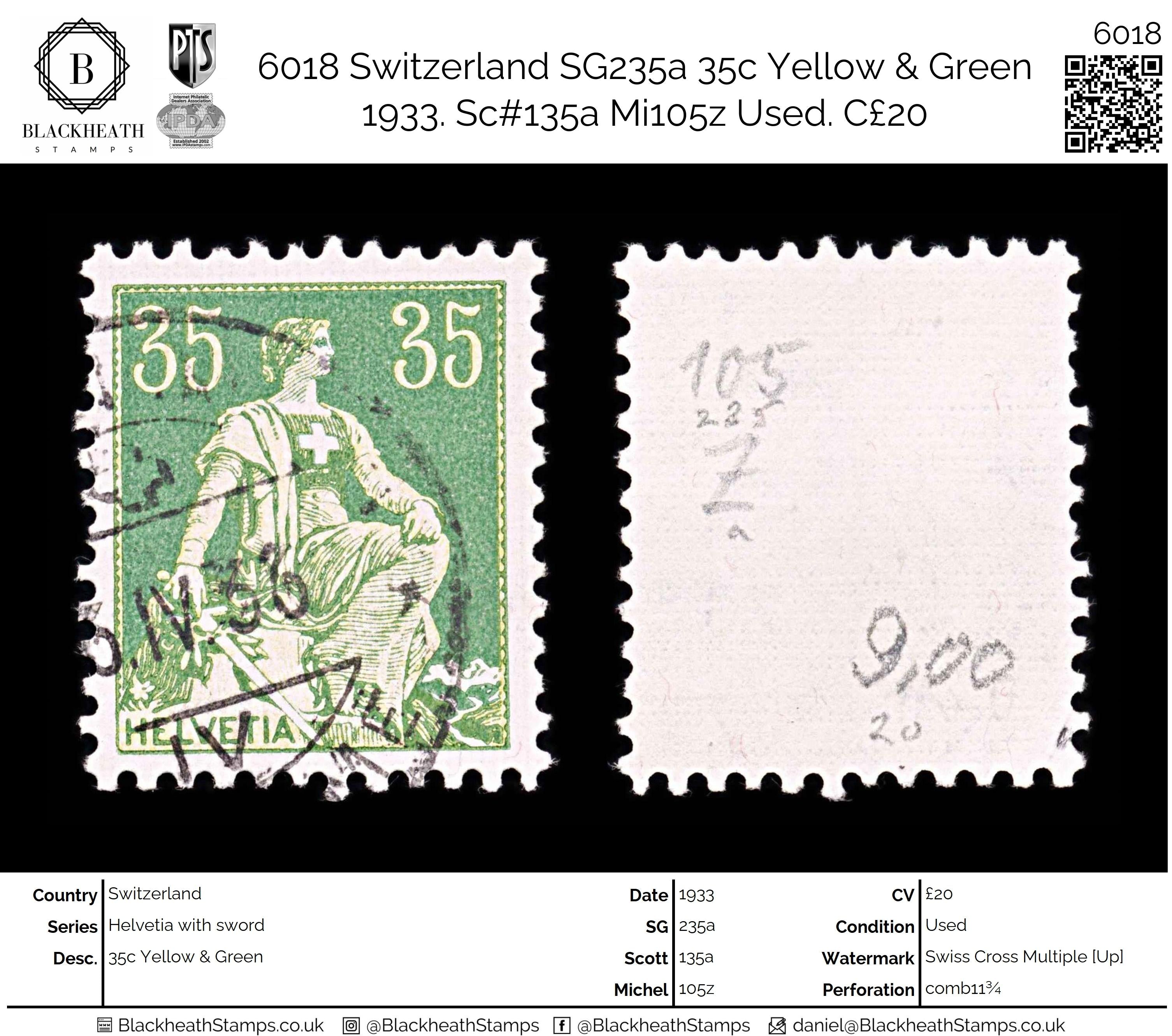 6018 Switzerland SG235a 35c Yellow & Green 1933. Sc#135a Mi105z Used. C£20