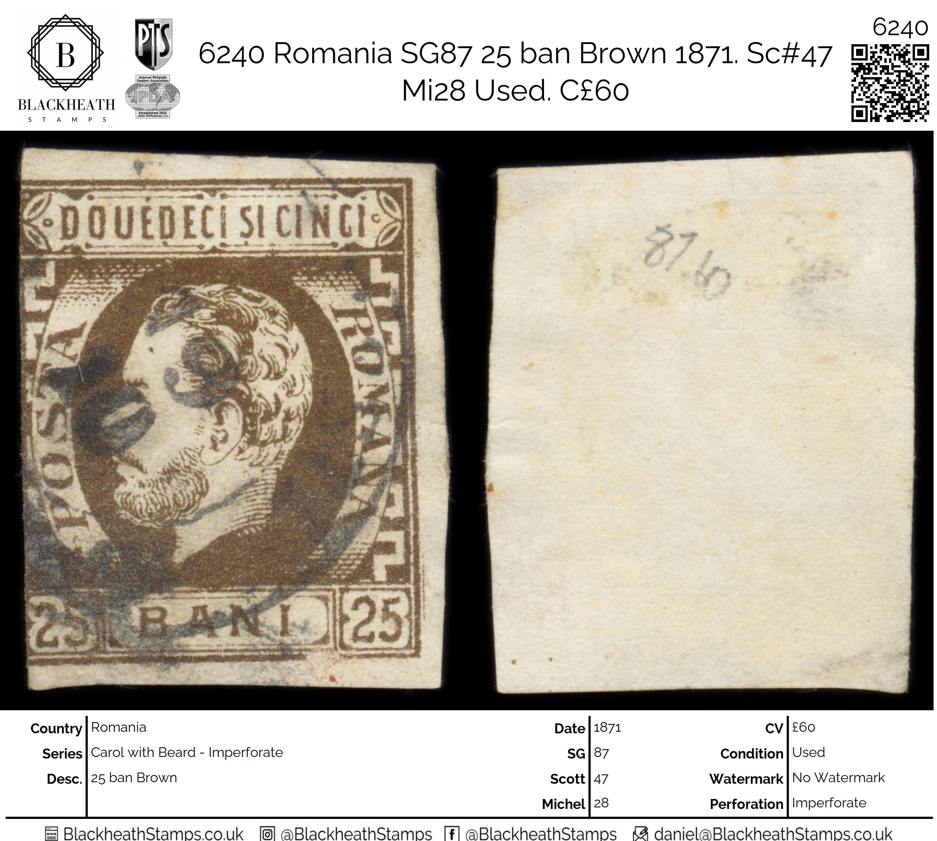 6240 Romania SG87 25 ban Brown 1871. Sc#47 Mi28 Used. C£60