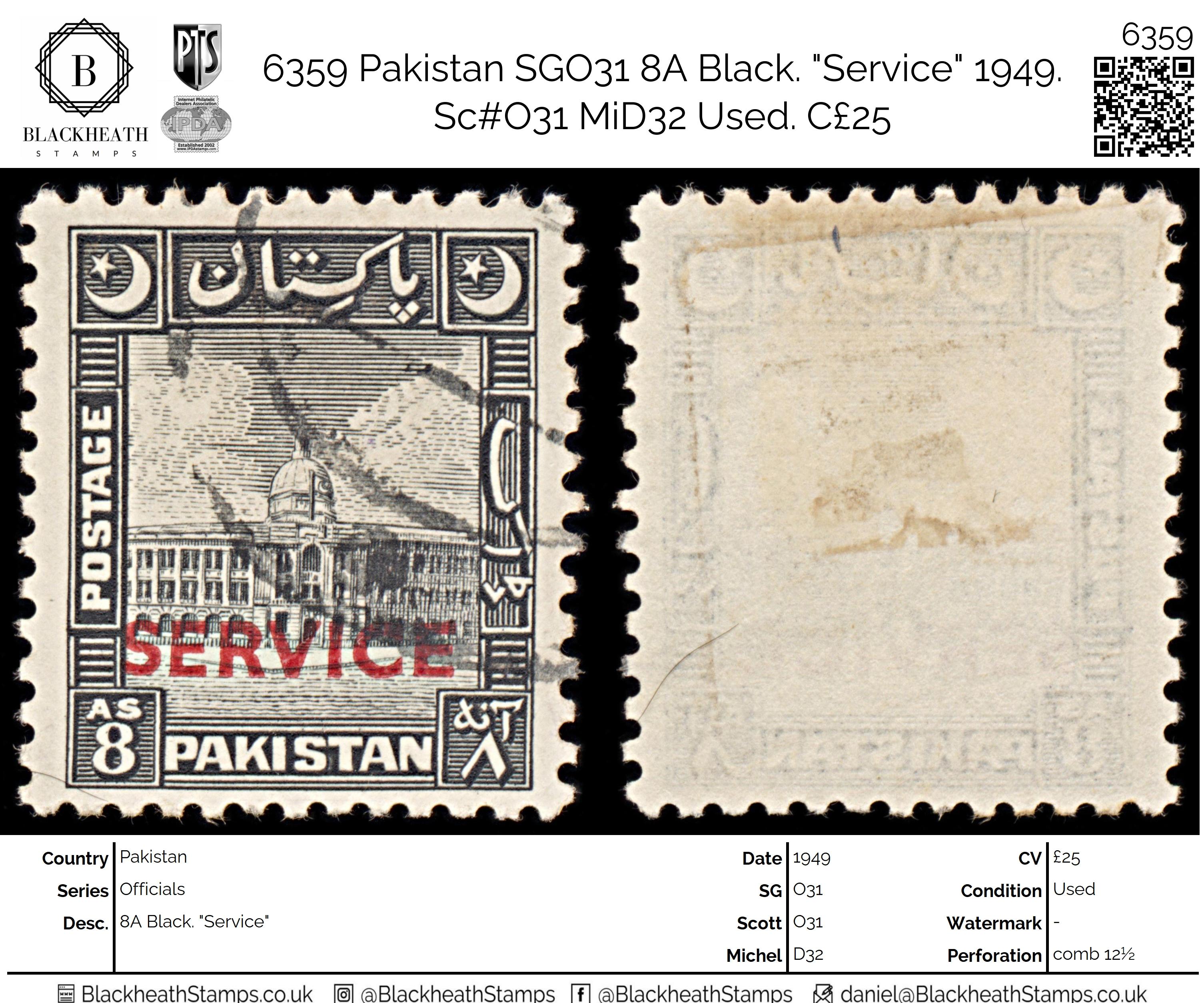 6359 Pakistan SGO31 8A Black. "Service" 1949. Sc#O31 MiD32 Used. C£25