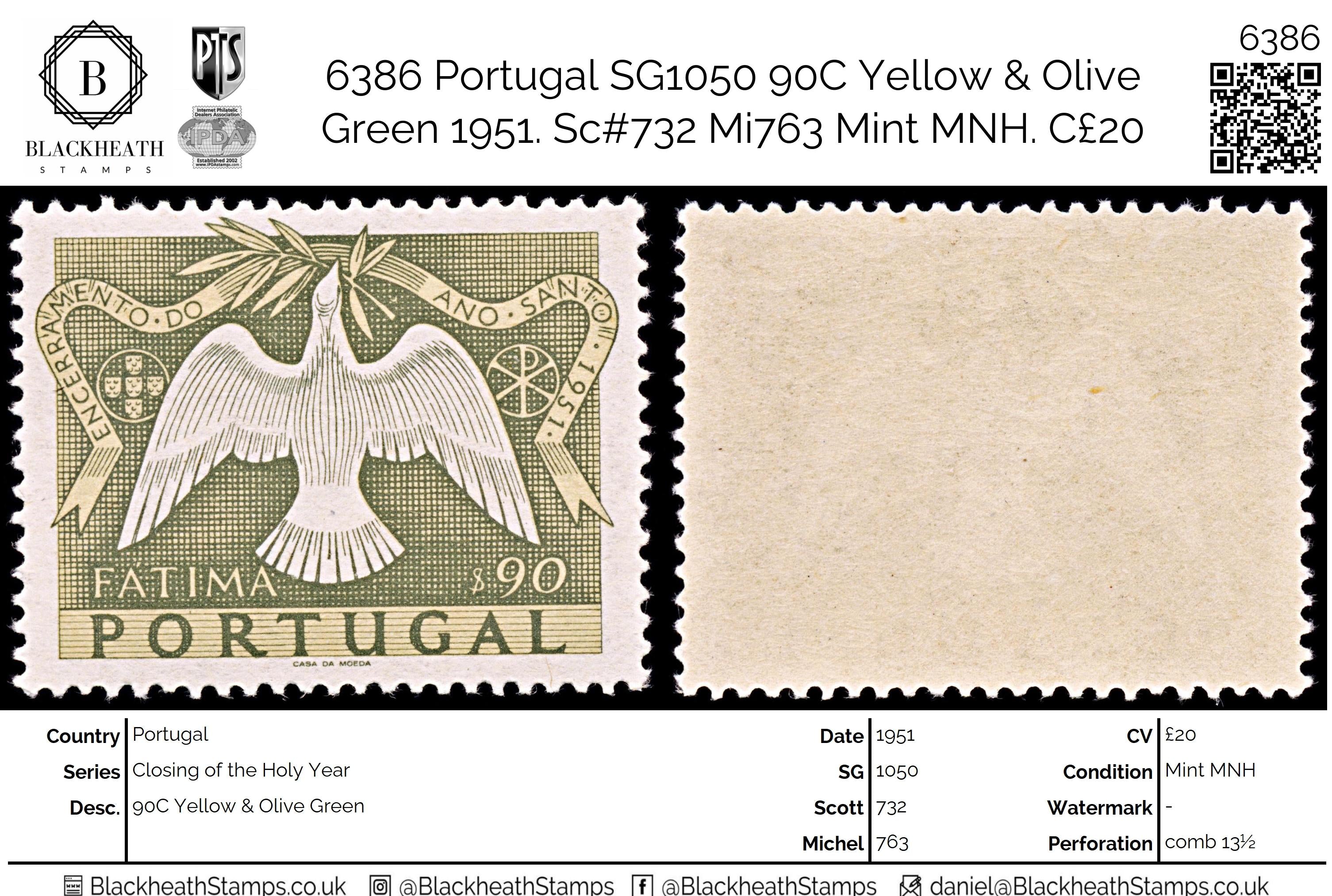 6386 Portugal SG1050 90C Yellow & Olive Green 1951. Sc#732 Mi763 Mint MNH. C£20: