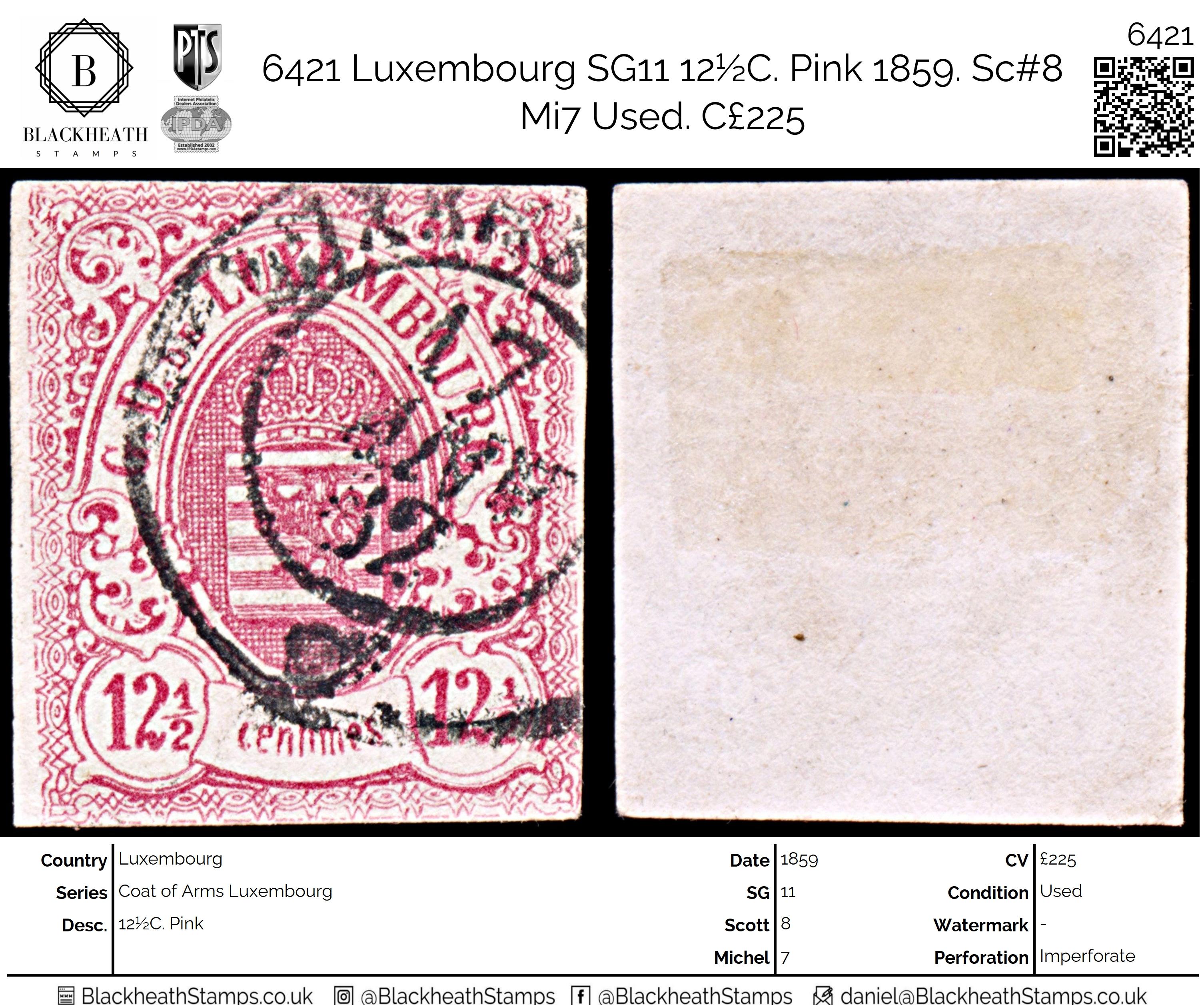 6421 Luxembourg SG11 12½C. Pink 1859. Sc#8 Mi7 Used. C£225