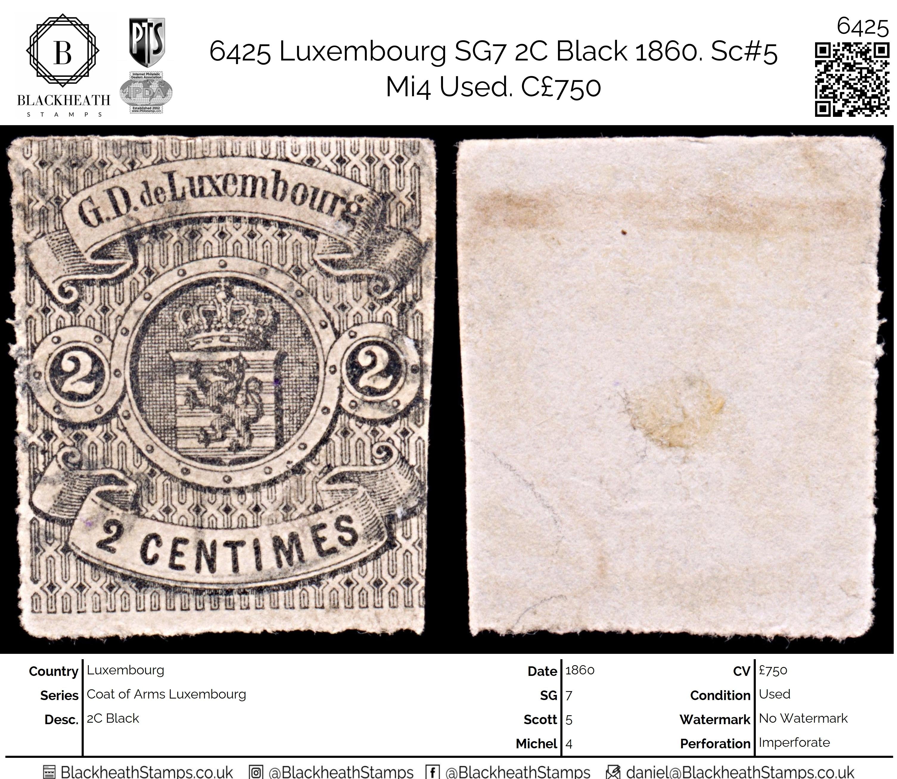 6425 Luxembourg SG7 2C Black 1860. Sc#5 Mi4 Used. C£750