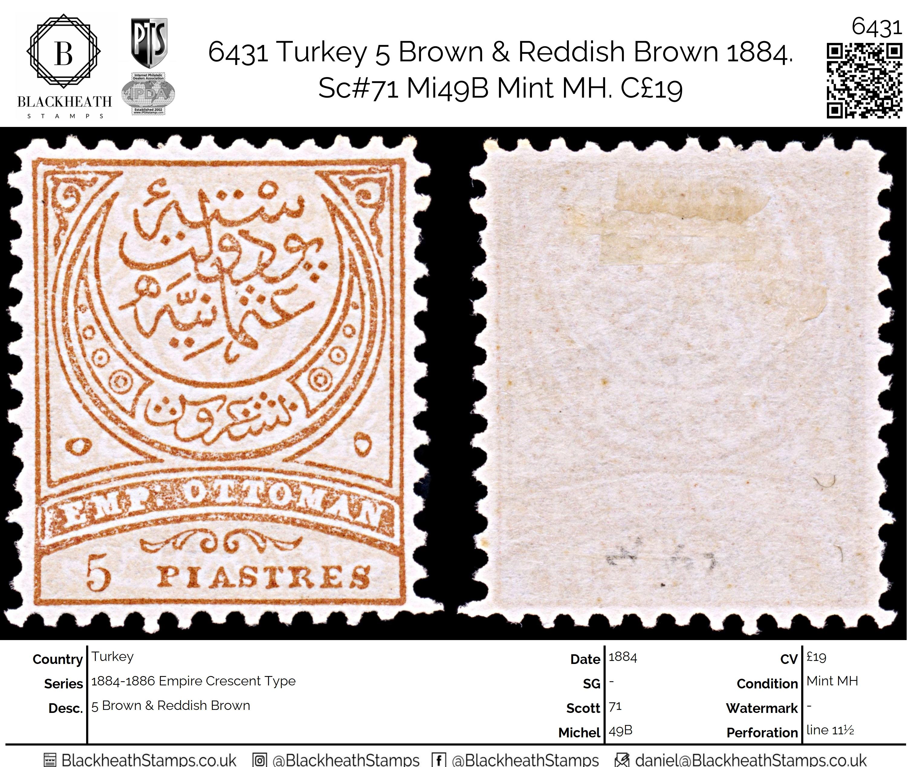 6431 Turkey 5 Brown & Reddish Brown 1884. Sc#71 Mi49B Mint MH. C£19