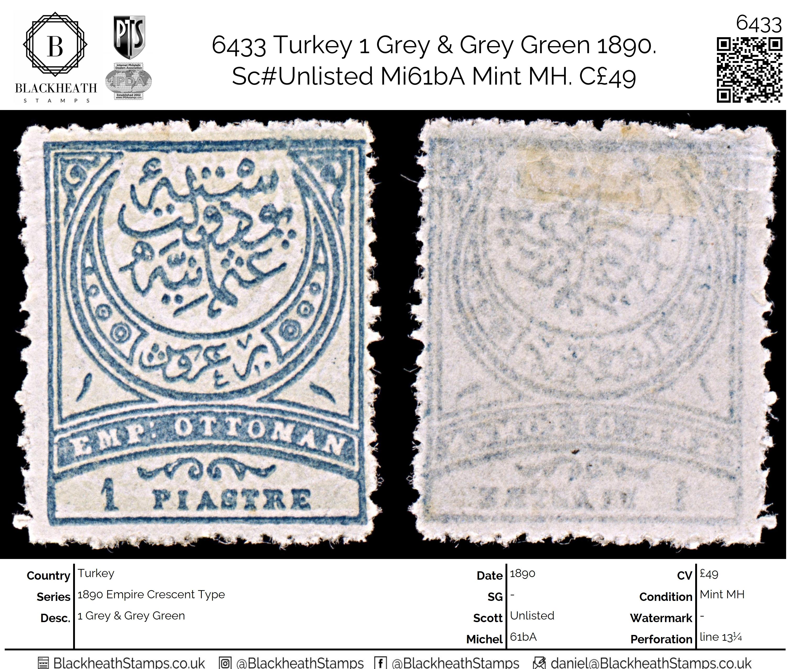 6433 Turkey 1 Grey & Grey Green 1890. Sc#Unlisted Mi61bA Mint MH. C£49
