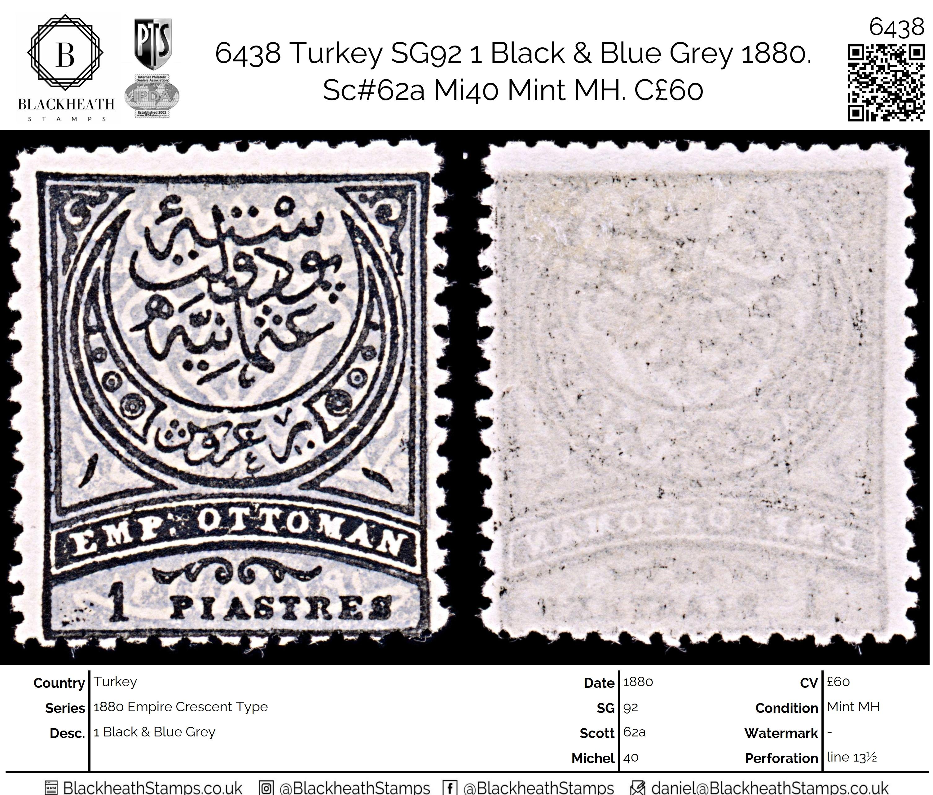 6438 Turkey SG92 1 Black & Blue Grey 1880. Sc#62a Mi40 Mint MH. C£60