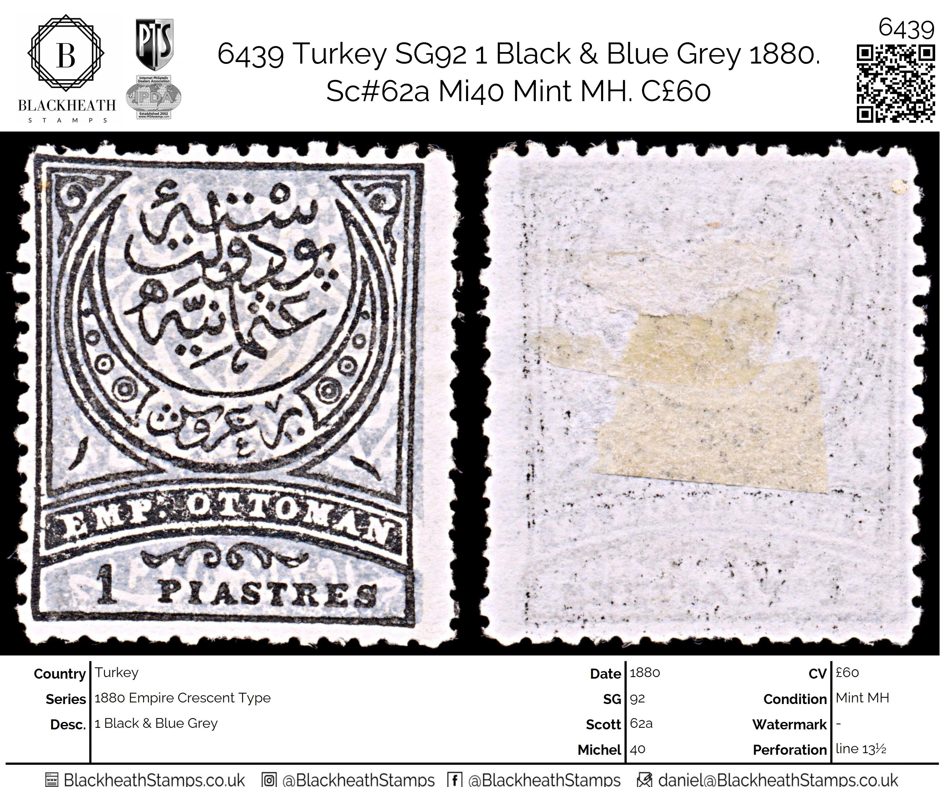 6439 Turkey SG92 1 Black & Blue Grey 1880. Sc#62a Mi40 Mint MH. C£60