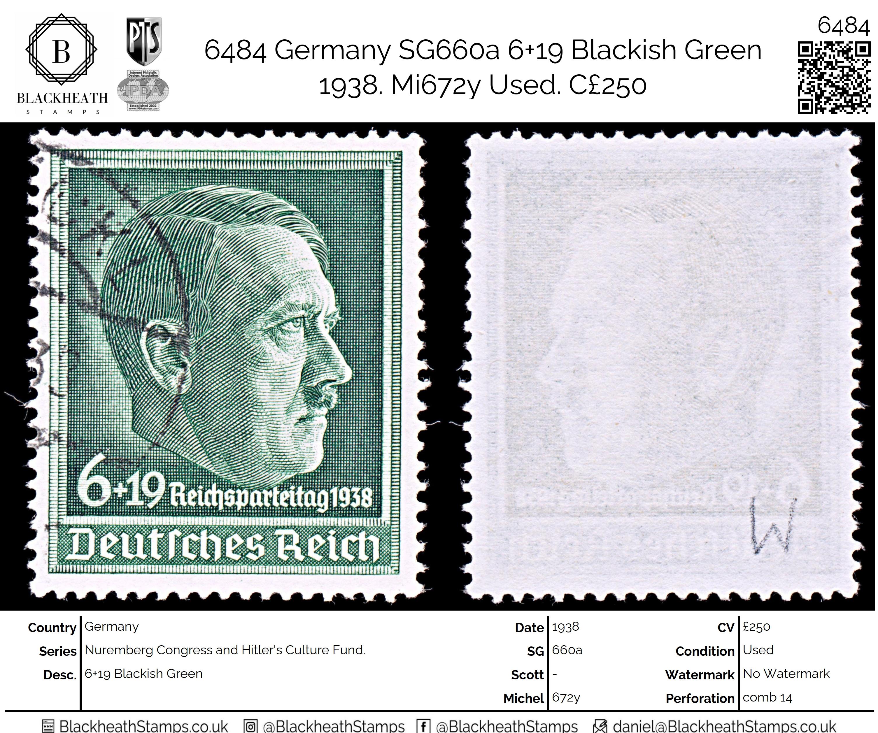 6484 Germany SG660a 6+19 Blackish Green 1938. Mi672y Uséd. C£250: