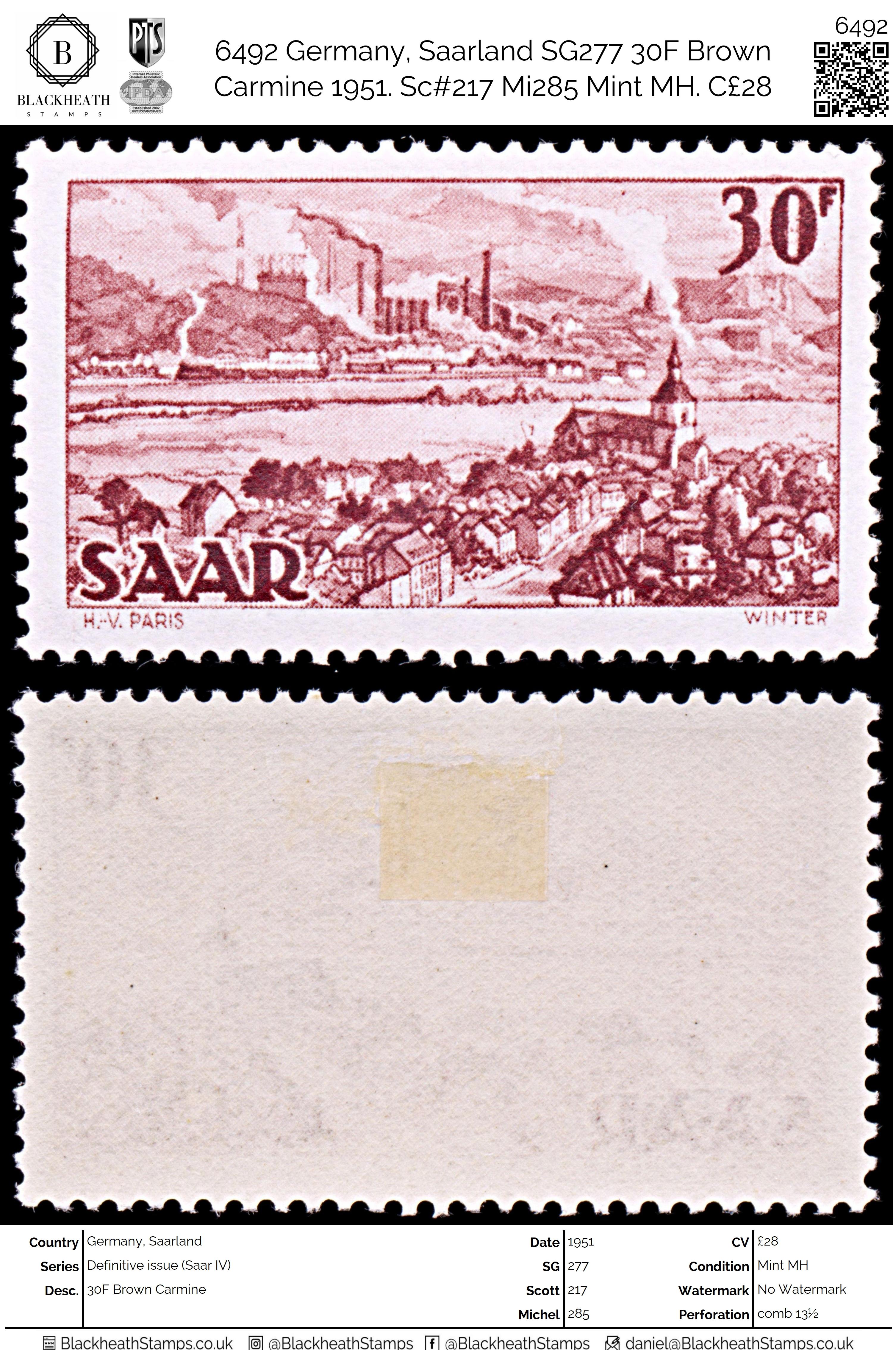 6492 Germany, Saarland SG277 30F Brown Carmine 1951. Sc#217 Mi285 Mint MH. C£28