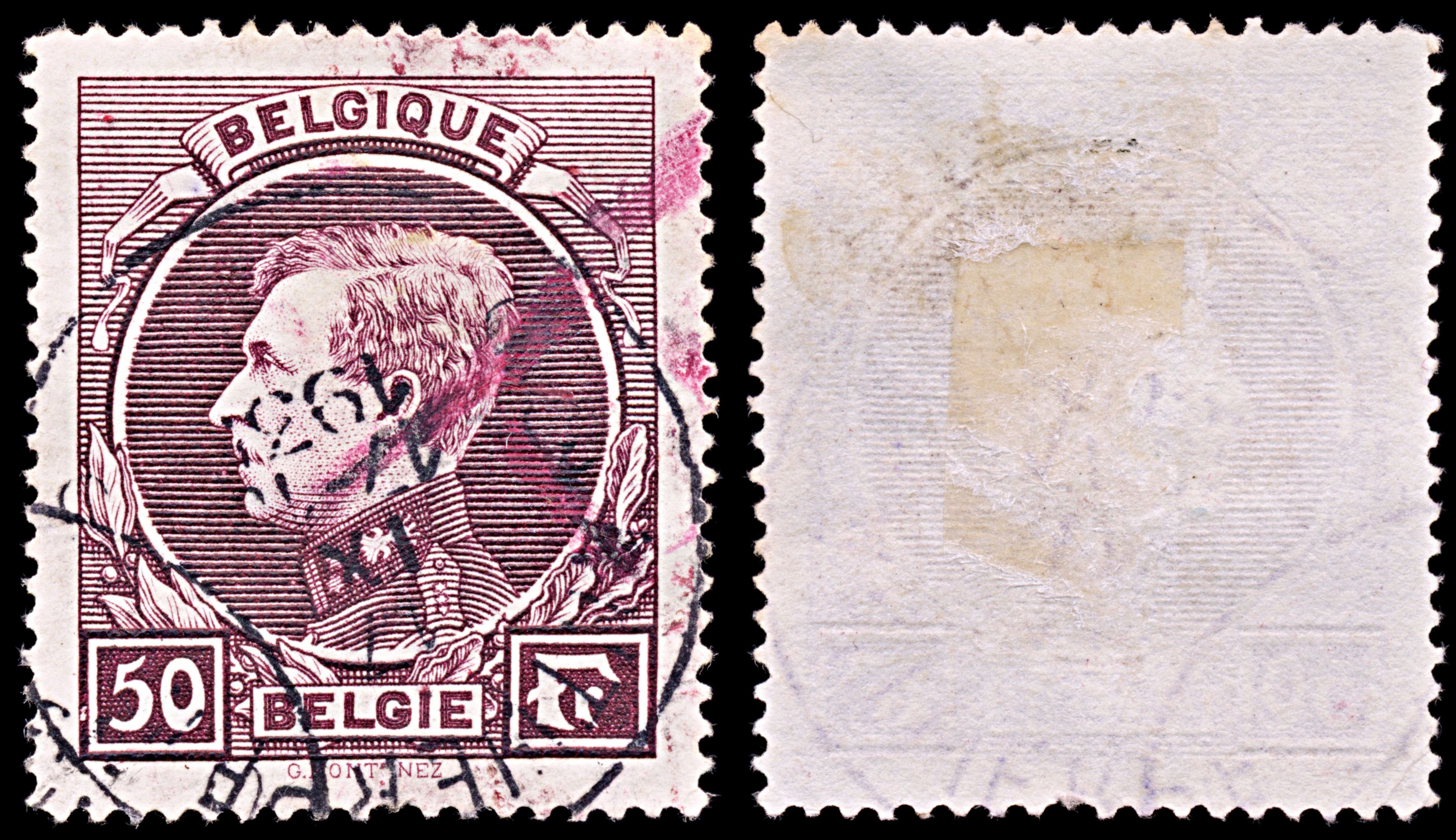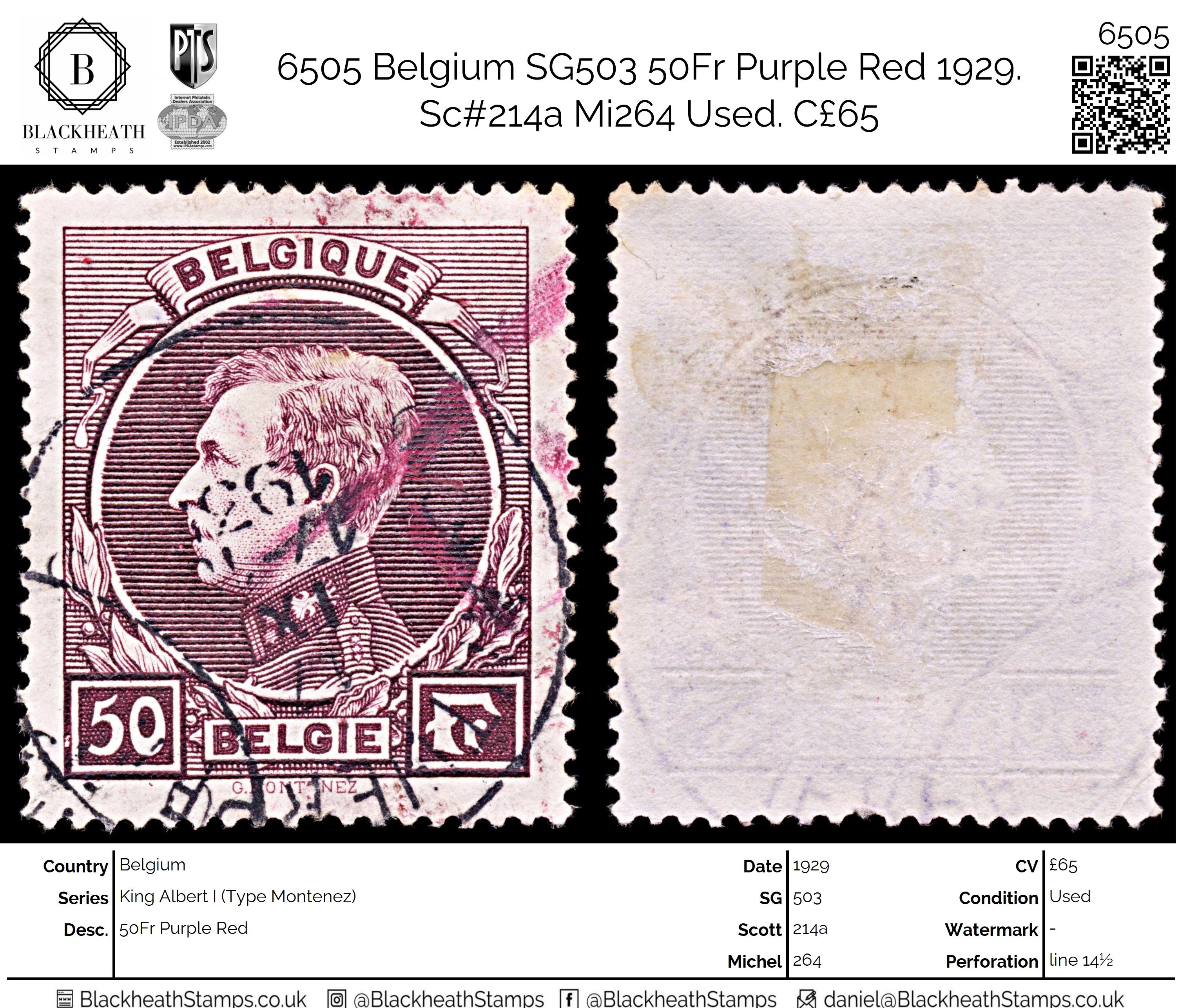 6505 Belgium SG503 50Fr Purple Red 1929. Sc#214a Mi264 Uséd. C£65: