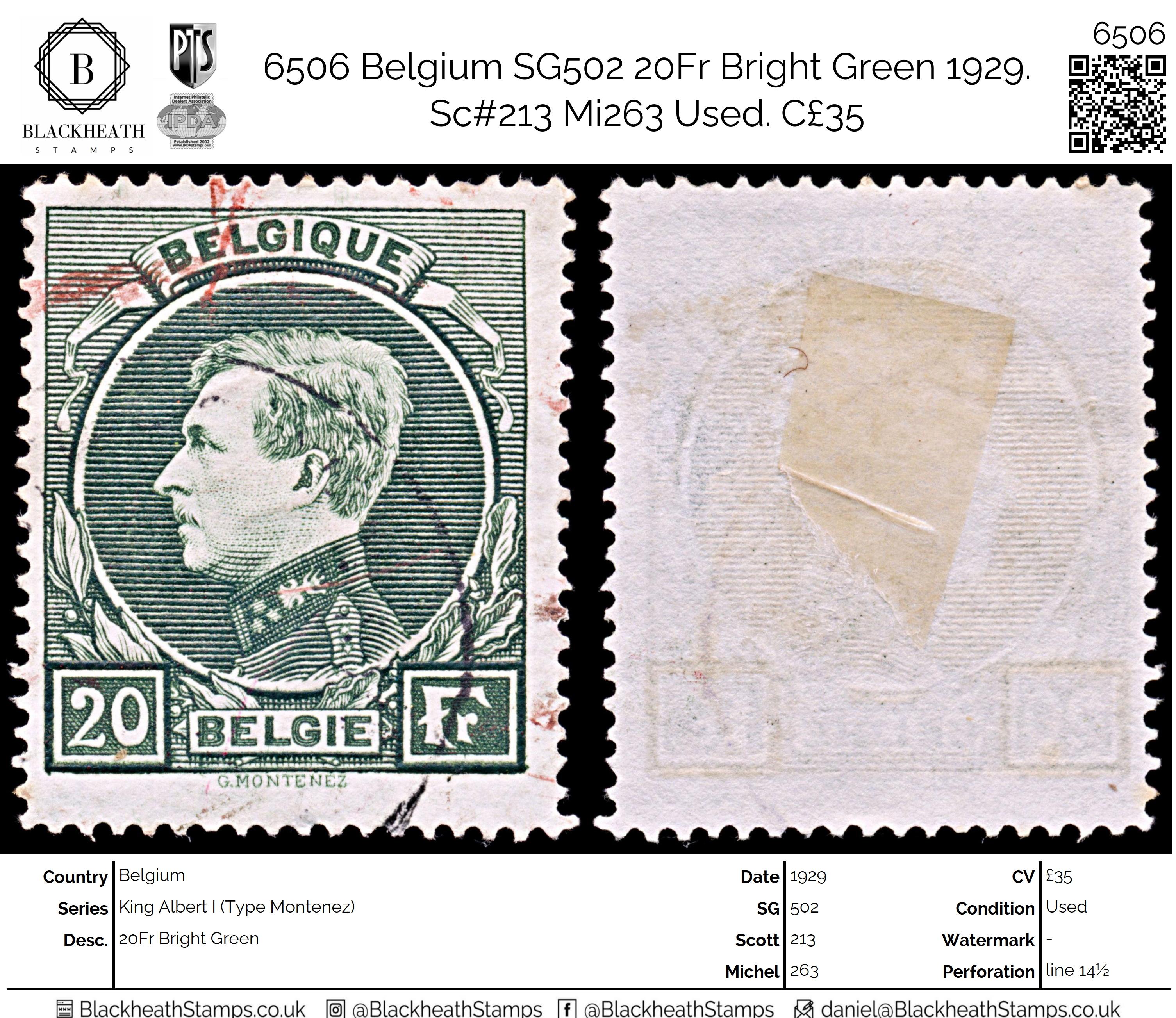 6506 Belgium SG502 20Fr Bright Green 1929. Sc#213 Mi263 Used. C£35