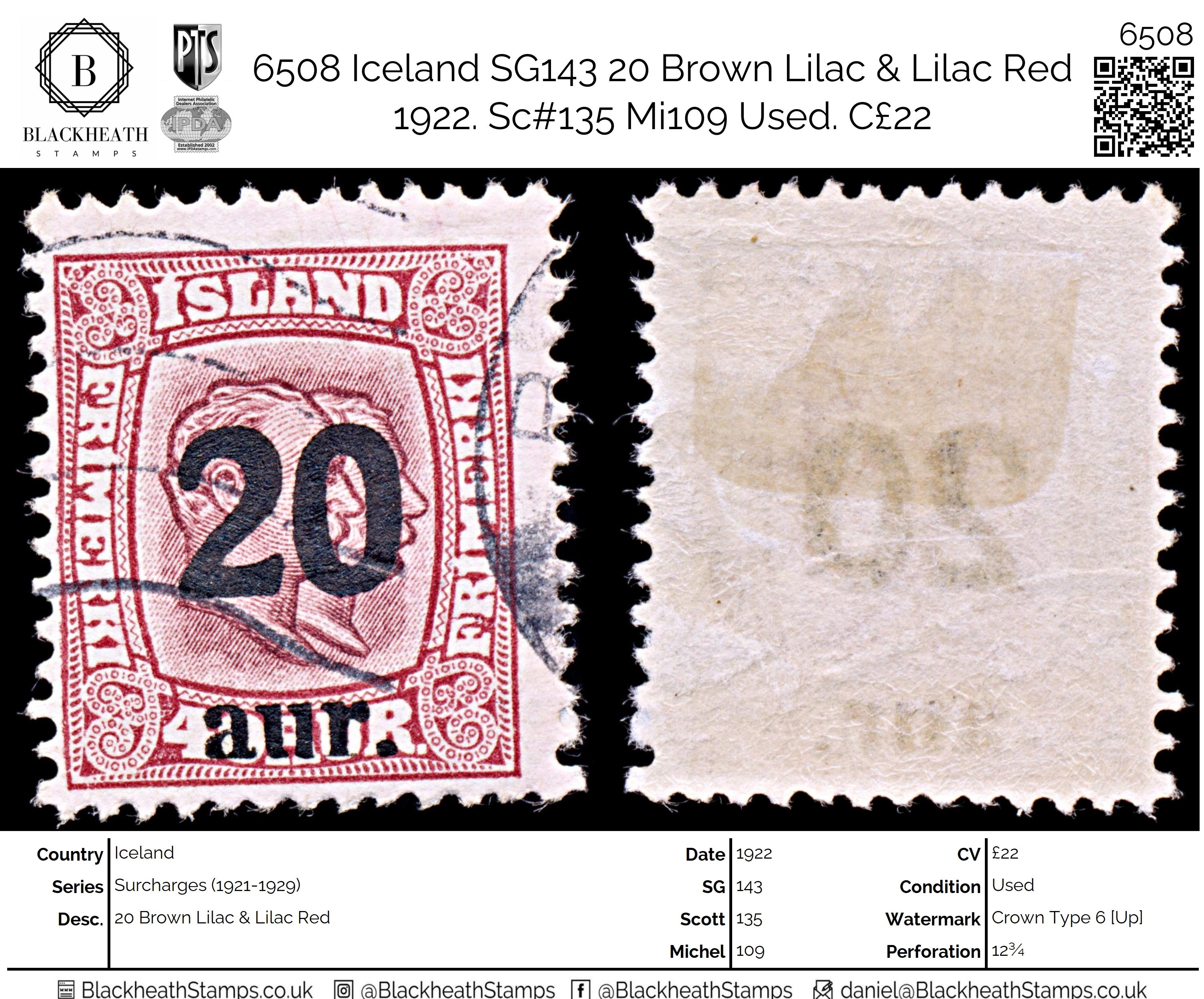 6508 Iceland SG143 20 Brown Lilac & Lilac Red 1922. Sc#135 Mi109 Used. C£22