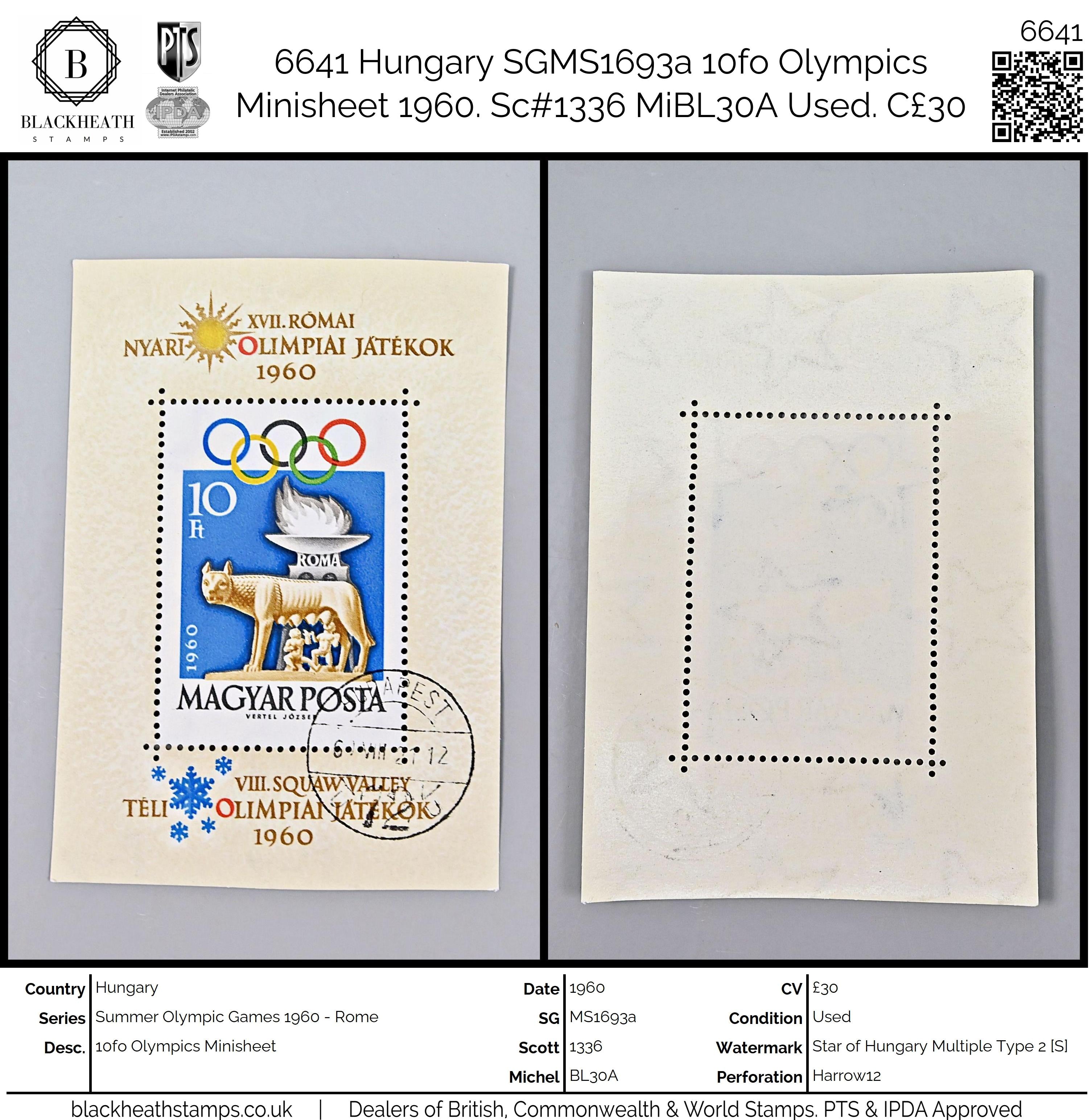 6641 Hungary SGMS1693a 10fo Olympics Minisheet 1960. Sc#1336 MiBL30A Used. C£30