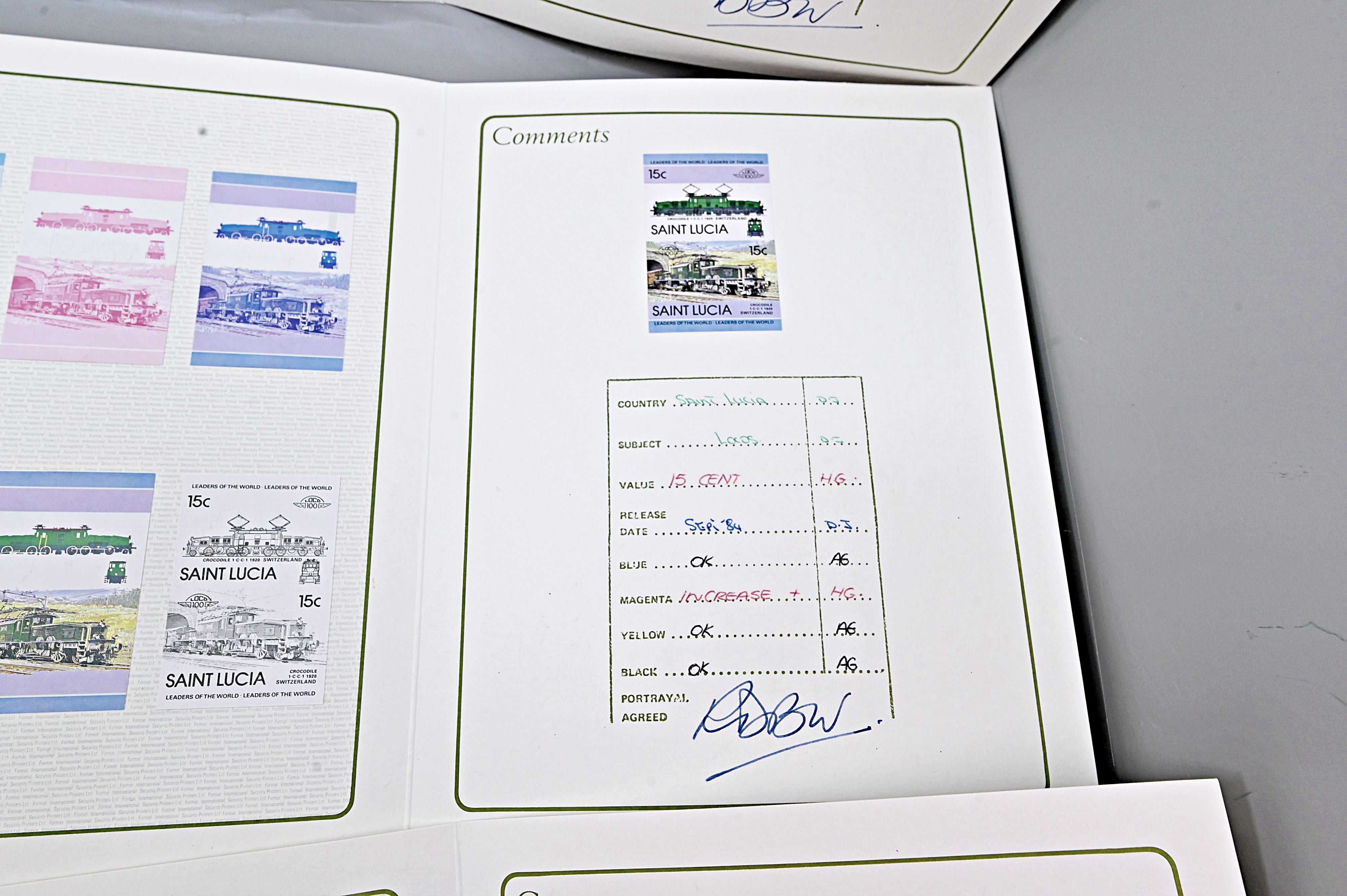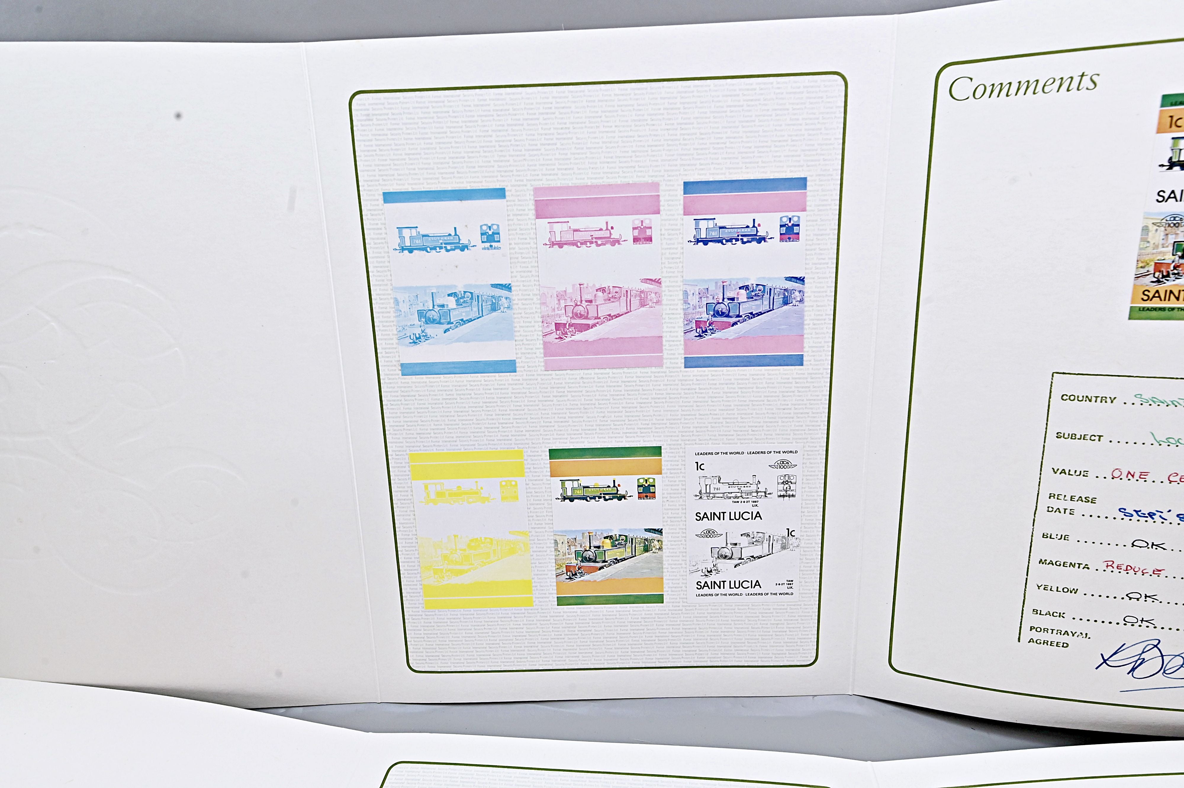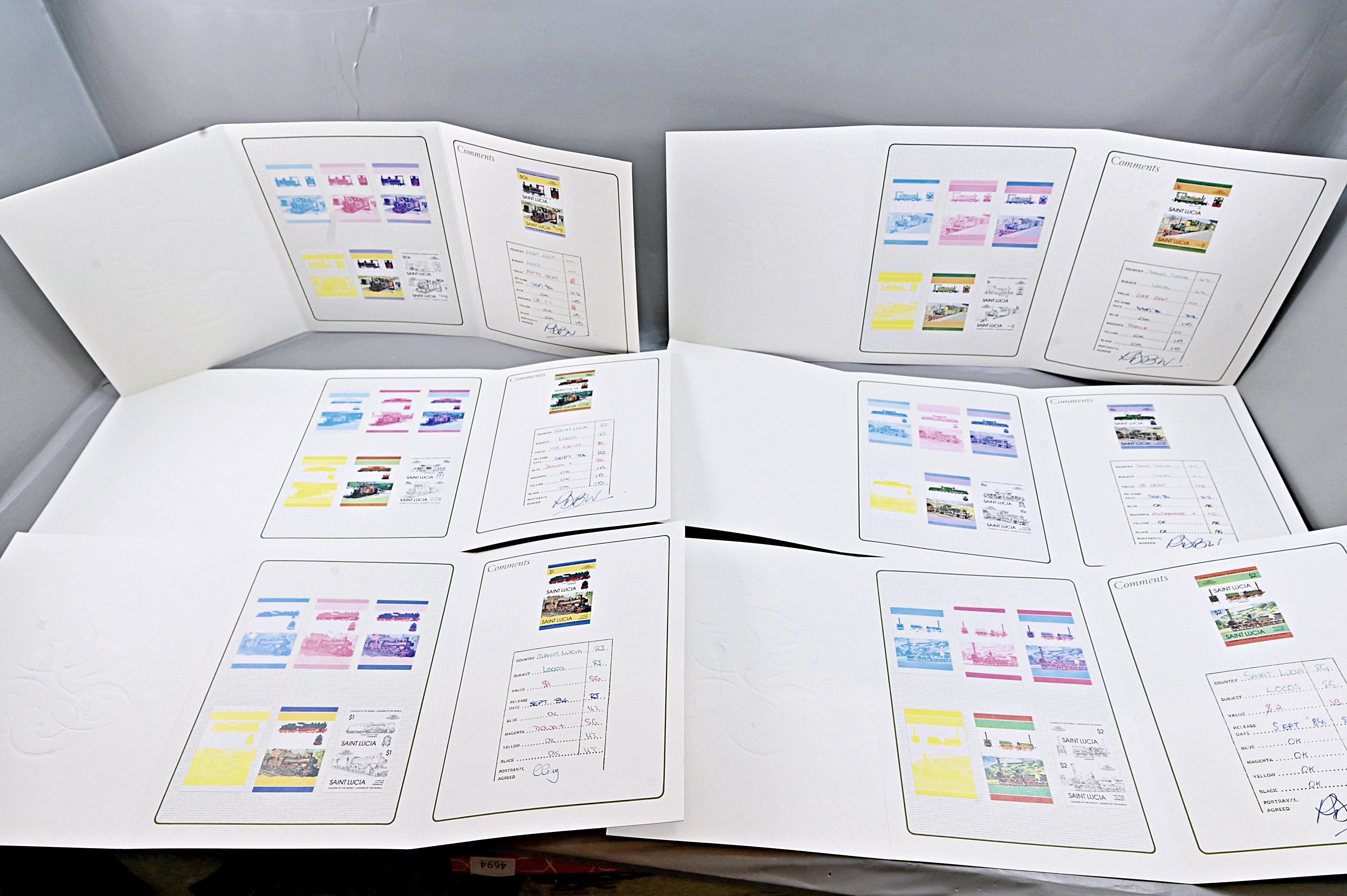 6704 St. Lucia Progressive Colour Proof Packs. Hand Signed 1984. : 1984 St. Lucia "Progressive Colour Proofs" full imperf sets for each stamp for "Leaders of the World Locomotives" issue. Hand written notes for colour profiles, as well as hand signed by the Proofer. Please vieww all 17 images closely