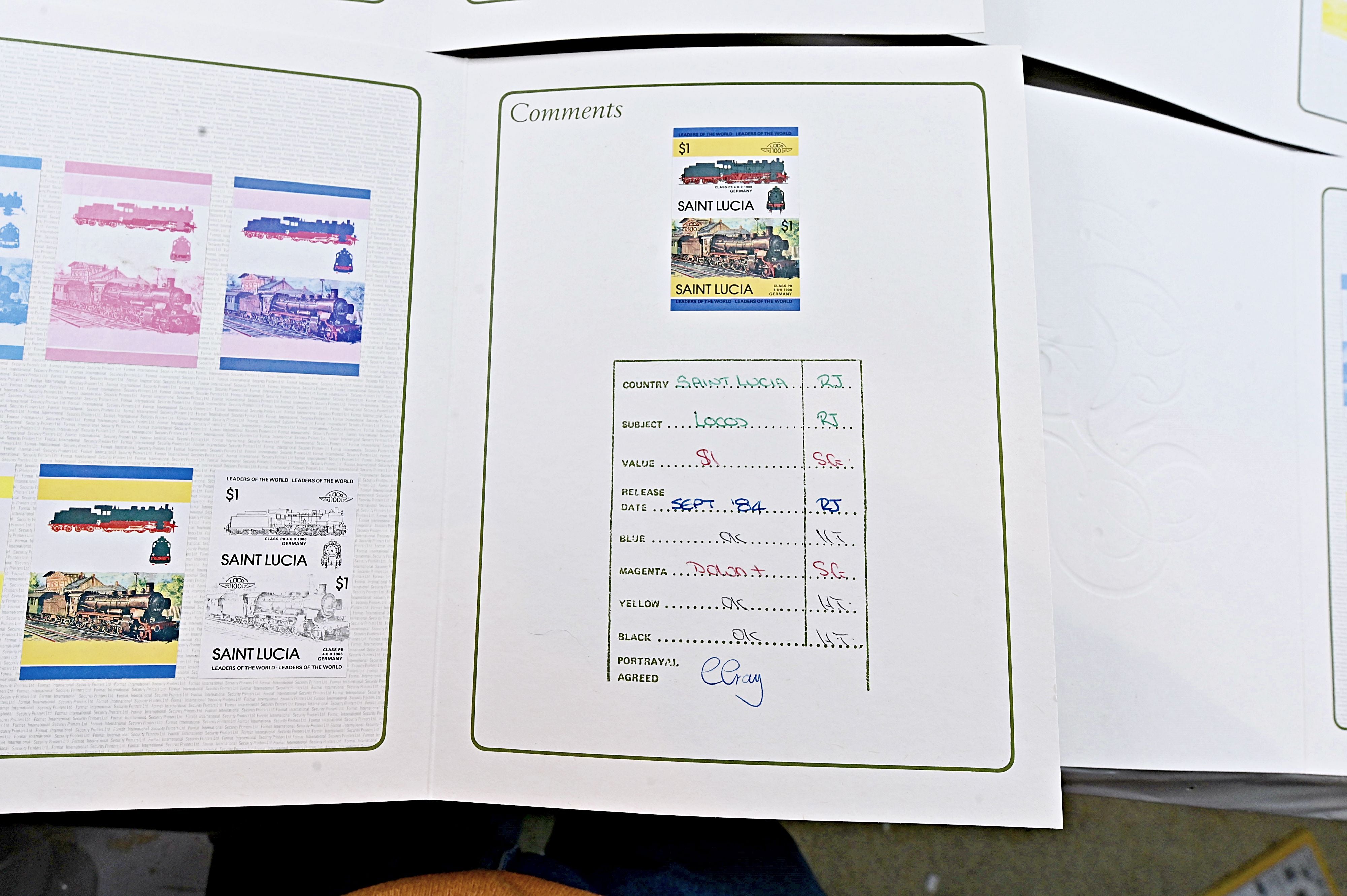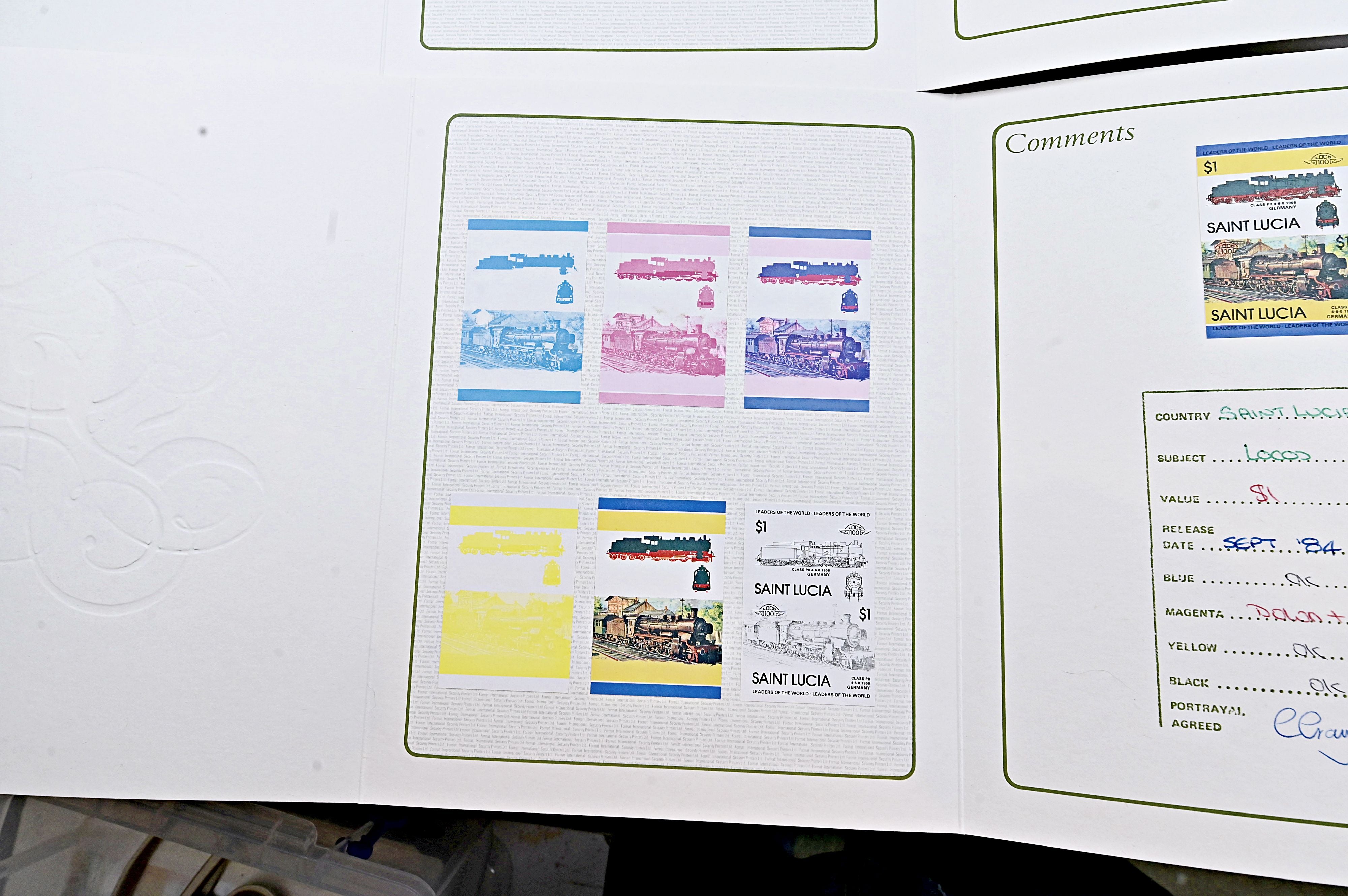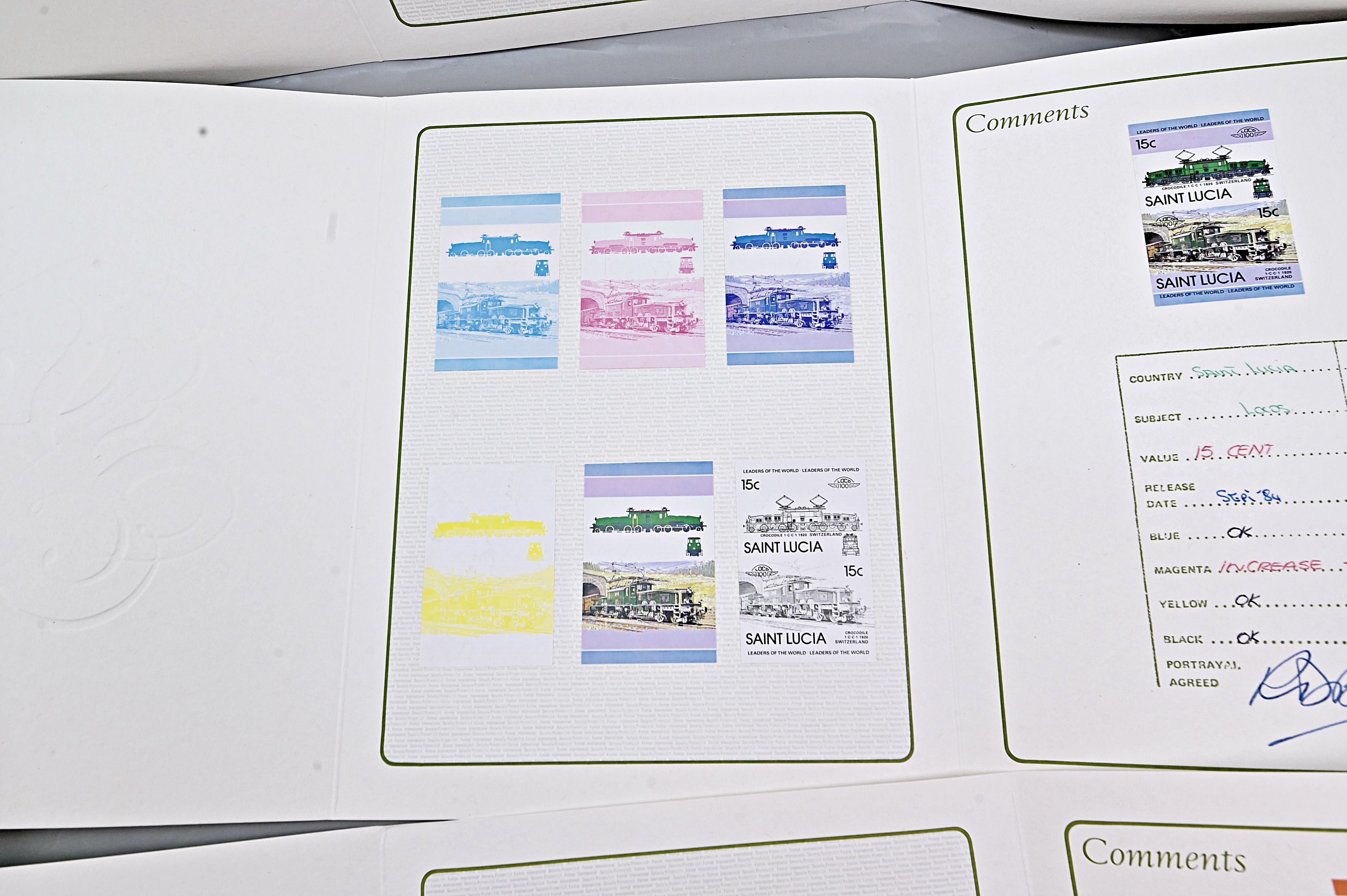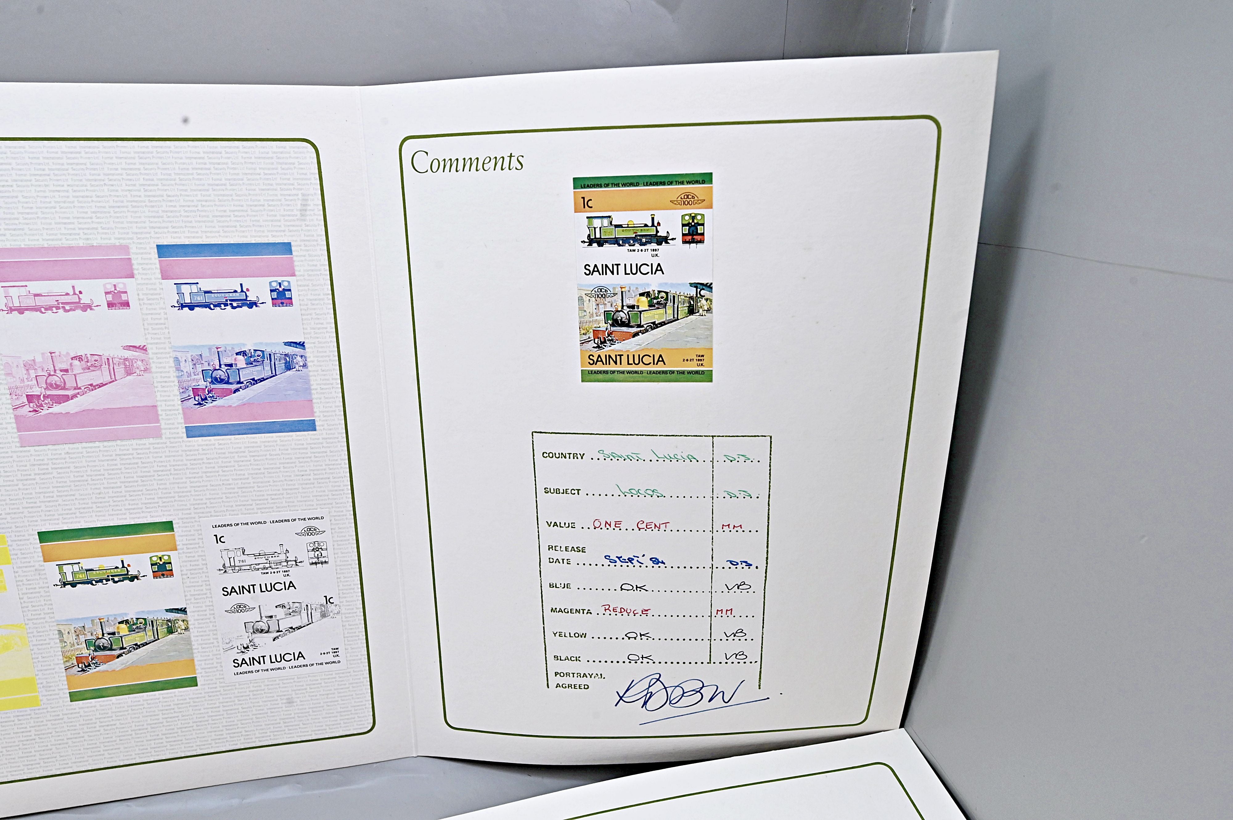 6704 St. Lucia Progressive Colour Proof Packs. Hand Signed 1984. : 1984 St. Lucia "Progressive Colour Proofs" full imperf sets for each stamp for "Leaders of the World Locomotives" issue. Hand written notes for colour profiles, as well as hand signed by the Proofer. Please vieww all 17 images closely