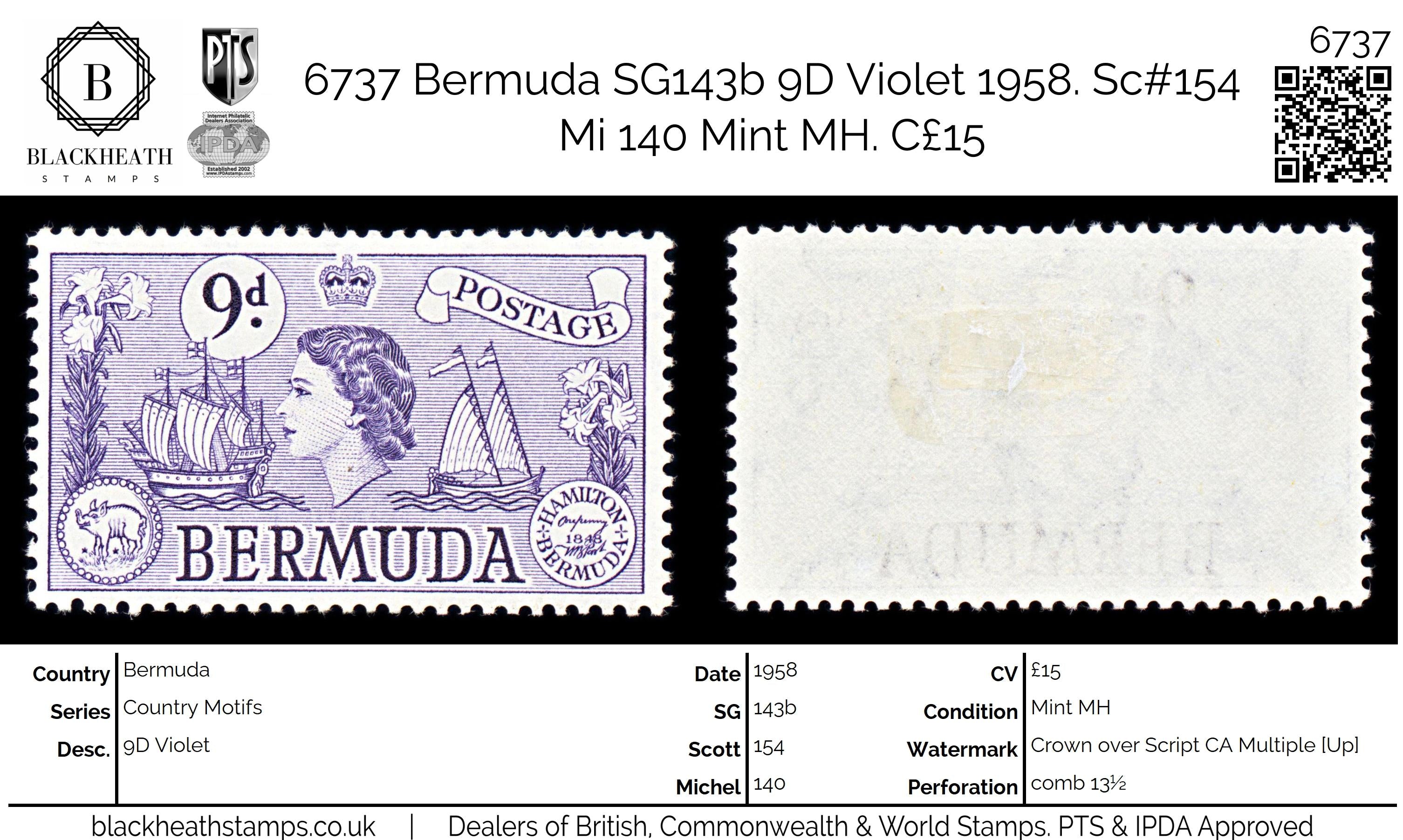 6737 Bermuda SG143b 9D Violet 1958. Sc#154 Mi 140 Mint MH. C£15