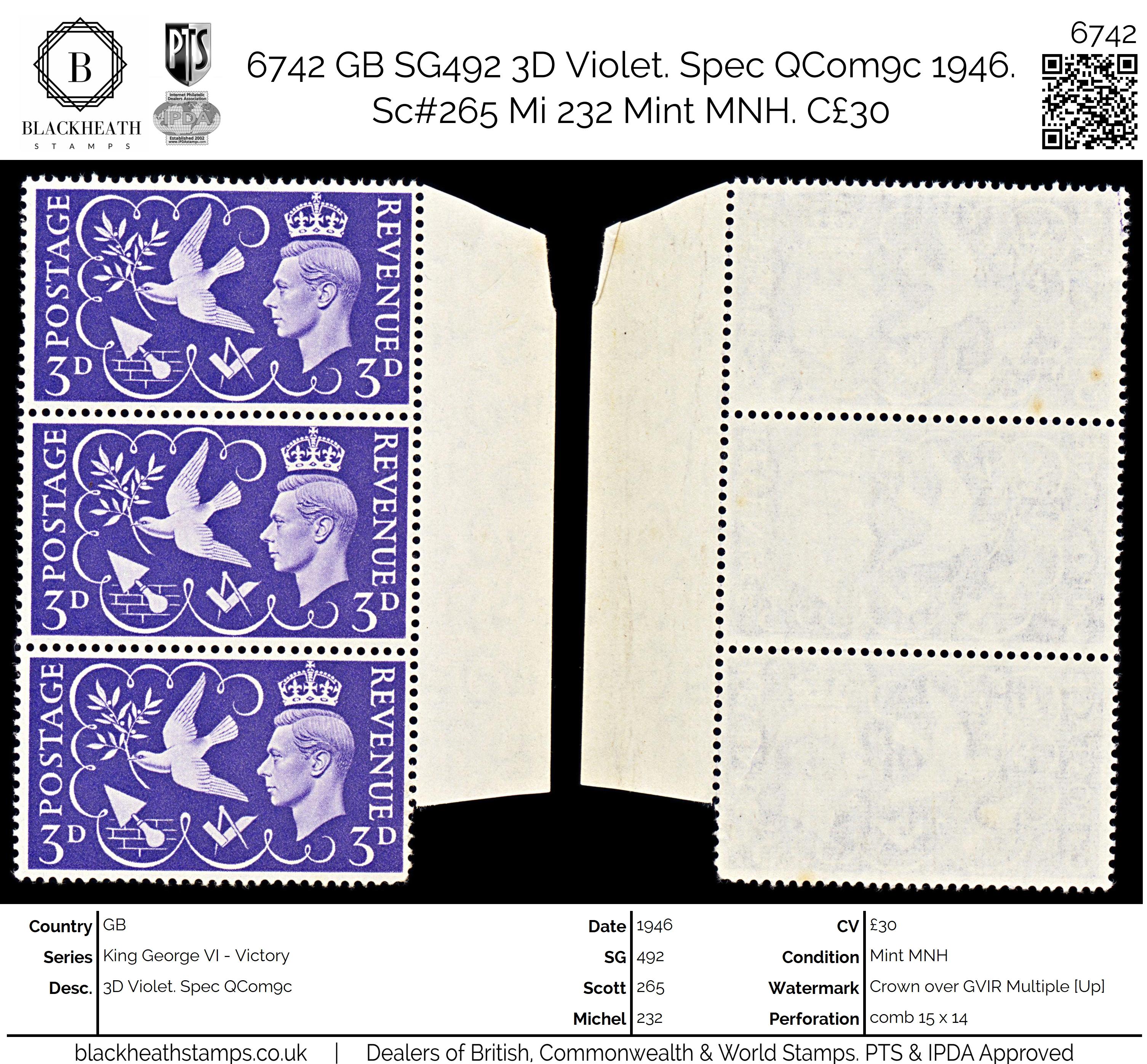 6742 GB SG492 3D Violet. Spec QCom9c 1946. Sc#265 Mi 232 Mint MNH. C£30: Spec QCom9c