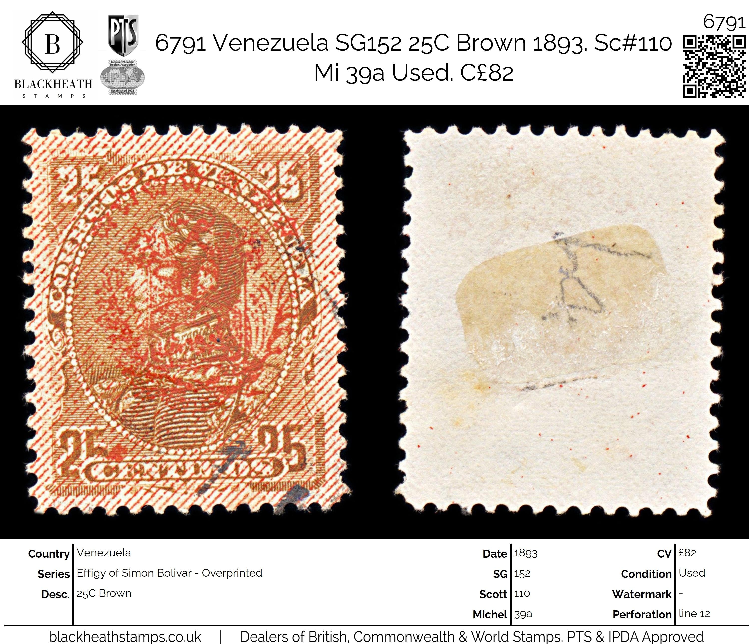 6791 Venezuela SG152 25C Brown 1893. Sc#110 Mi 39a Uséd. C£82: