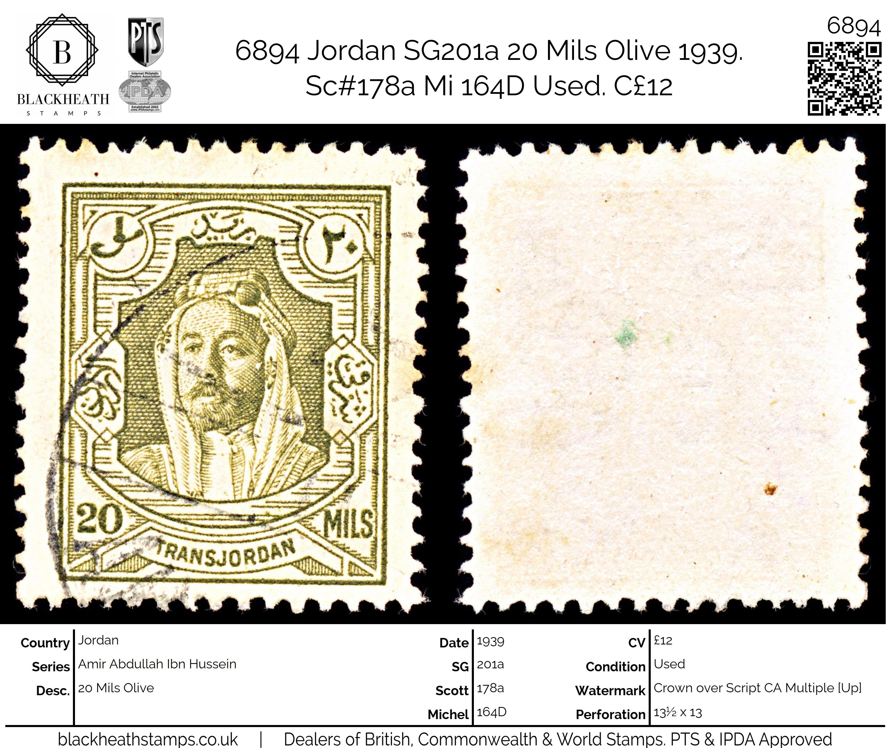 6894 Jordan SG201a 20 Mils Olive 1939. Sc#178a Mi 164D Uséd. C£12: