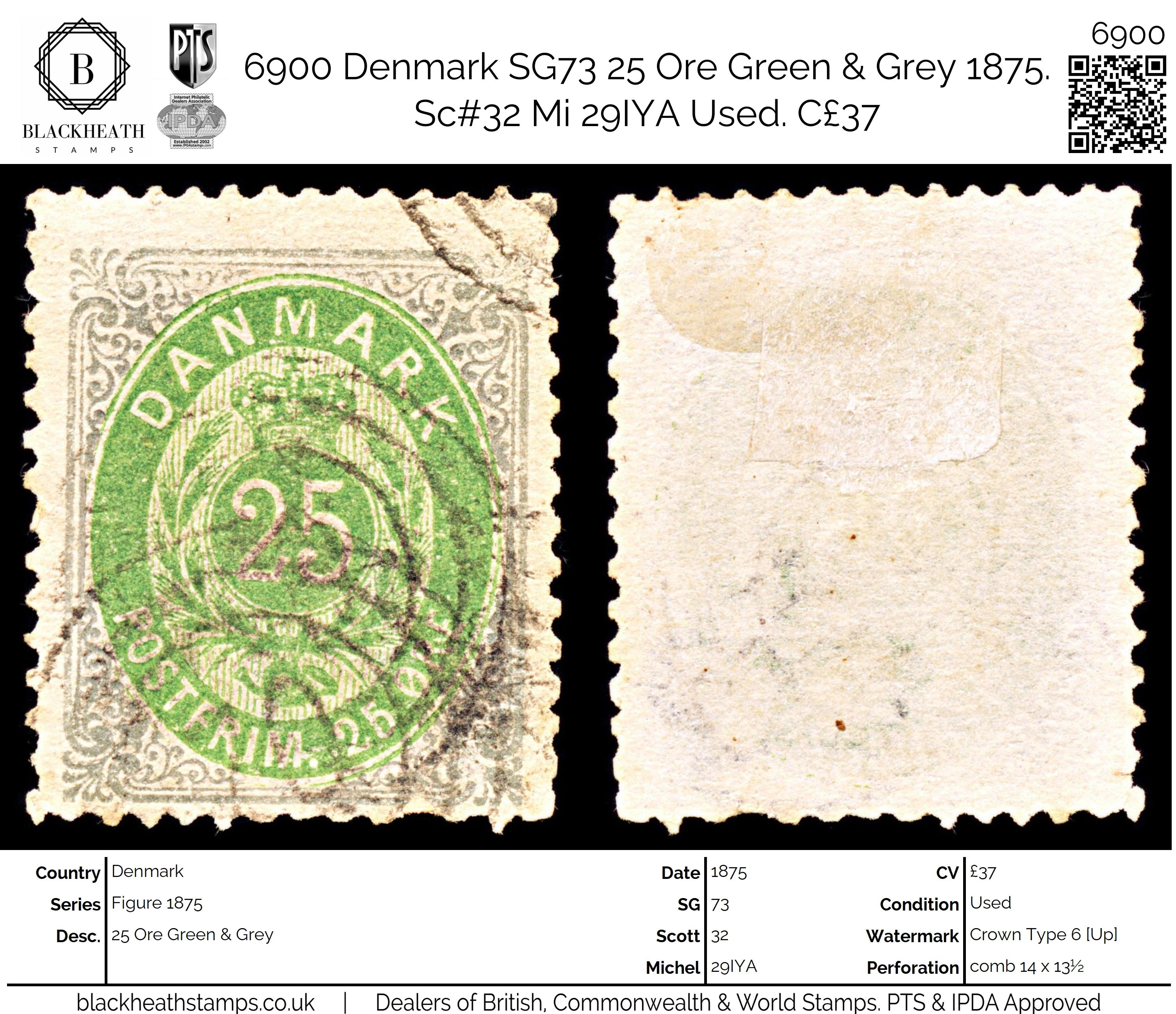 6900 Denmark SG73 25 Ore Green & Grey 1875. Sc#32 Mi 29IYA Used. C£37