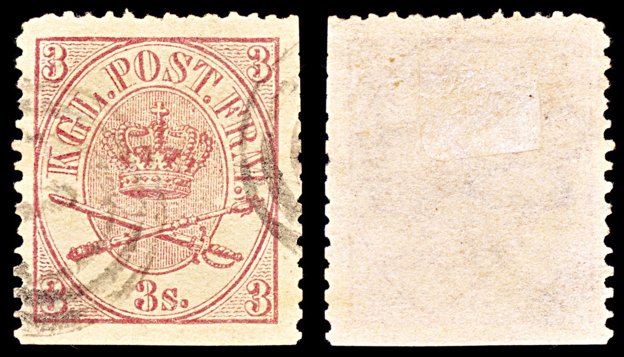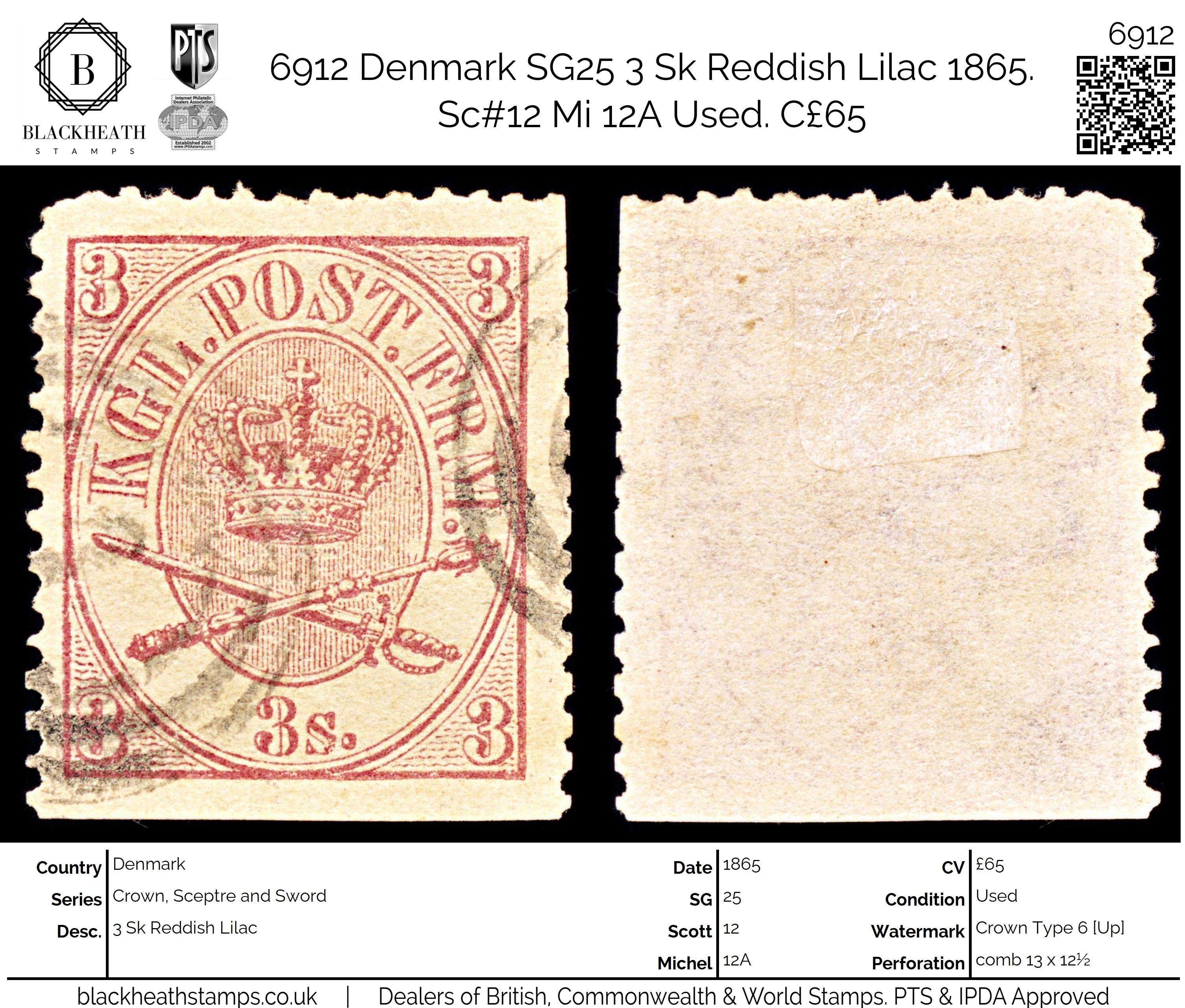 6912 Denmark SG25 3 Sk Reddish Lilac 1865. Sc#12 Mi 12A Uséd. C£65: