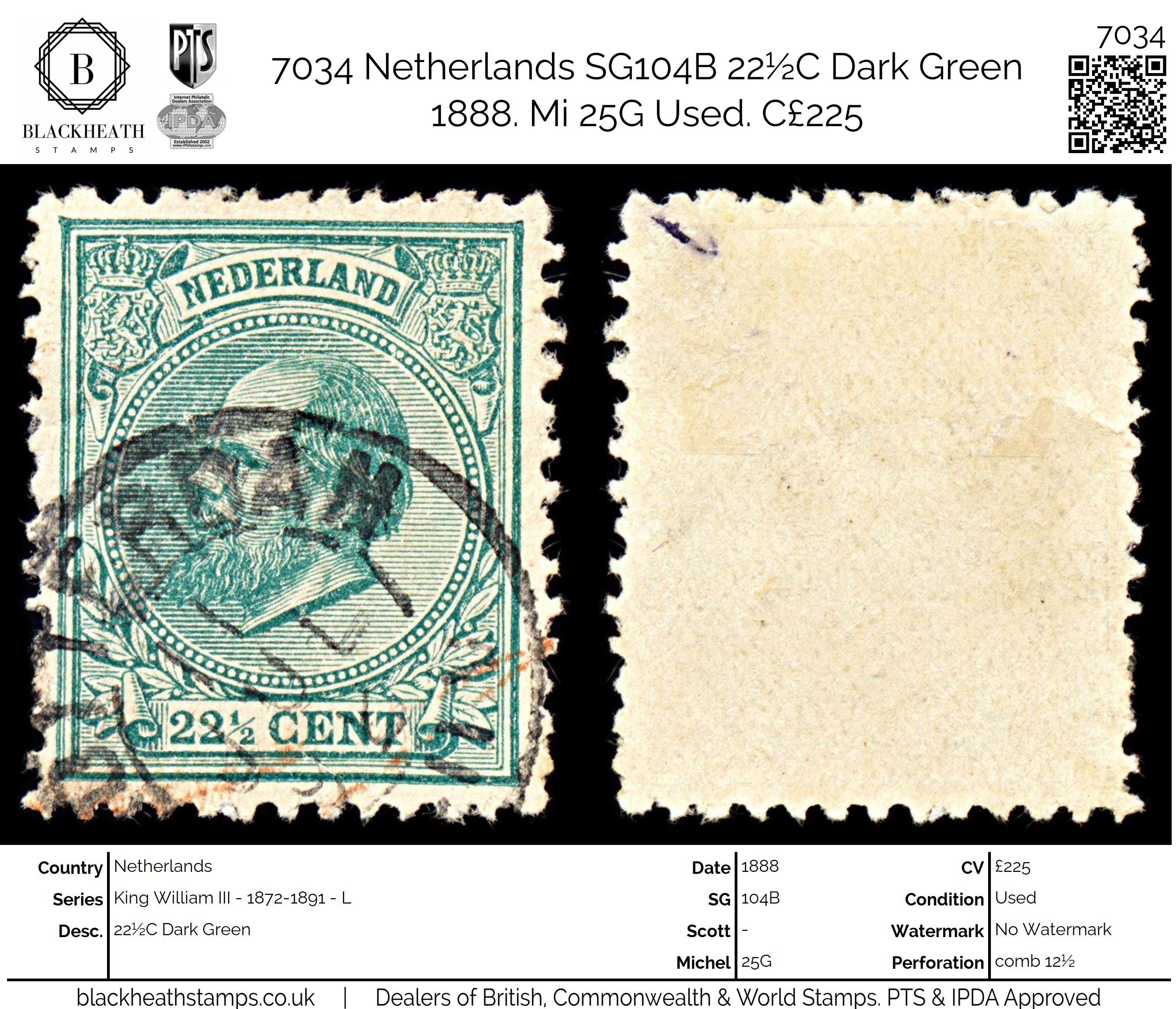 7034 Netherlands SG104B 22½C Dark Green 1888. Mi 25G Used. C£225