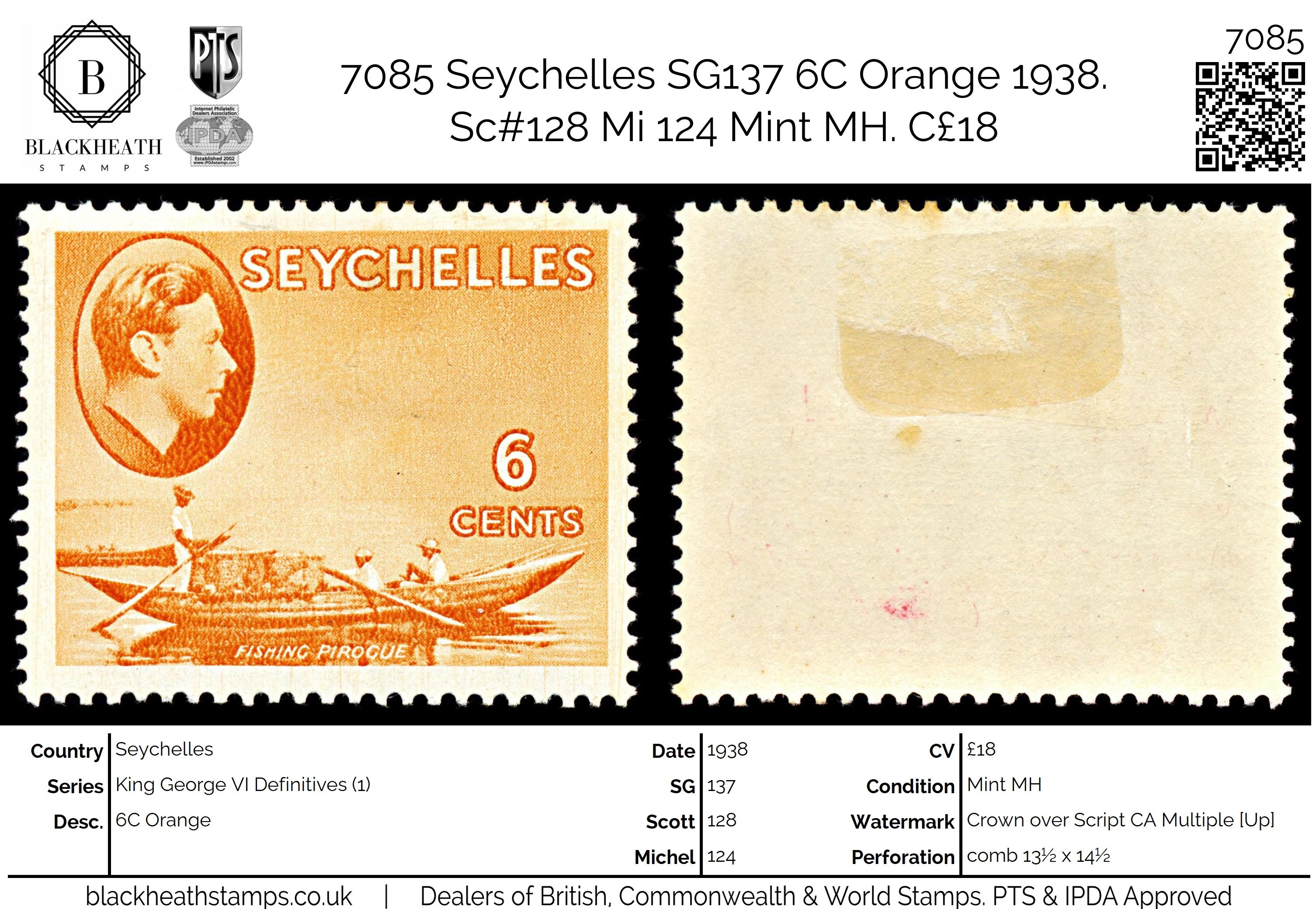 7085 Seychelles SG137 6C Orange 1938. Sc#128 Mi 124 Mint MH. C£18