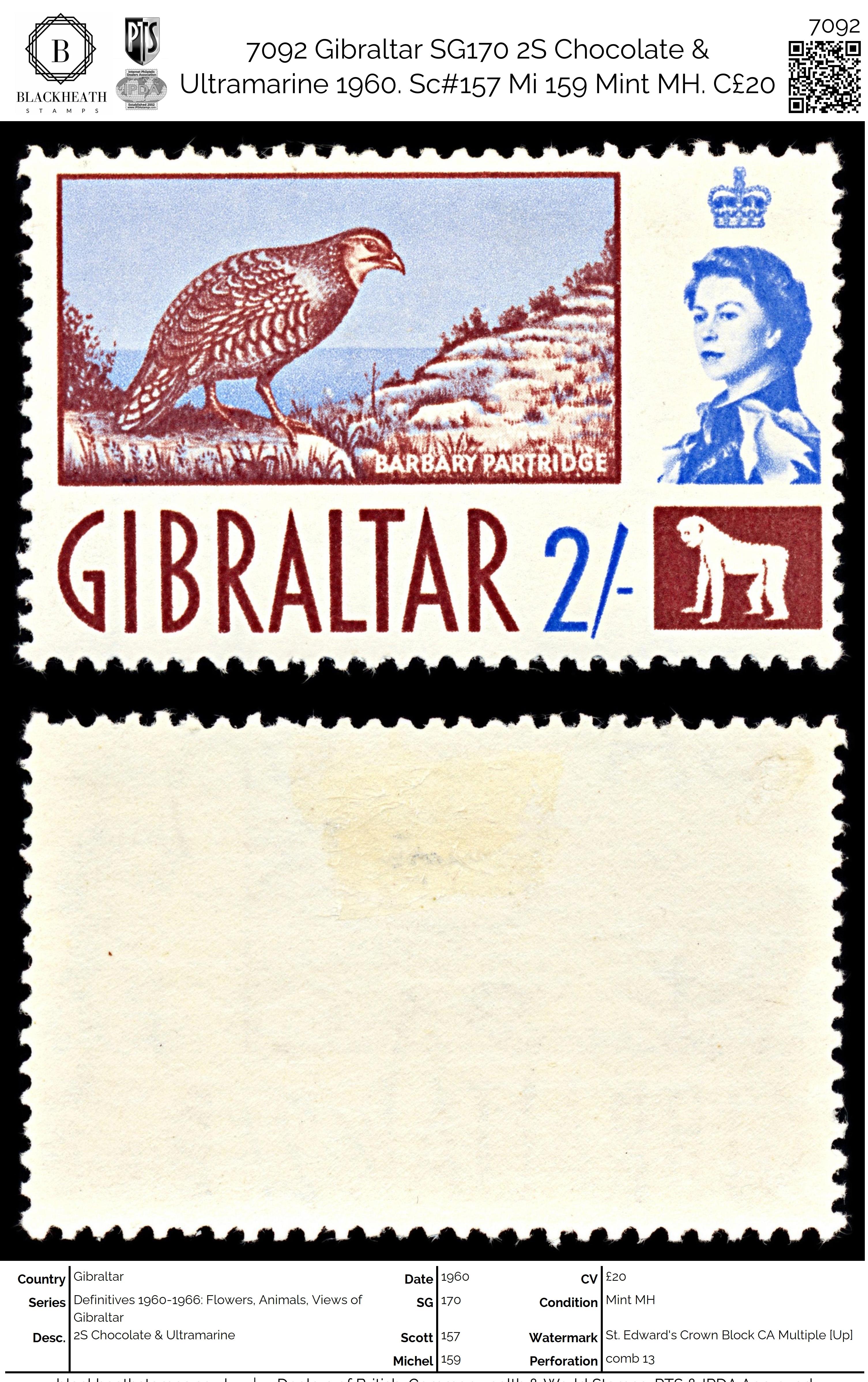 7092 Gibraltar SG170 2S Chocolate & Ultramarine 1960. Sc#157 Mi 159 Mint MH. C£20: