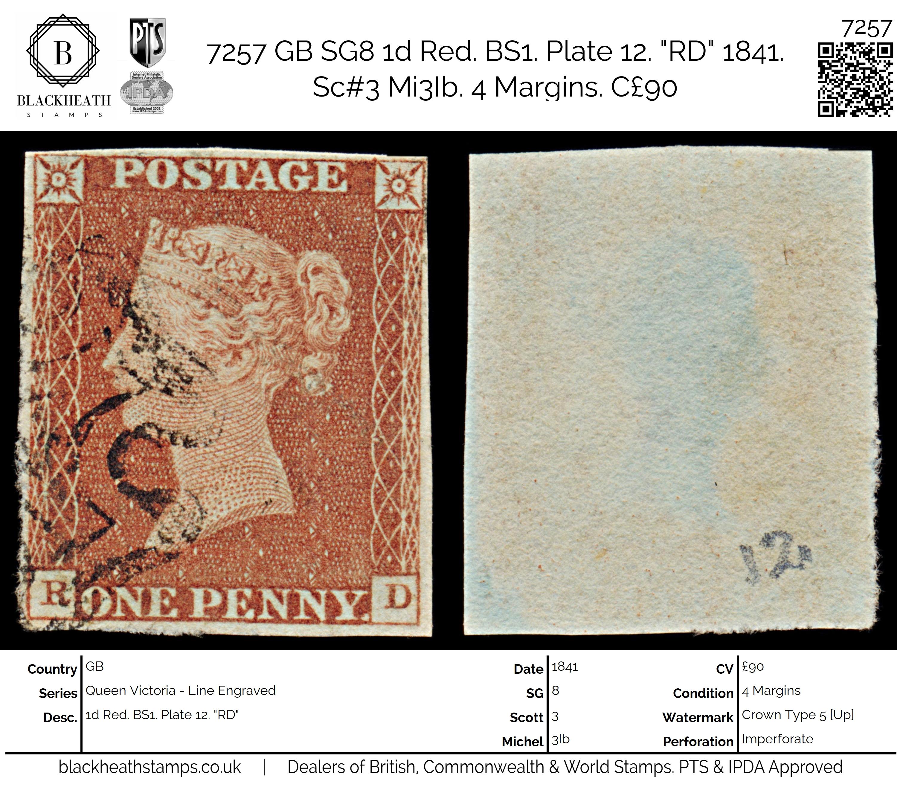 7257 GB SG8 1d Red. BS1. Plate 12. "RD" 1841. Sc#3 Mi3Ib. 4 Margins. C£90: BS1. Plate 12. "RD". 4 Margins