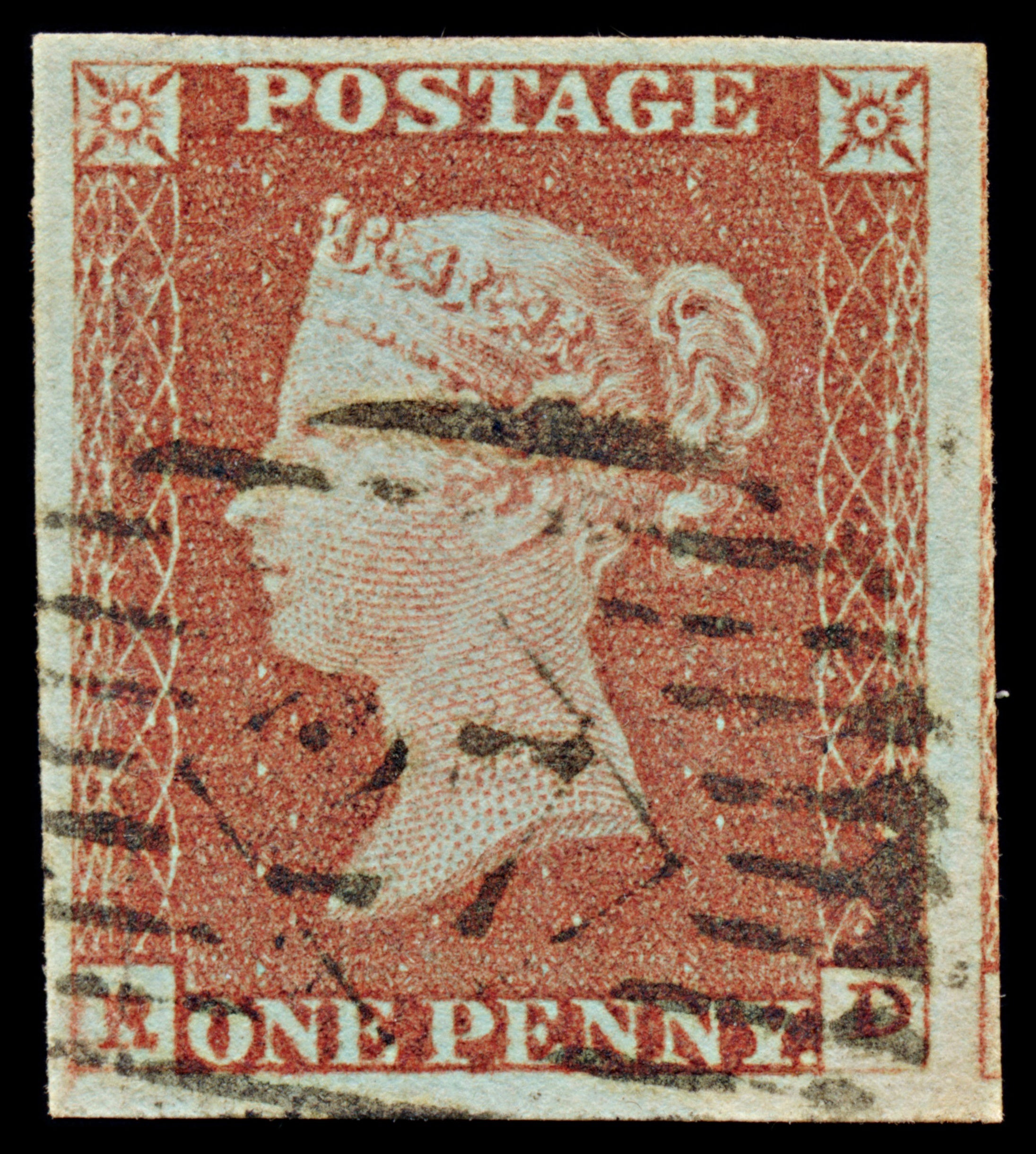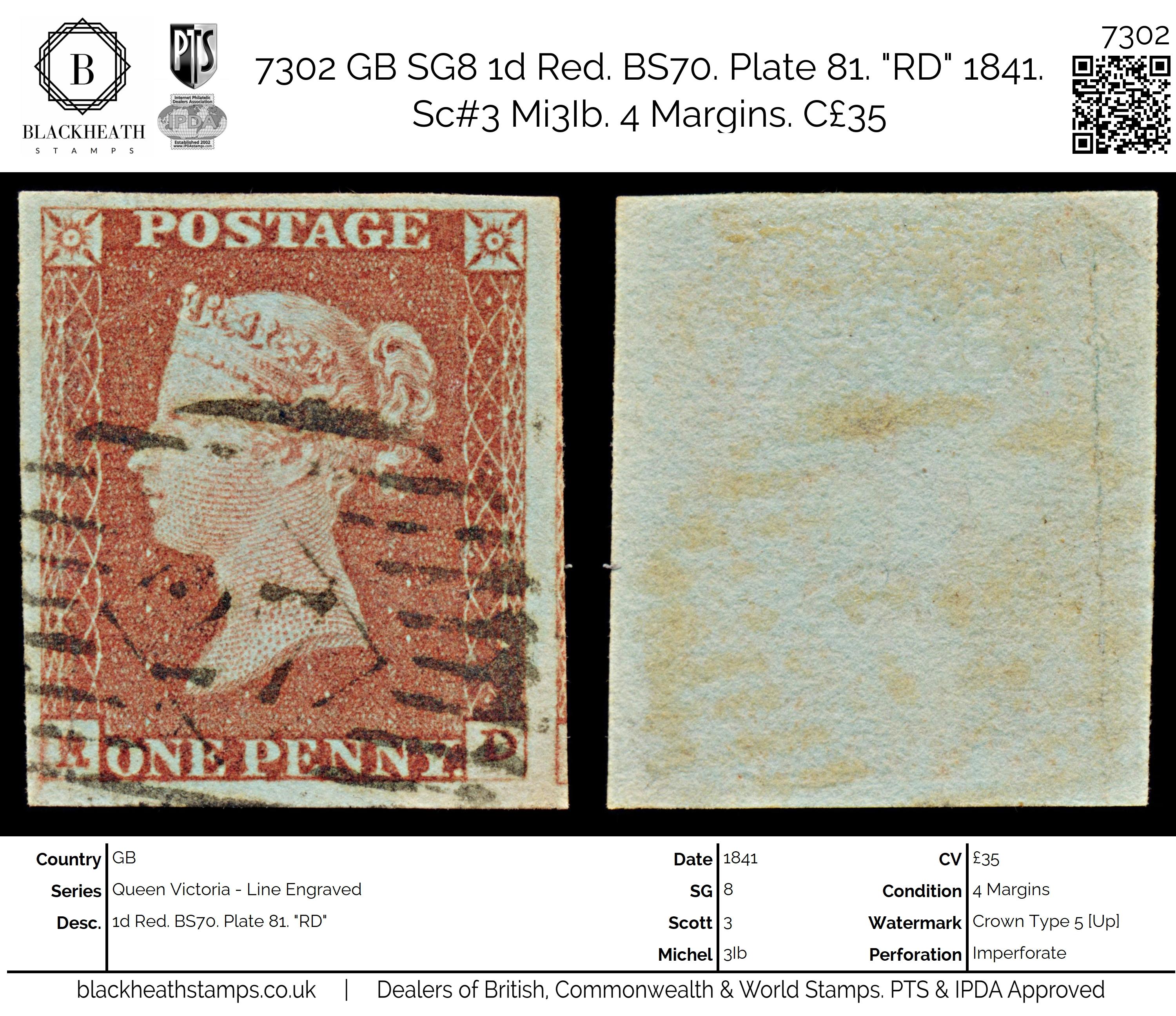 7302 GB SG8 1d Red. BS70. Plate 81. "RD" 1841. Sc#3 Mi3Ib. 4 Margins. C£35: