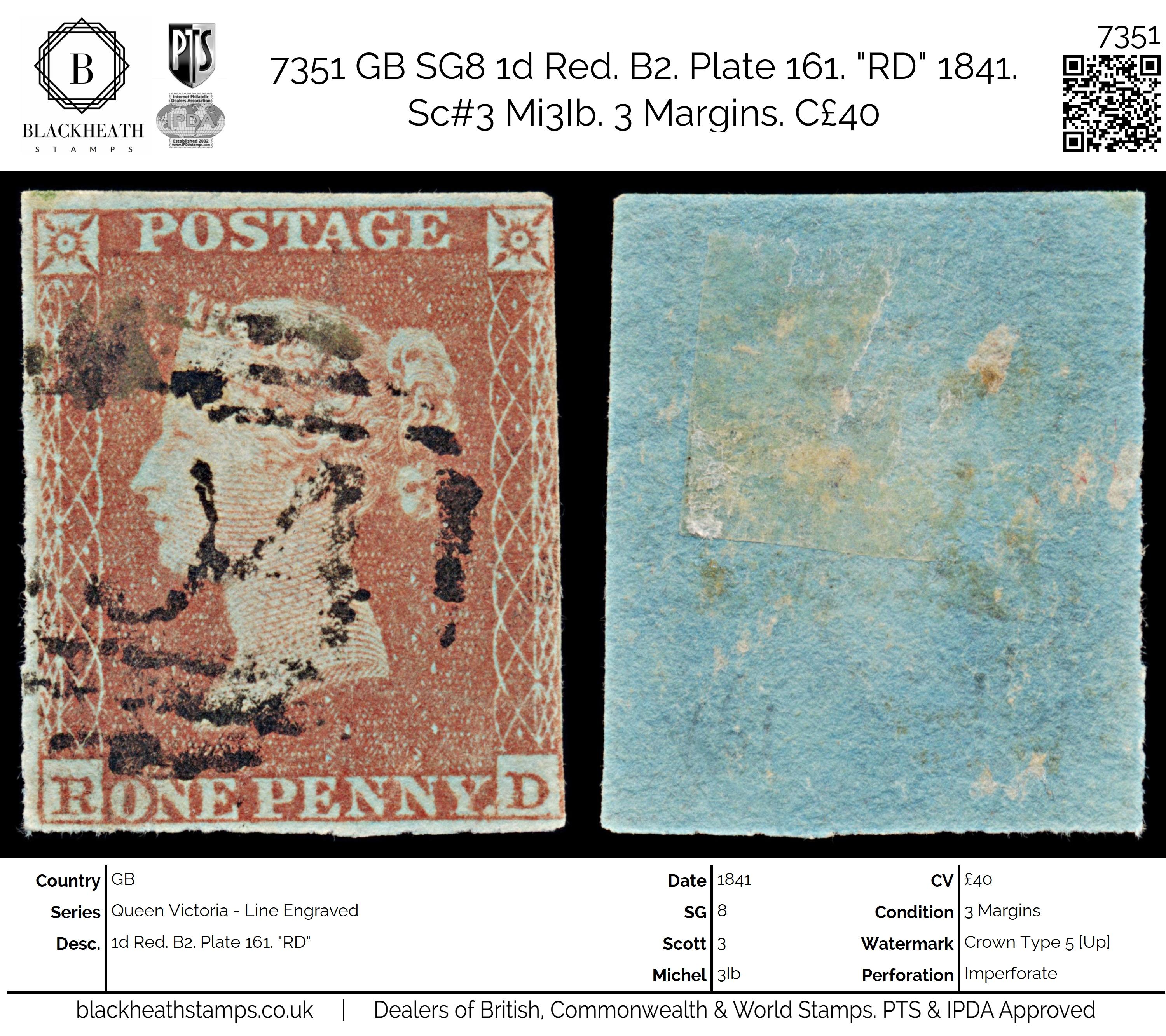 7351 GB SG8 1d Red. B2. Plate 161. "RD" 1841. Sc#3 Mi3Ib. 3 Margins. C£40