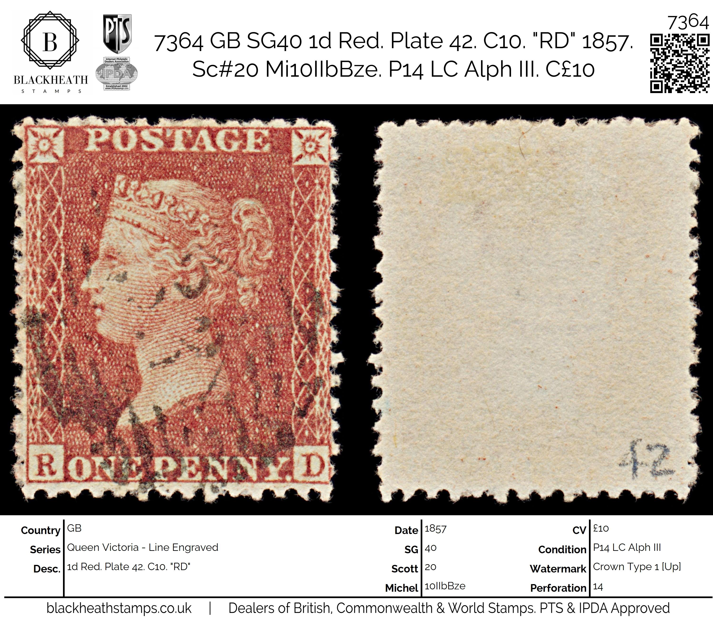 7364 GB SG40 1d Red. Plate 42. C10. "RD" 1857. Sc#20 Mi10IIbBze. P14 LC Alph III. C£10: