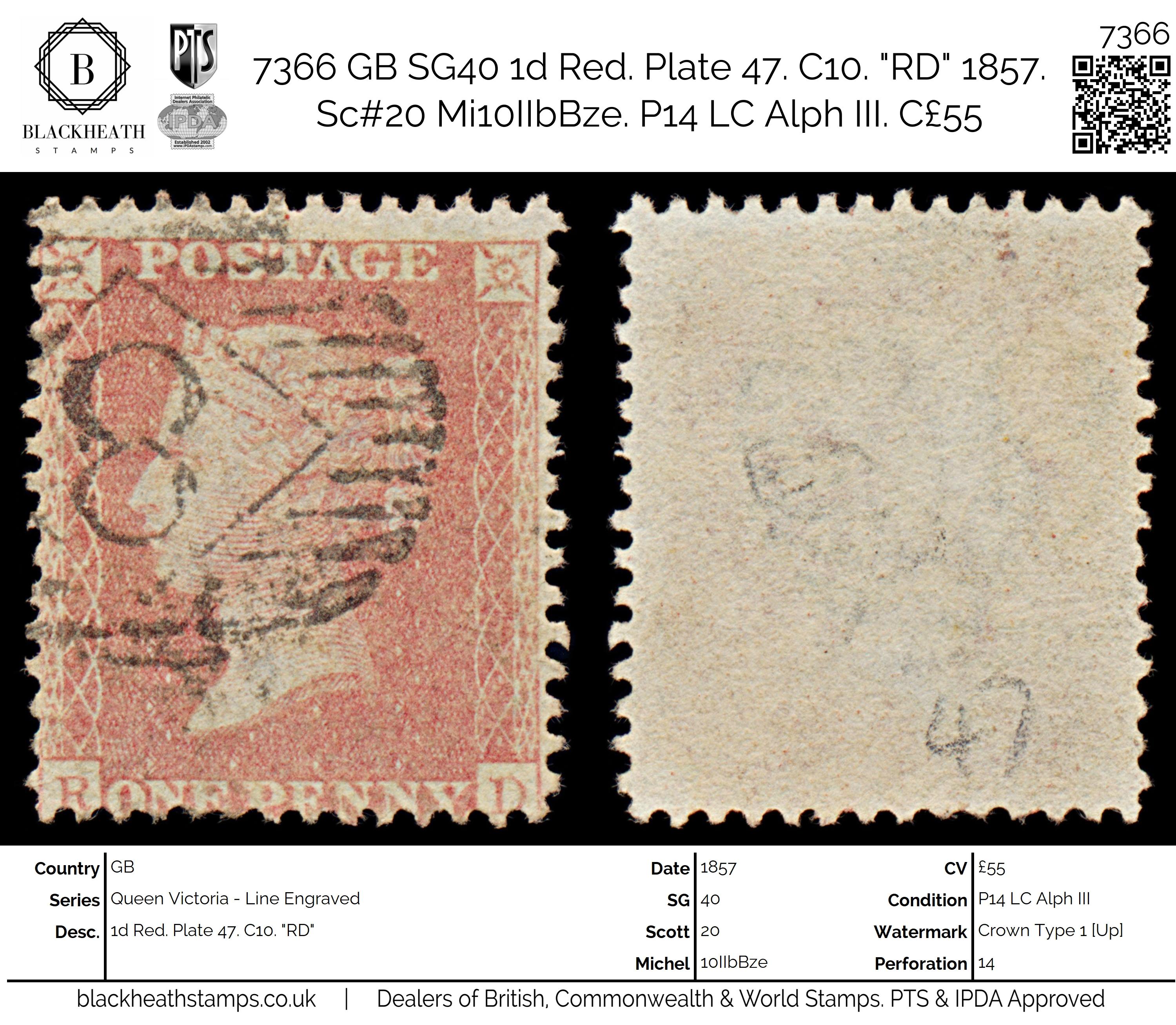 7366 GB SG40 1d Red. Plate 47. C10. "RD" 1857. Sc#20 Mi10IIbBze. P14 LC Alph III. C£55:
