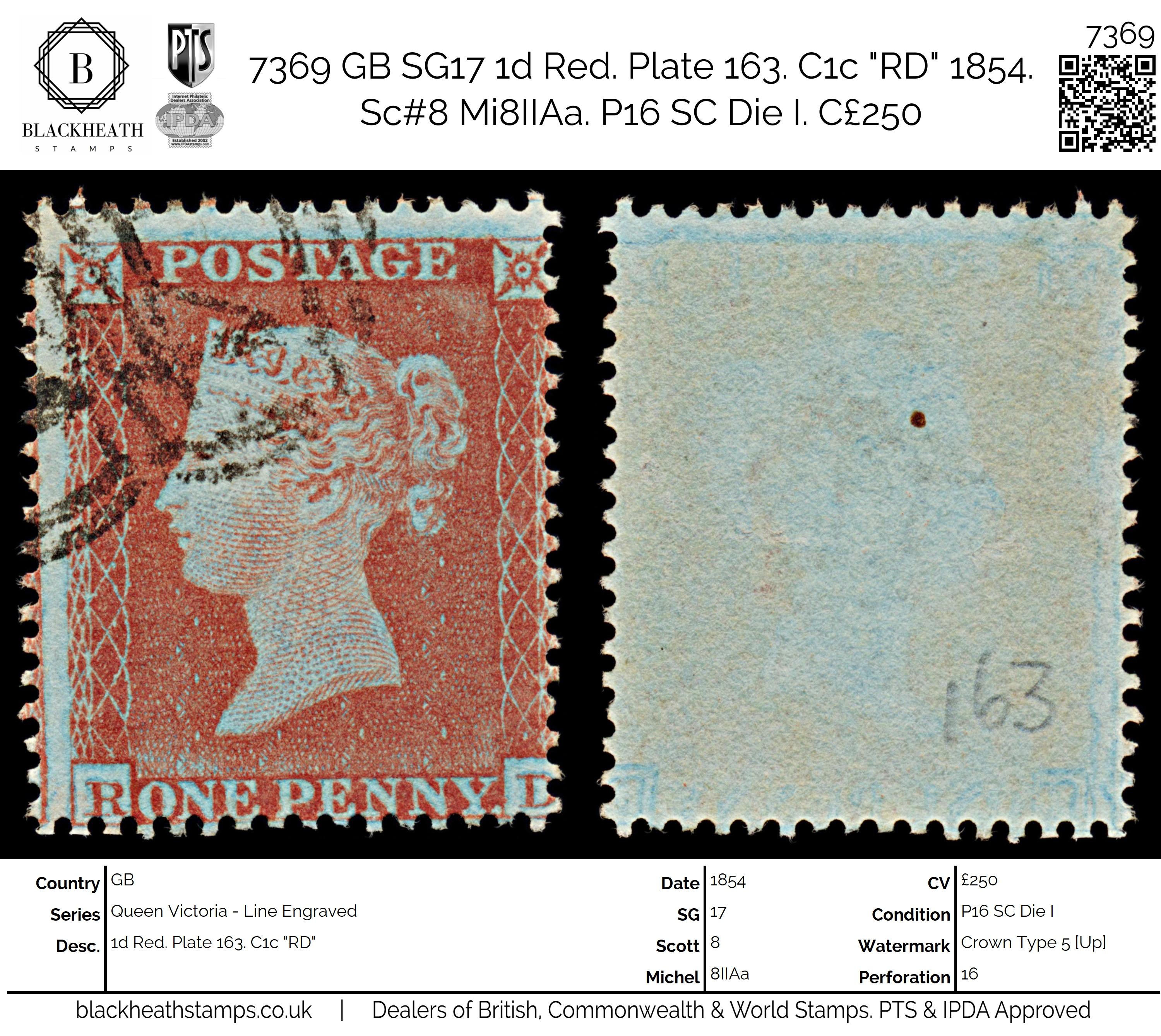 7369 GB SG17 1d Red. Plate 163. C1c "RD" 1854. Sc#8 Mi8IIAa. P16 SC Die I. C£250